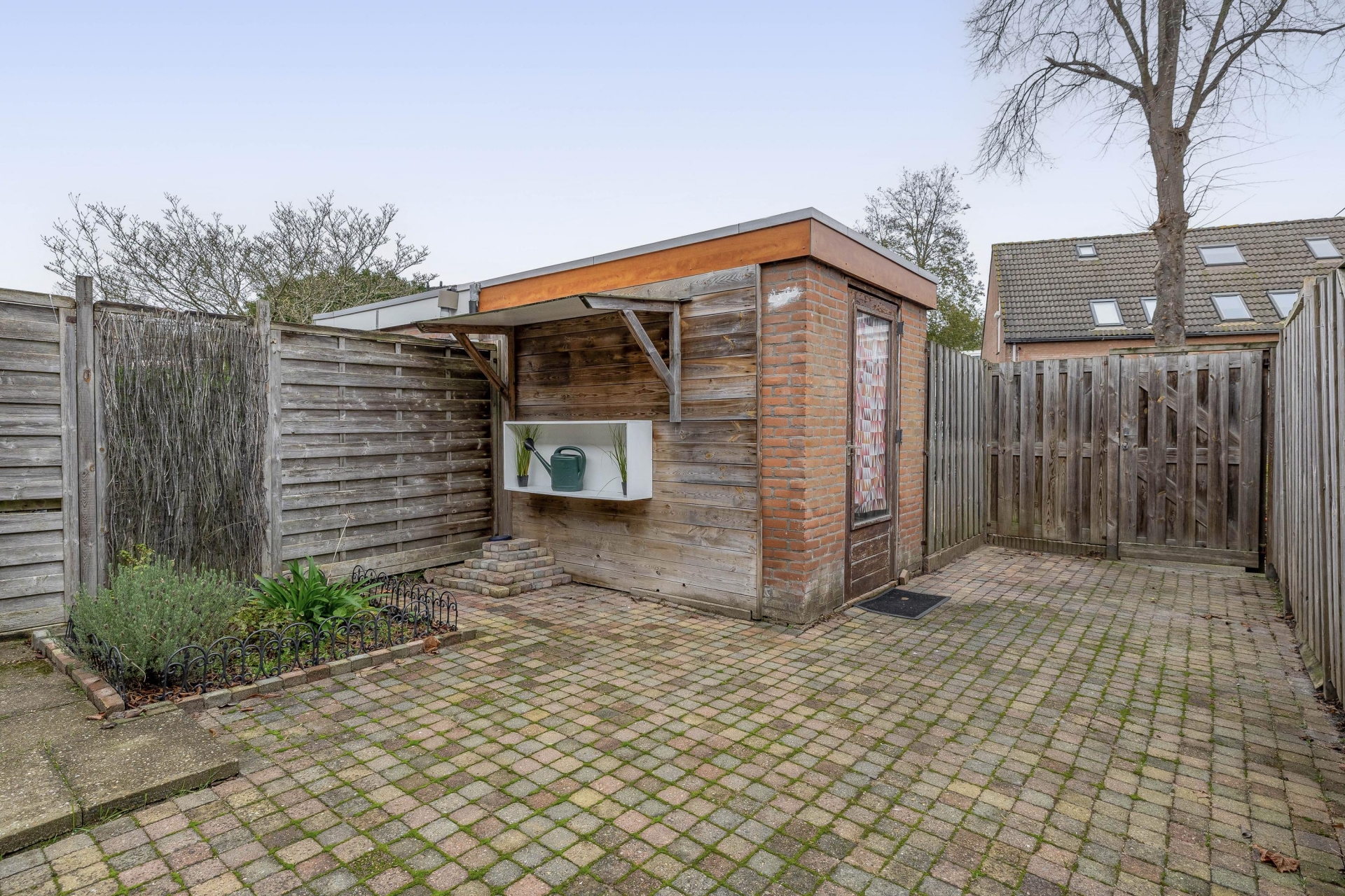 De achtertuin is ongeveer 50 m² groot, netjes aangelegd en voorzien van een achterom. Door de ligging op het noordoosten heb je hier in de ochtend en vroege middag zon – ideaal voor een ontbijtje in de buitenlucht. De tuin grenst aan een groenstrook, waardoor je extra veel privacy ervaart. In de vrijstaande stenen berging is plek voor fietsen en tuinspullen. Aan de voorzijde van het huis is er zicht op een speeltuintje en veel openbaar groen – een fijne plek voor kinderen en prettig voor het straatbeeld.