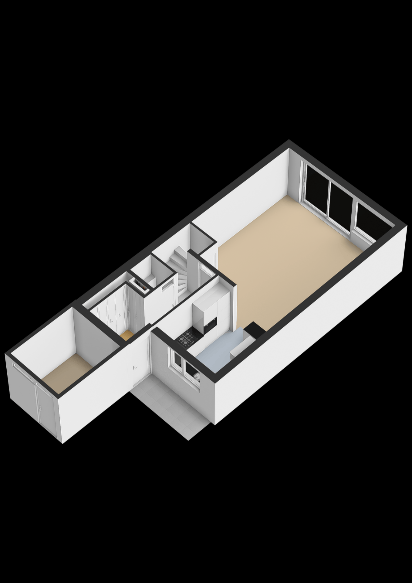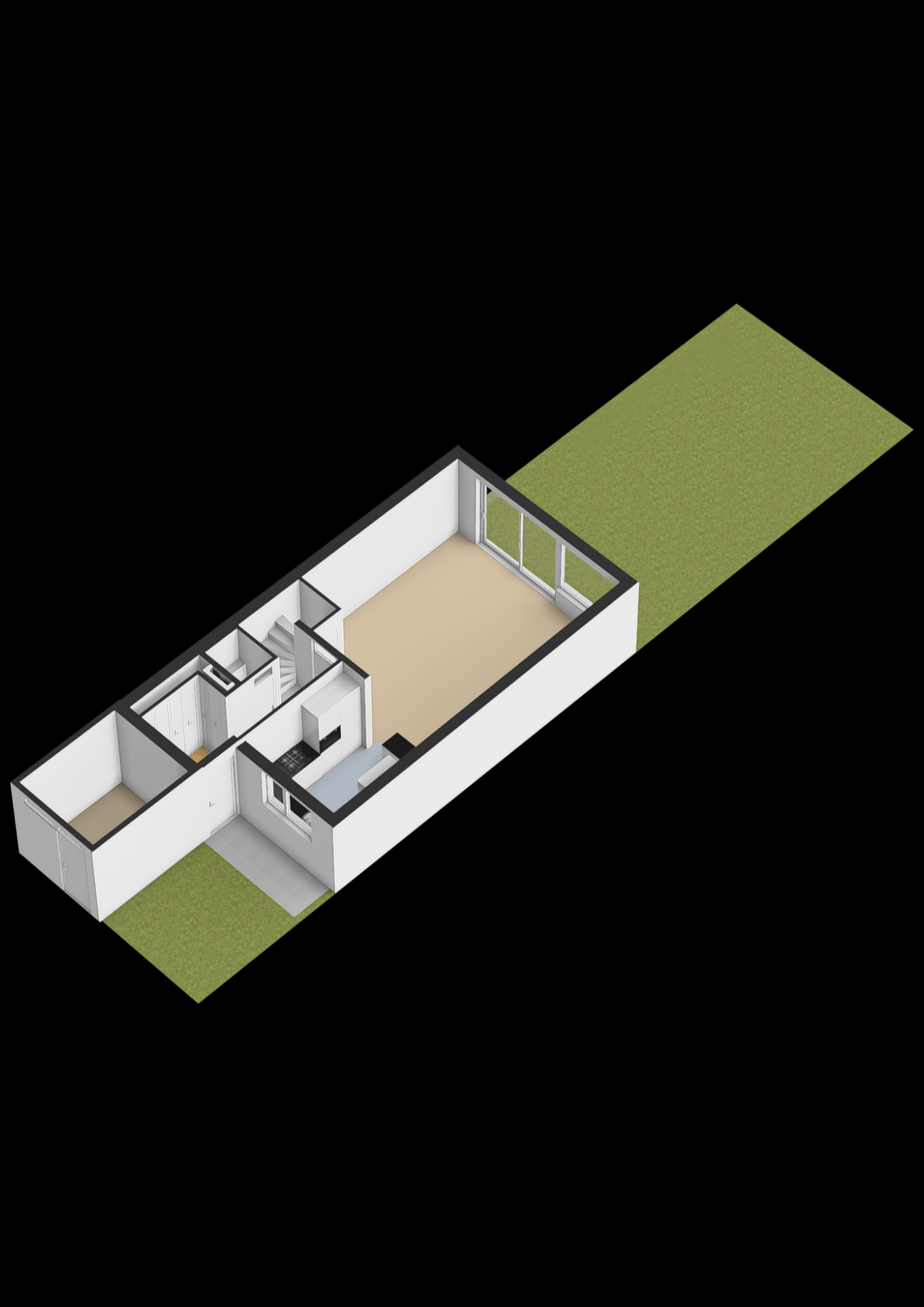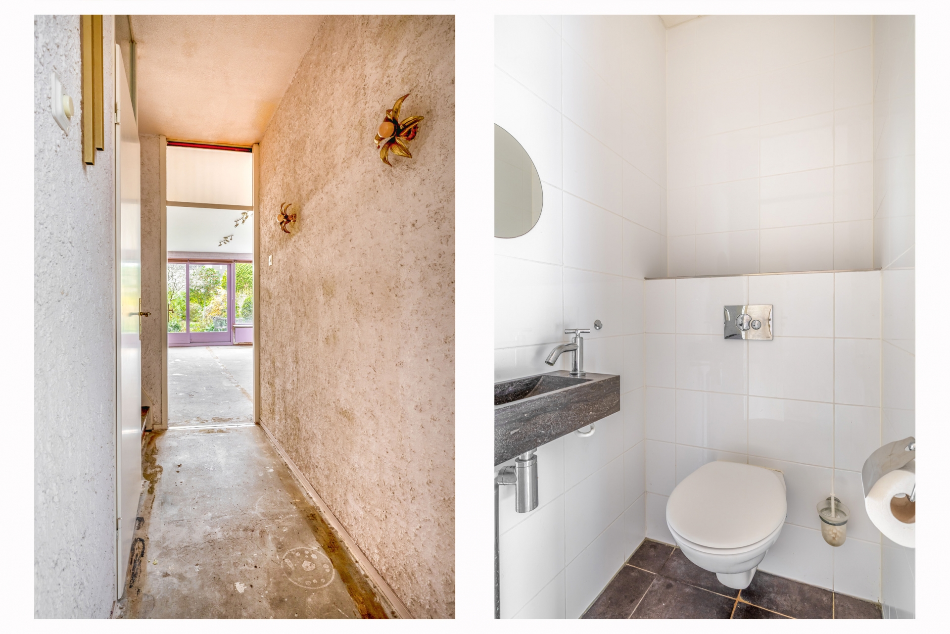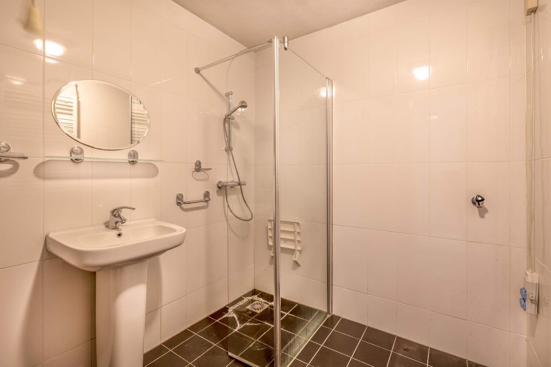 Bij binnenkomst kom je via de hal met modern toilet in de lichte woonkamer van circa 30 m². Deze ruimte heeft een prettige indeling en staat dankzij grote raampartijen direct in verbinding met de tuin. De achterpui is vrijwel volledig van glas en zorgt voor veel daglicht én zicht op het groen. De keuken bevindt zich aan de voorzijde van het huis, in een praktische hoekopstelling met diverse inbouwapparatuur. De stijl is eenvoudig en functioneel – een mooie basis om eventueel naar eigen smaak te moderniseren.