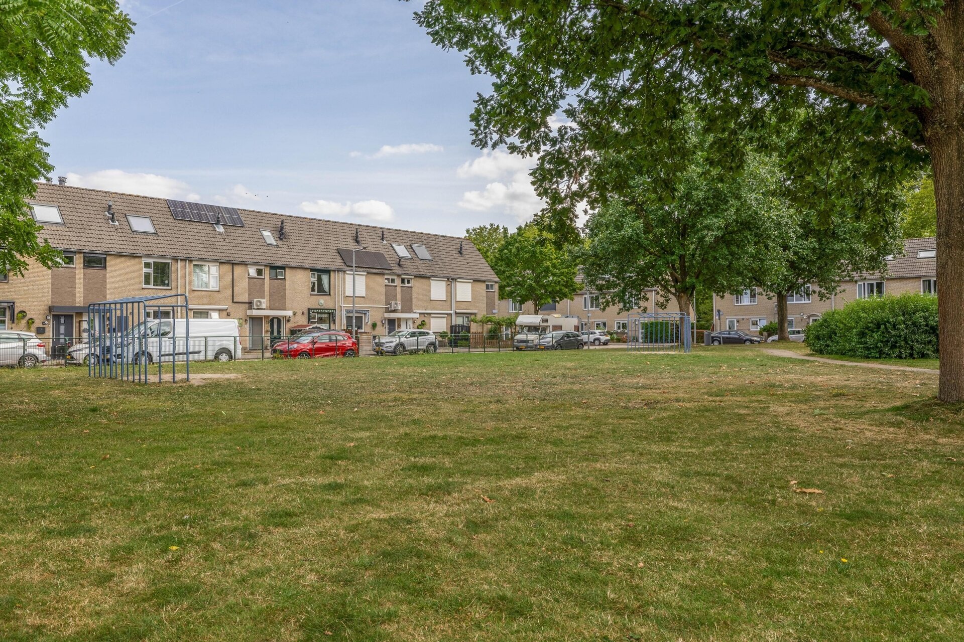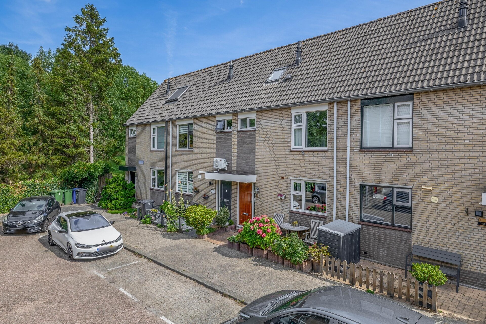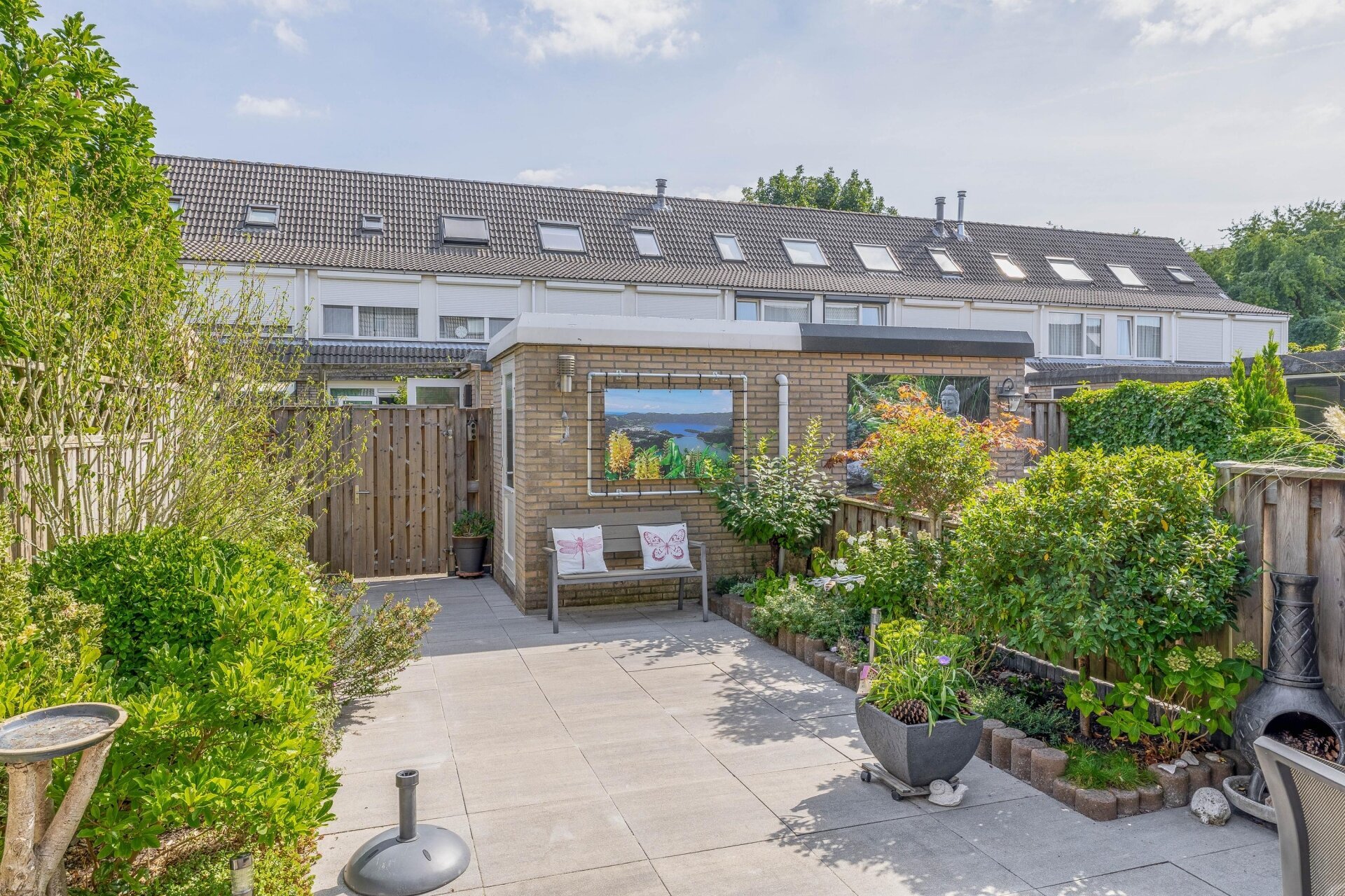 De zonnige achtertuin op het zuidoosten is met zorg aangelegd. Hier geniet je van privacy, rust en ruimte. De tuin is voorzien van nette bestrating, groenborders en een ruime stenen berging met betonnen plafond – ideaal voor fietsen en opslag. De voortuin is eveneens verzorgd en geeft het huis een vriendelijke uitstraling. Dankzij de ligging aan een doodlopende straat ervaar je hier veel rust, terwijl voorzieningen als winkels, scholen en OV allemaal op loopafstand zijn.