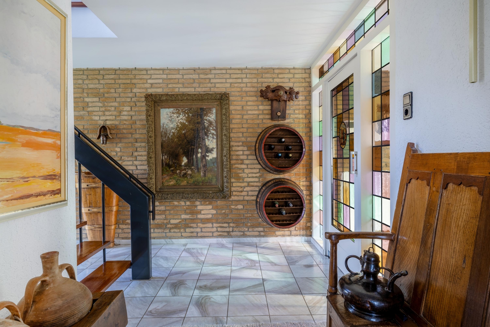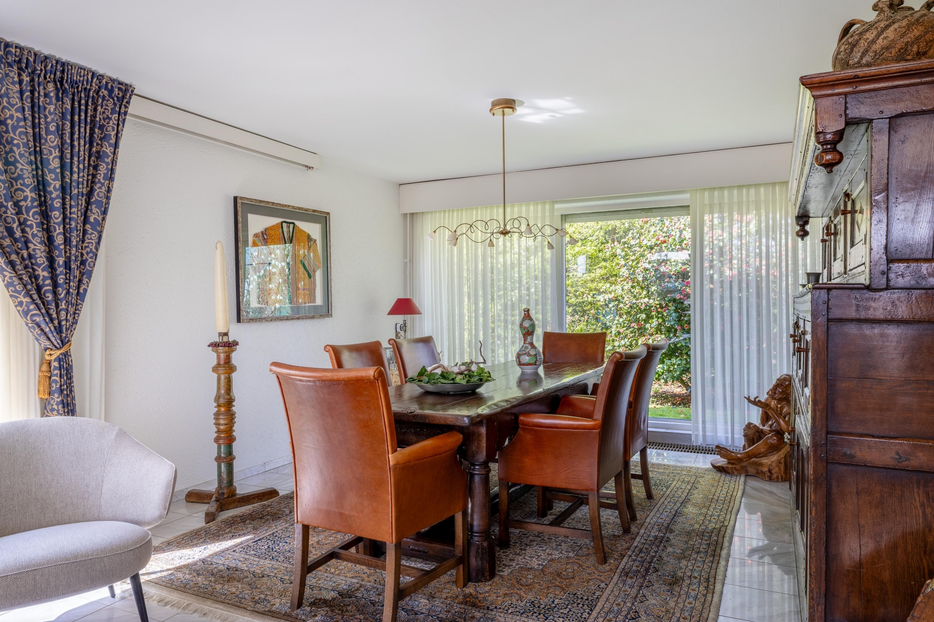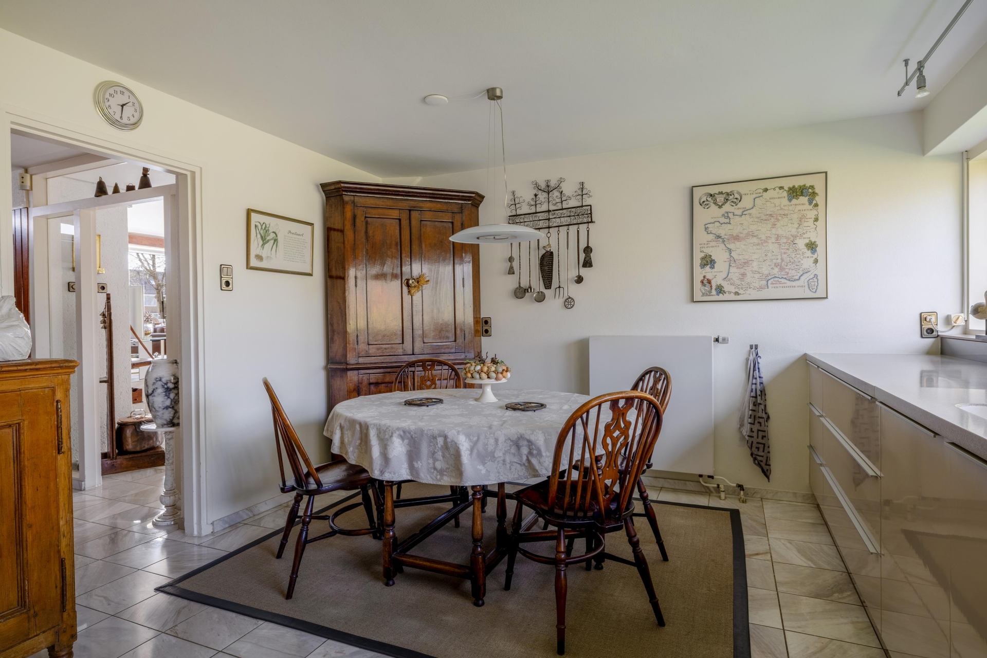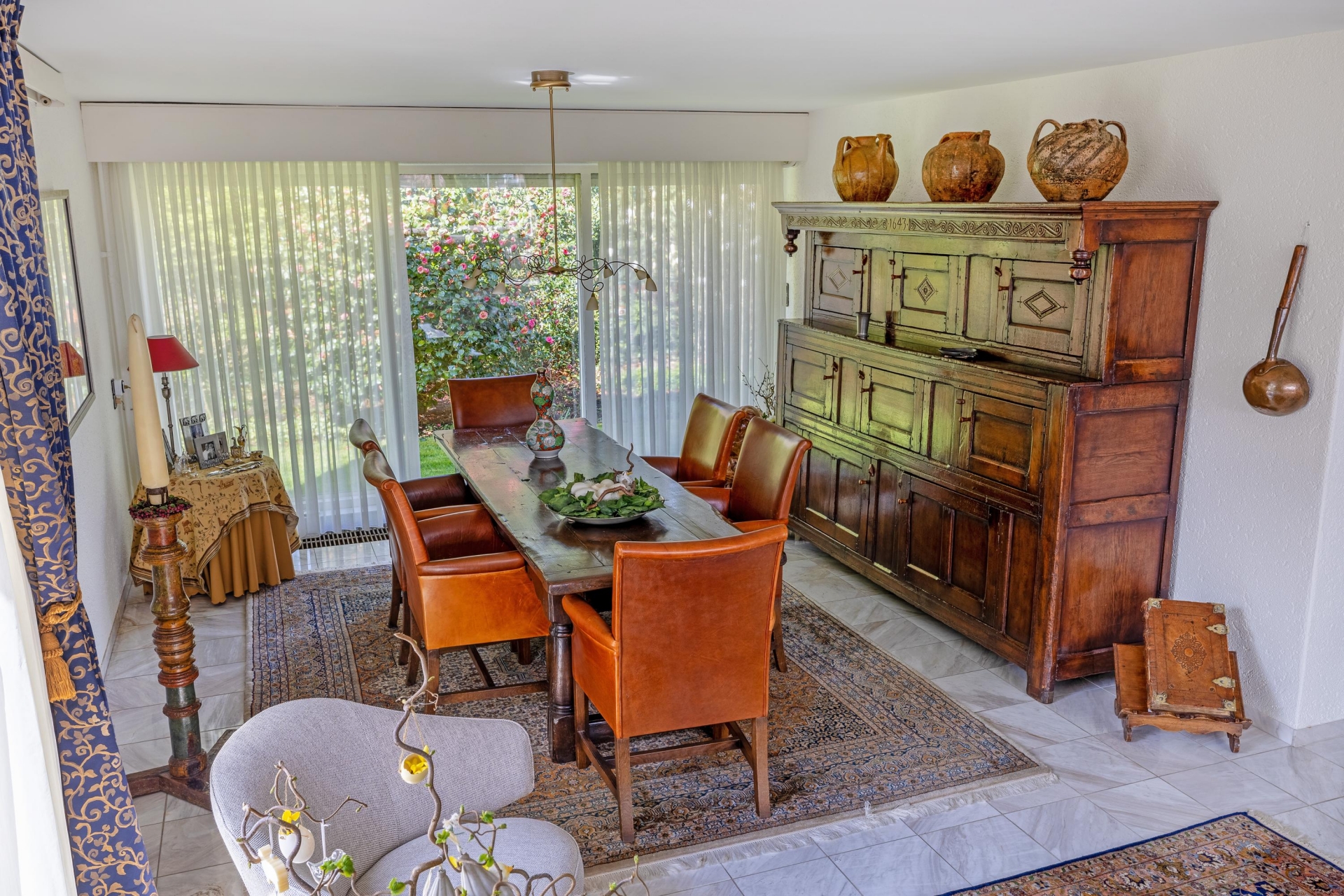 De marmeren vloer met vloerverwarming in het leefgedeelte zorgt niet alleen voor comfort, maar ook voor een verzorgde en tijdloze uitstraling. Dit is een plek waar je zowel groots kunt ontvangen als rustig kunt genieten van het uitzicht en de ruimte om je heen.