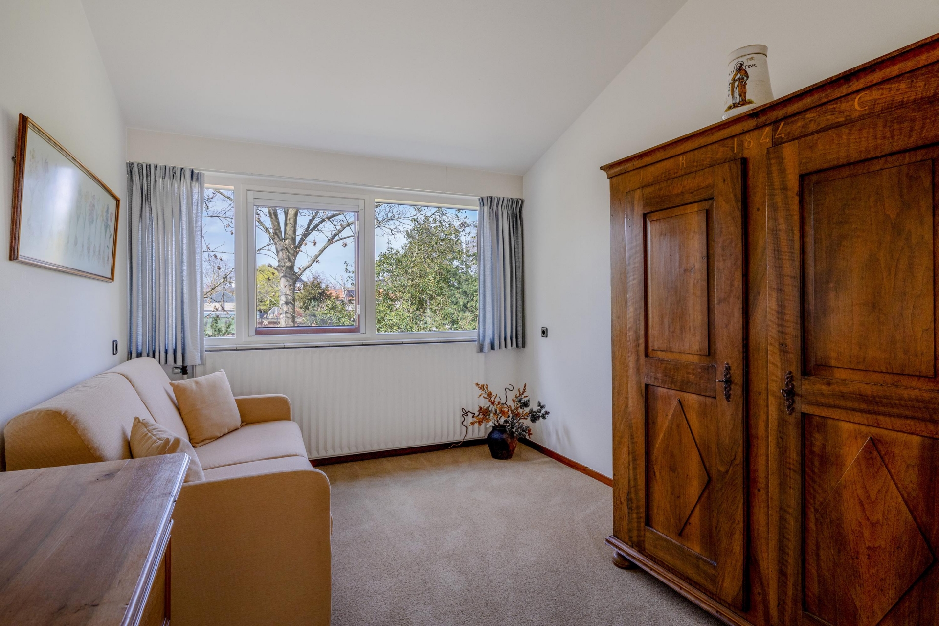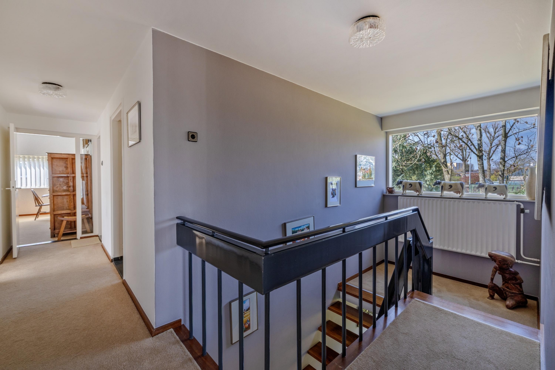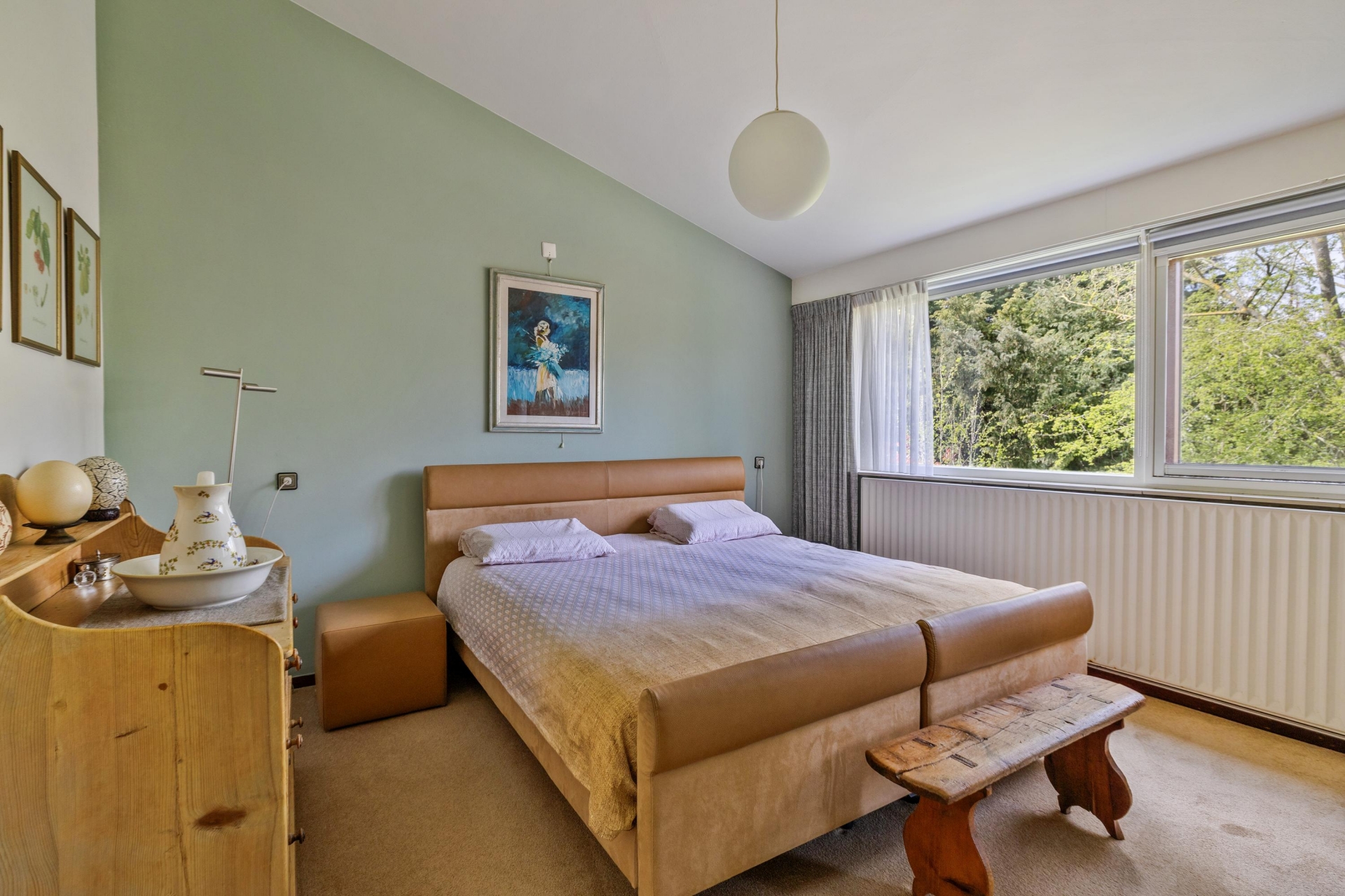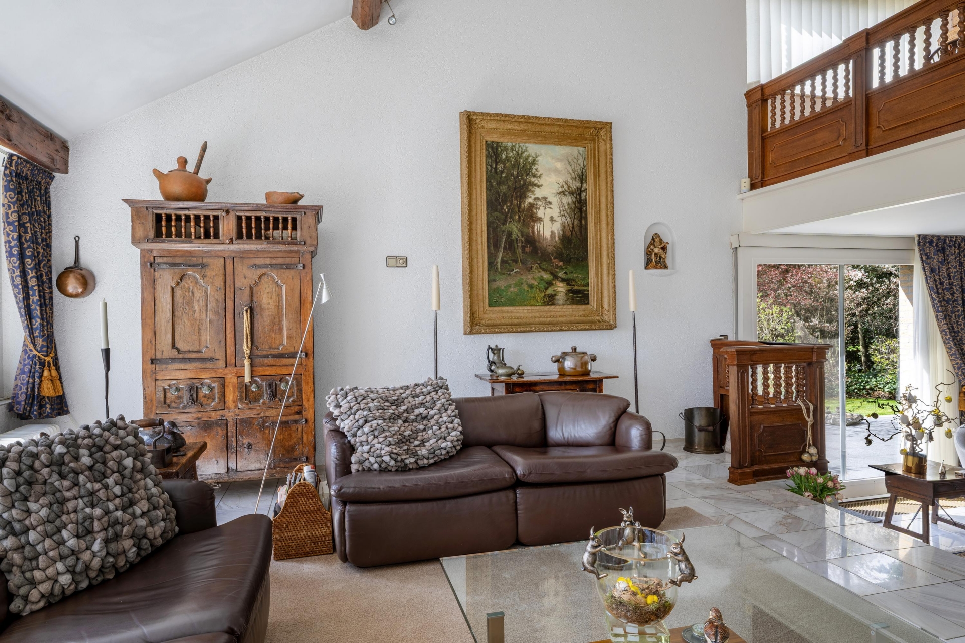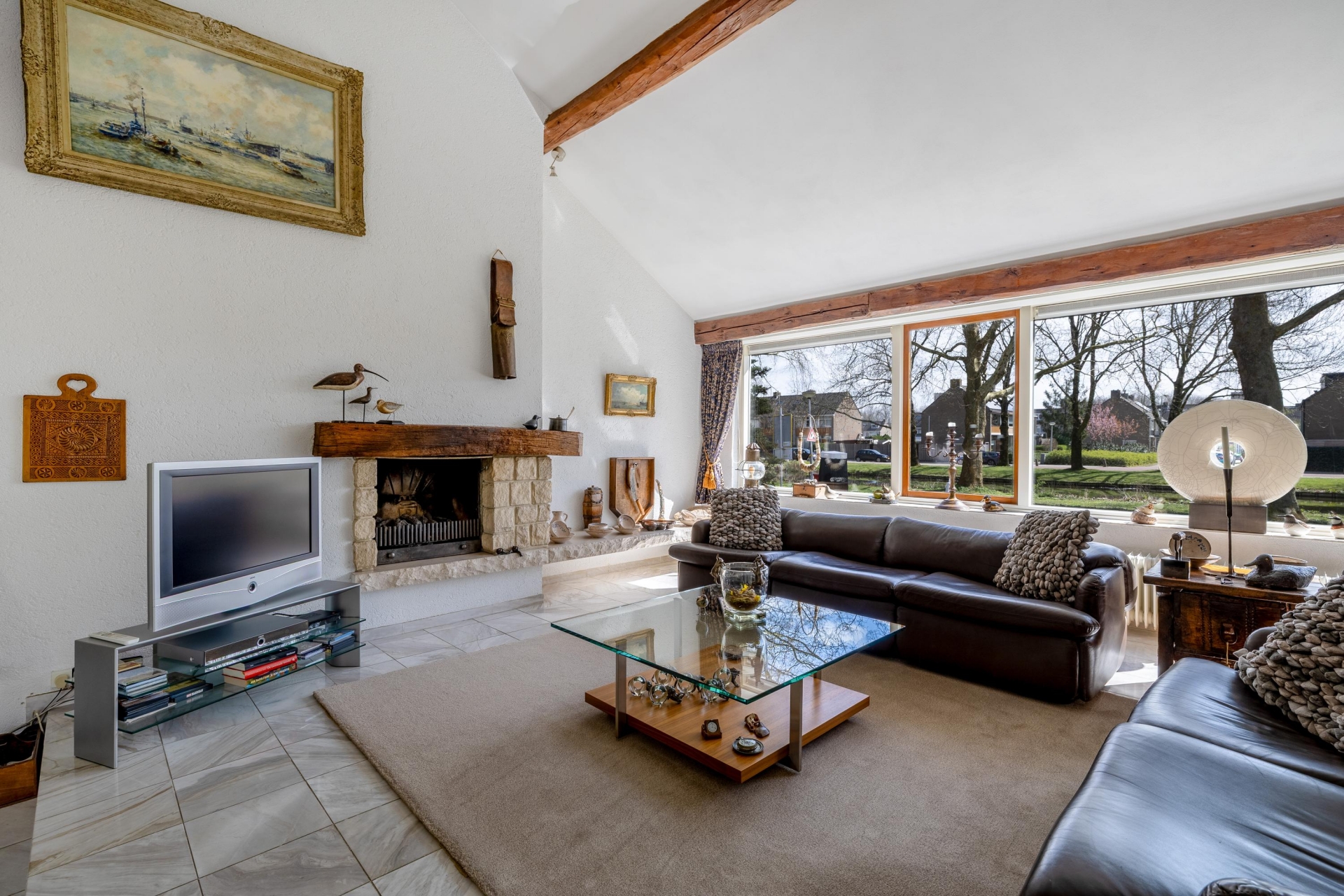 De grote raampartijen trekken het groen als het ware naar binnen en zorgen voor een prachtige lichtinval gedurende de dag. Vanuit de zithoek heb je een vrij uitzicht naar buiten, wat het gevoel van ruimte nog eens versterkt. De haard vormt een sfeervol middelpunt en maakt deze ruimte compleet.