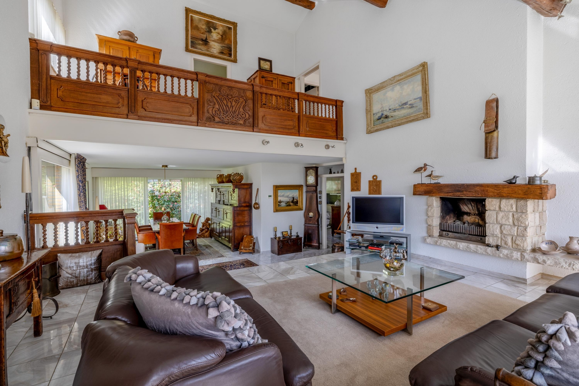 Speelse woonkamer met vide, haard en niveauverschil