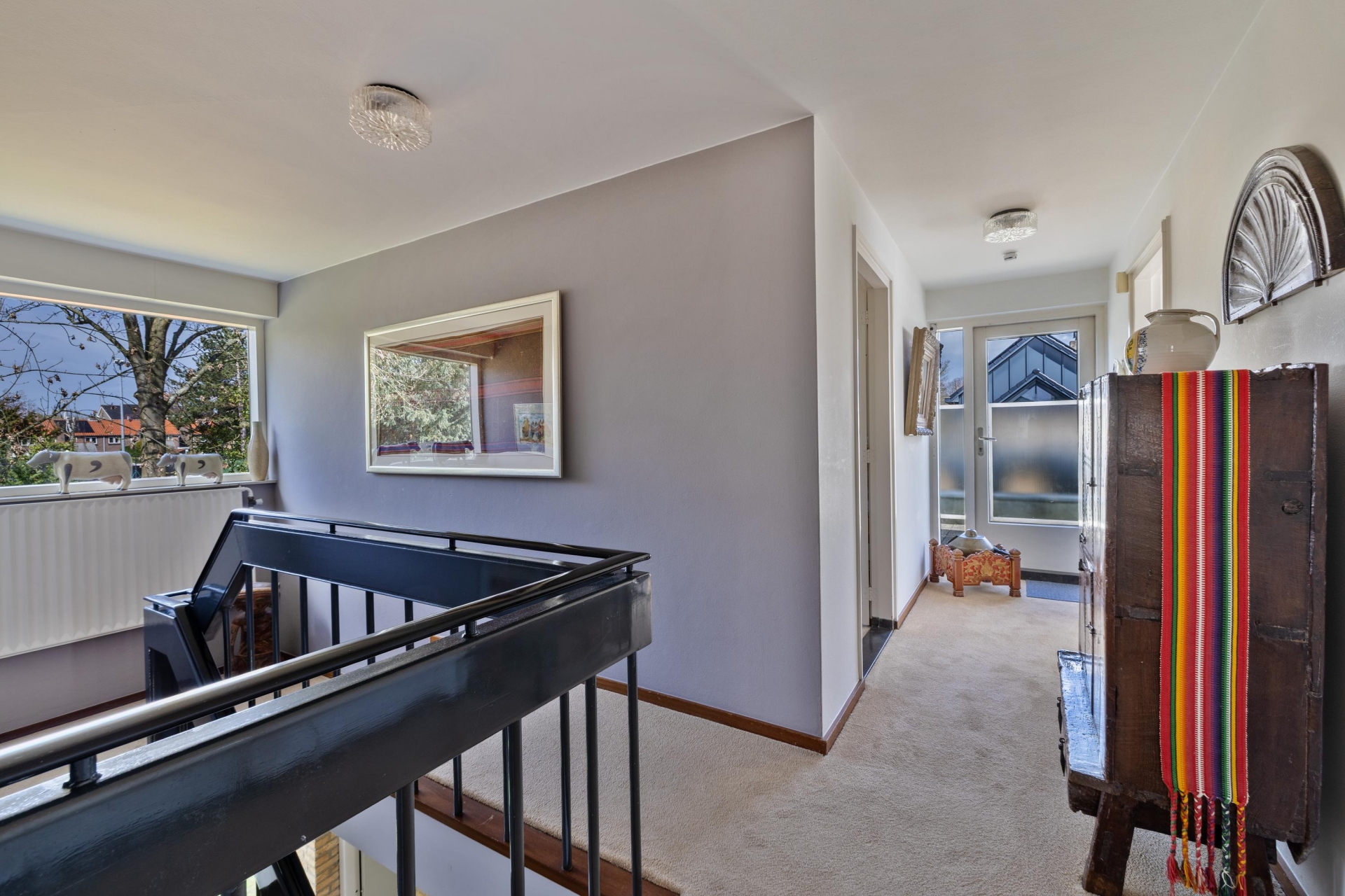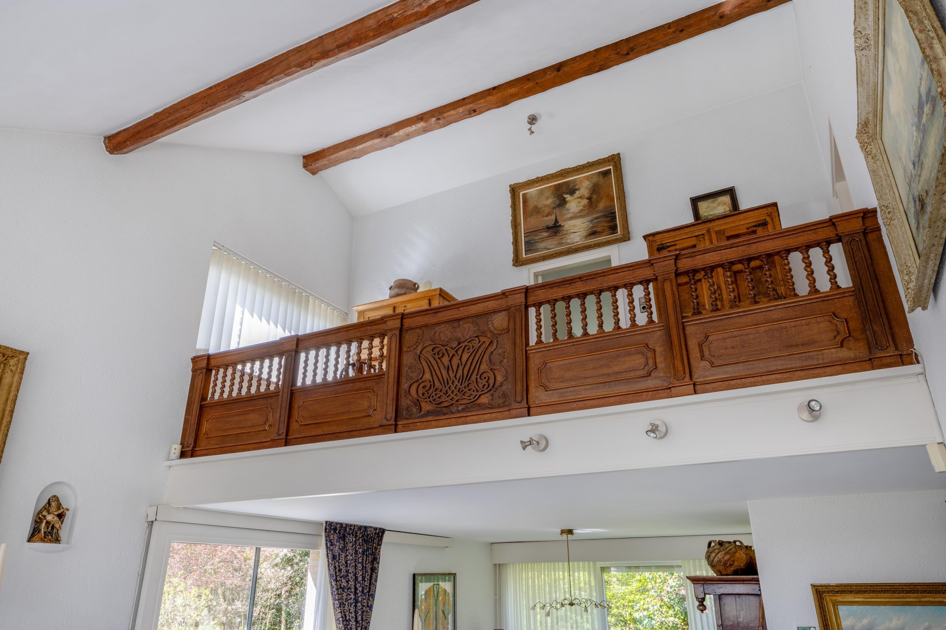 Eenmaal binnen valt meteen de bijzondere indeling op. De woonkamer is zonder twijfel het hart van het huis en een echte eyecatcher. Het niveauverschil zorgt voor een speels geheel, terwijl de vide en de zichtbare houten balken karakter en warmte toevoegen.