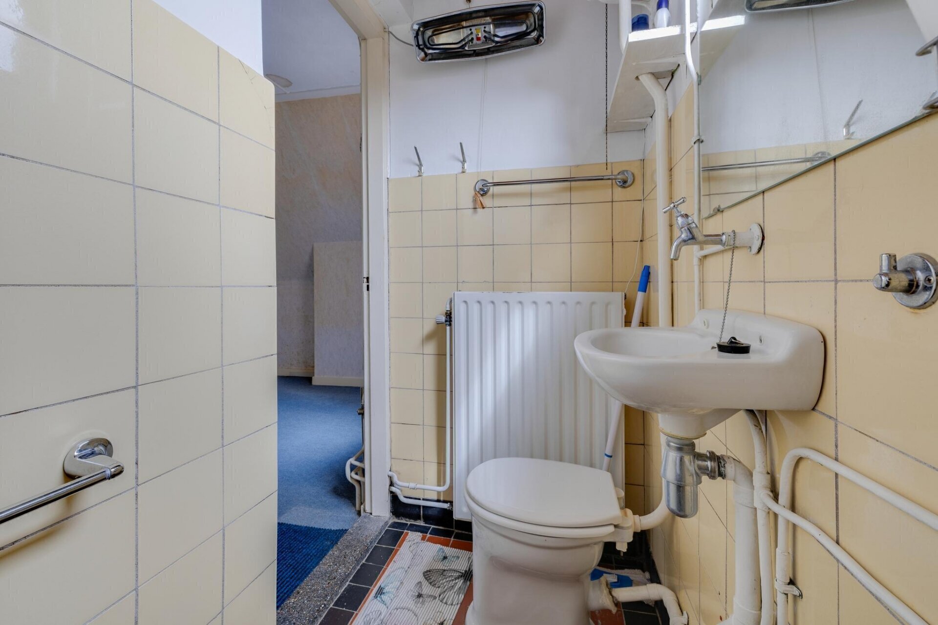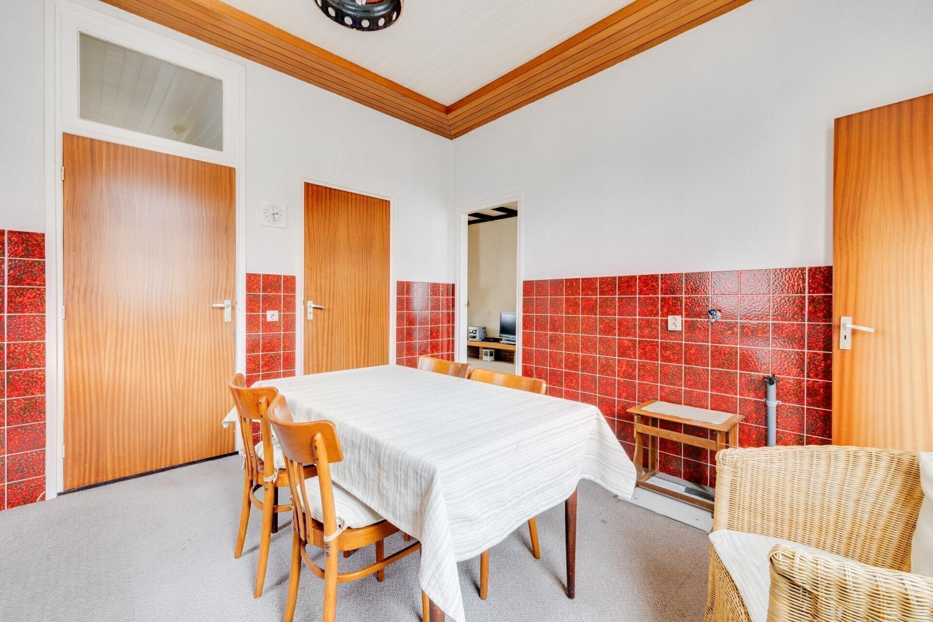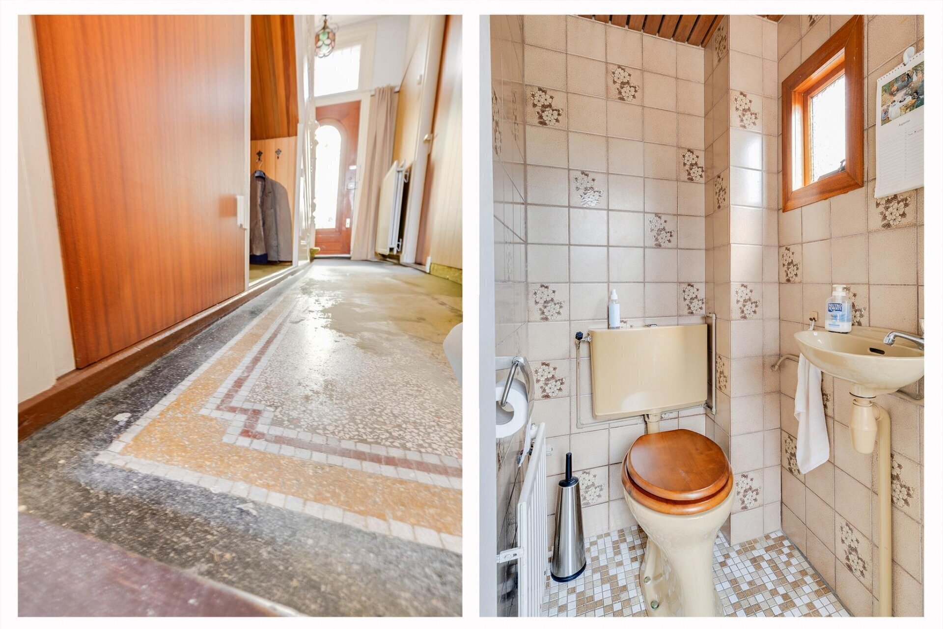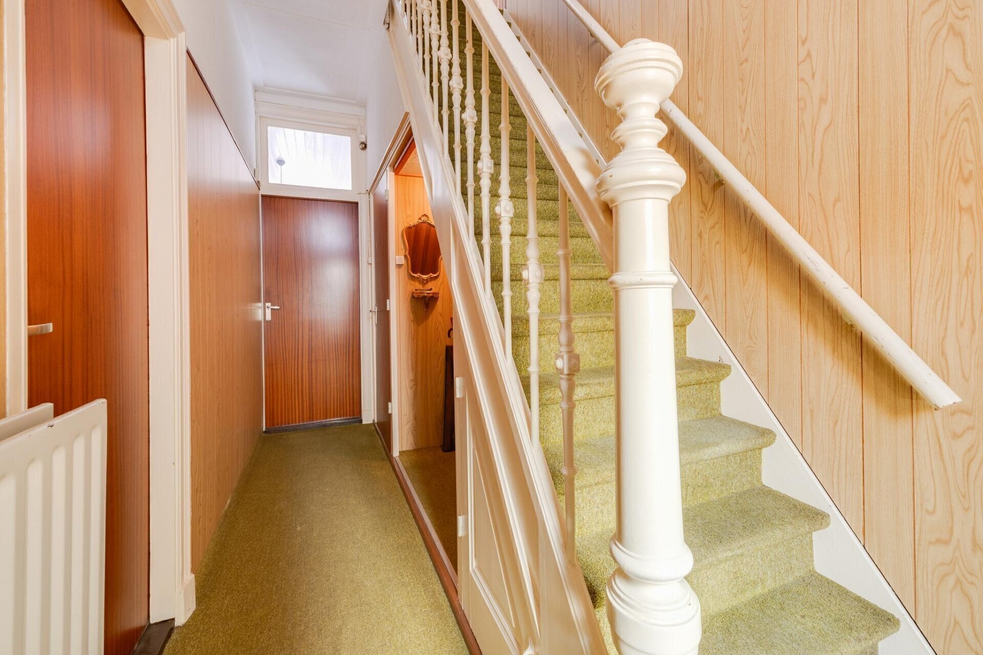 Binnenkomst in ruime hal met hoog plafond en originele terrazzovloer onder de vloerbedekking. Deze hal geeft toegang tot eerste verdieping, kelder, woonkamer en de ruime woonkeuken aan de achterzijde.