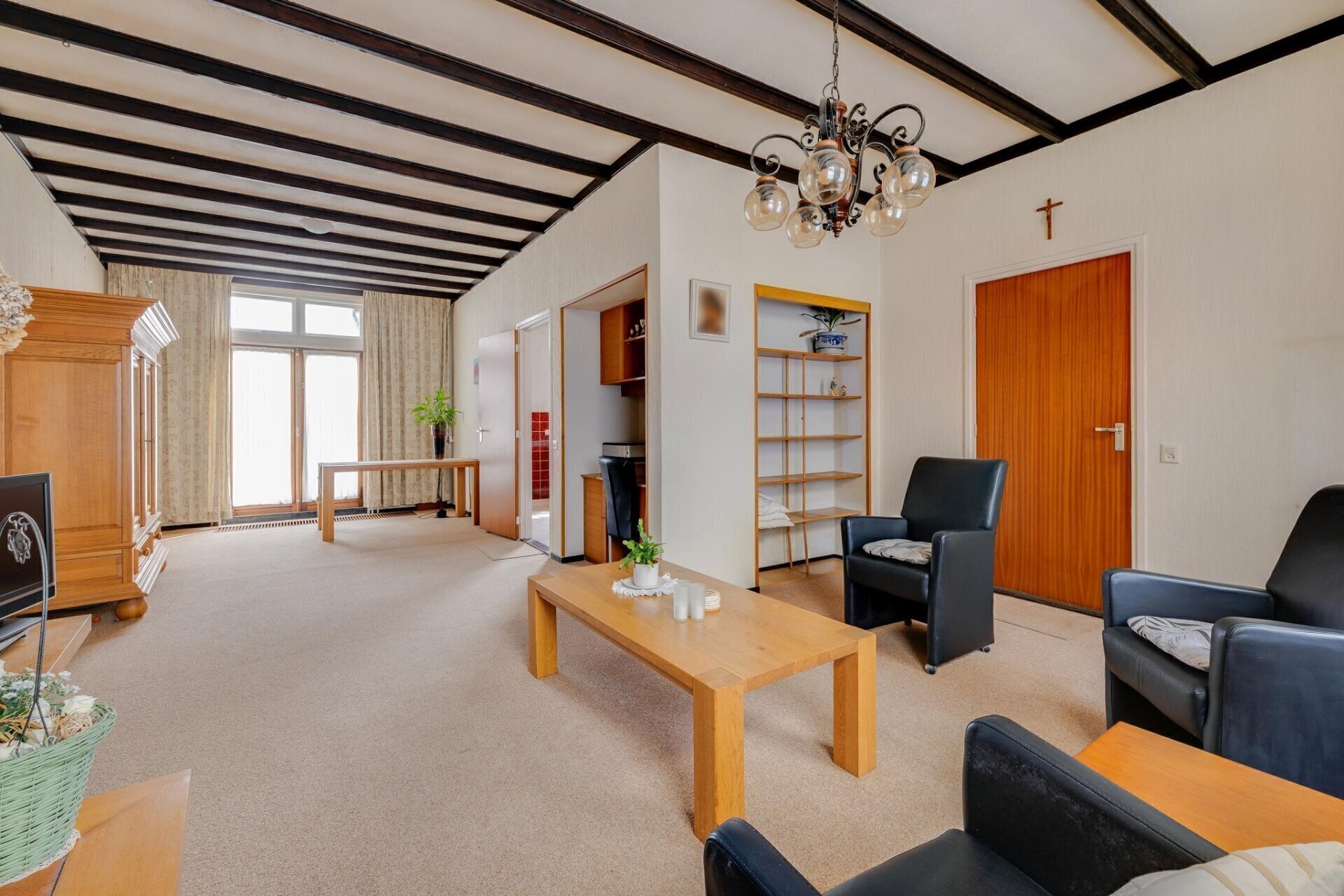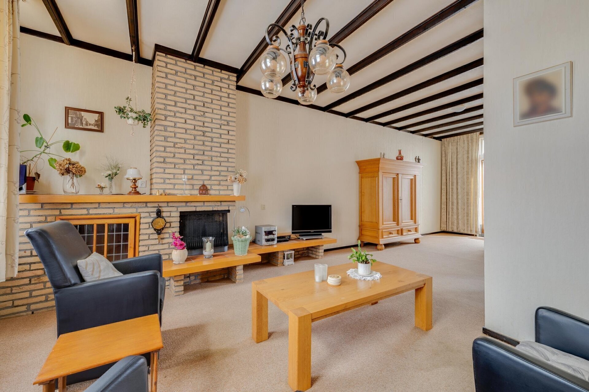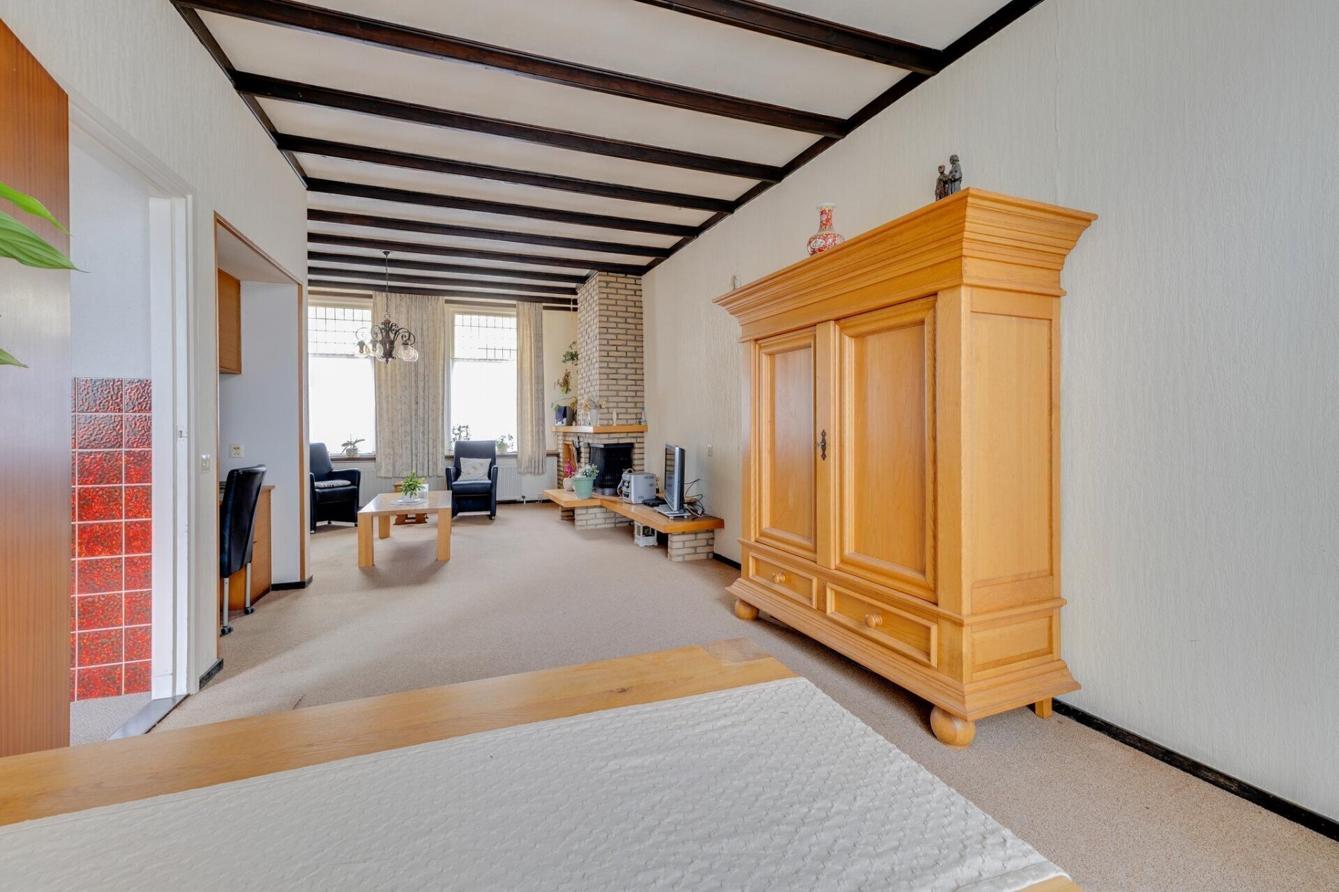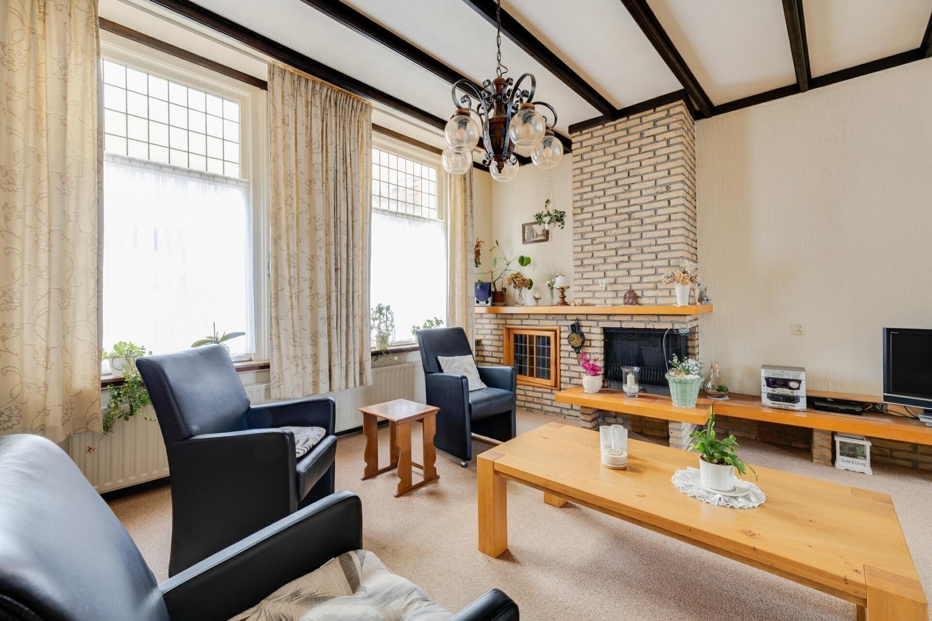 De zeer diepe woonkamer heeft een prettig lichtinval door de raampartijen aan voor- en achterzijde, middelpunt van de kamer is de sfeervolle haard, en de glas-in-loodramen zorgen voor een karakteristieke uitstraling. Tevens beschikt de woonkamer over authentieke ingebouwde rolluiken.