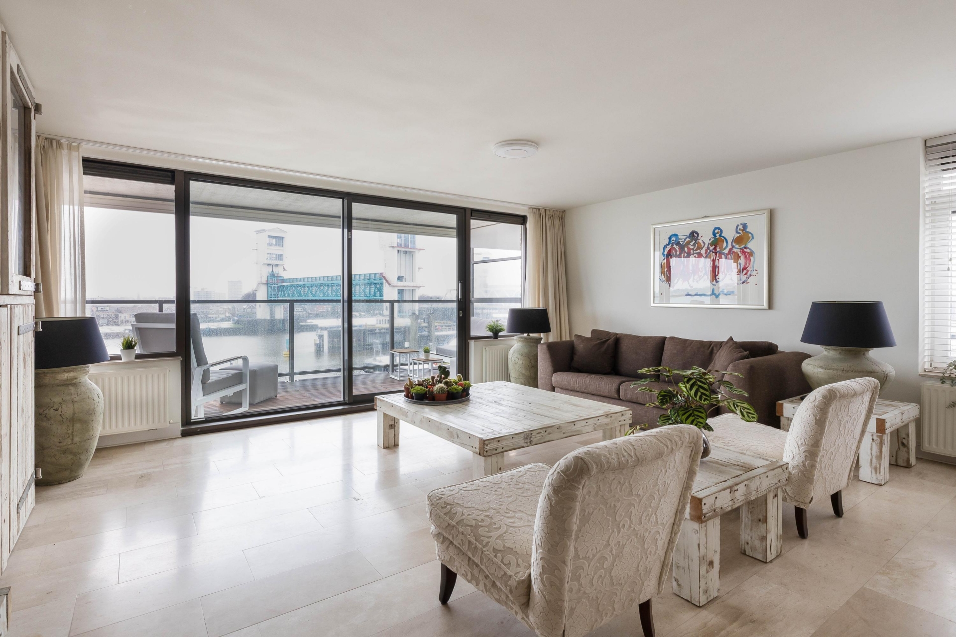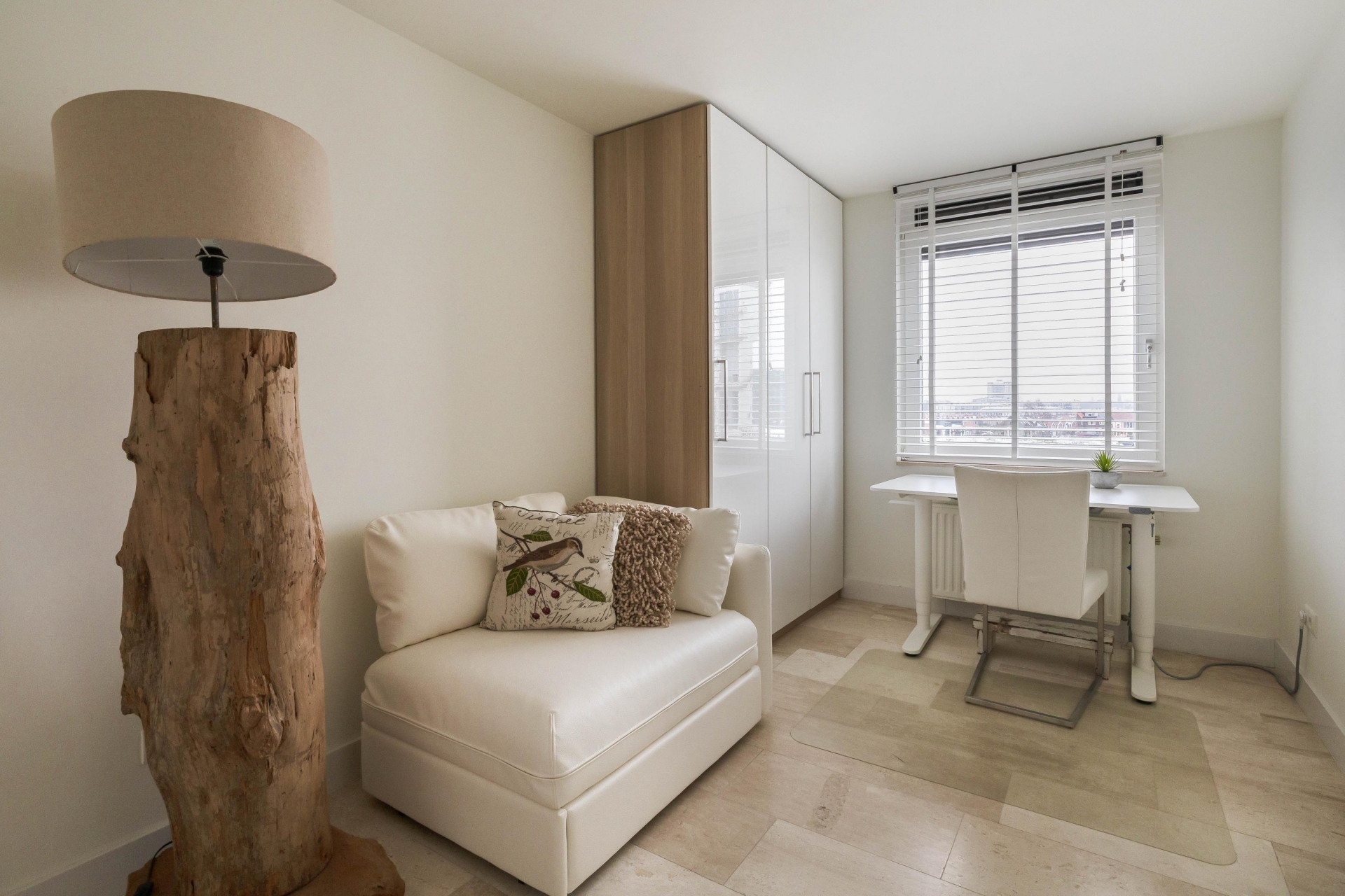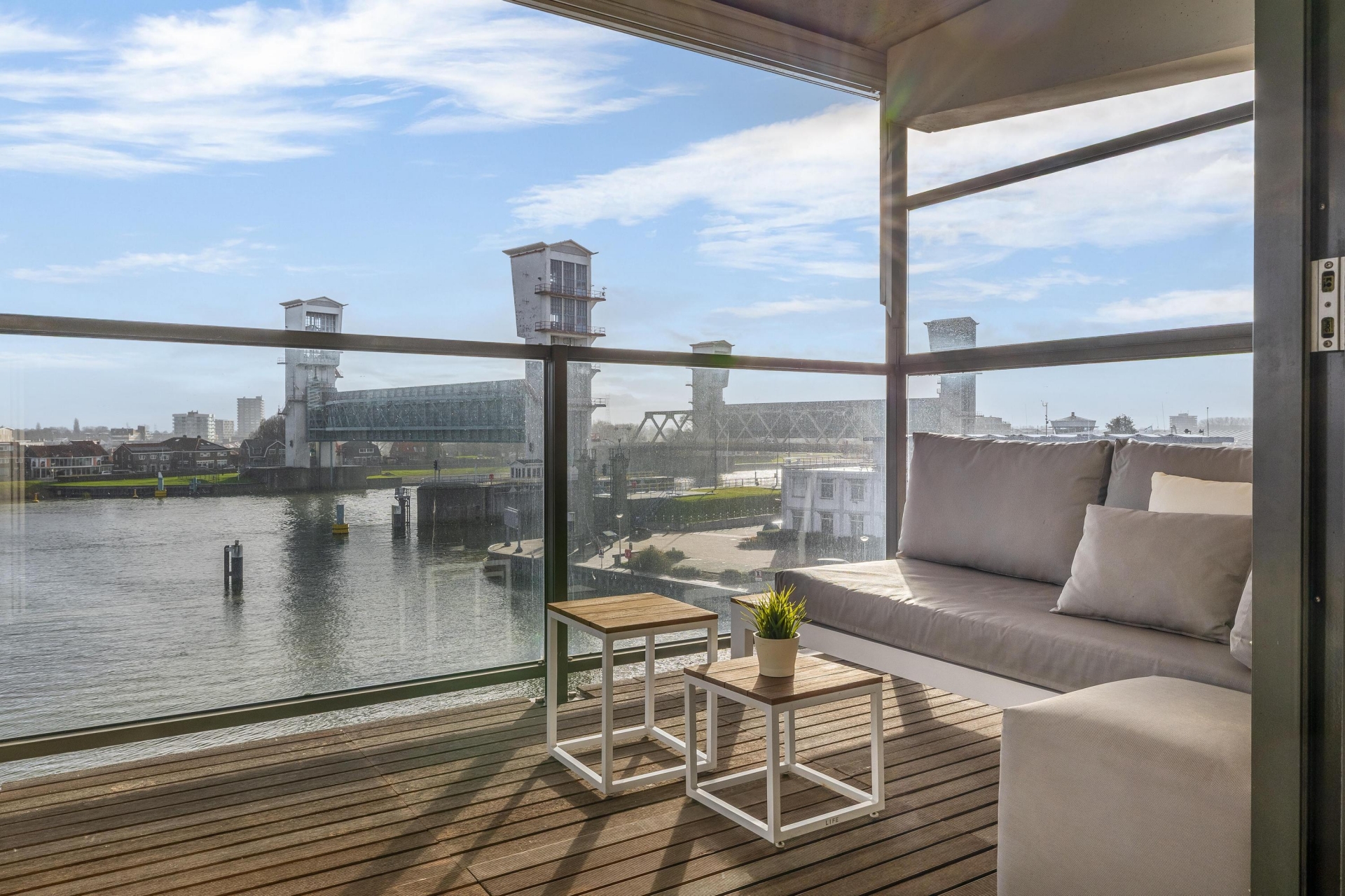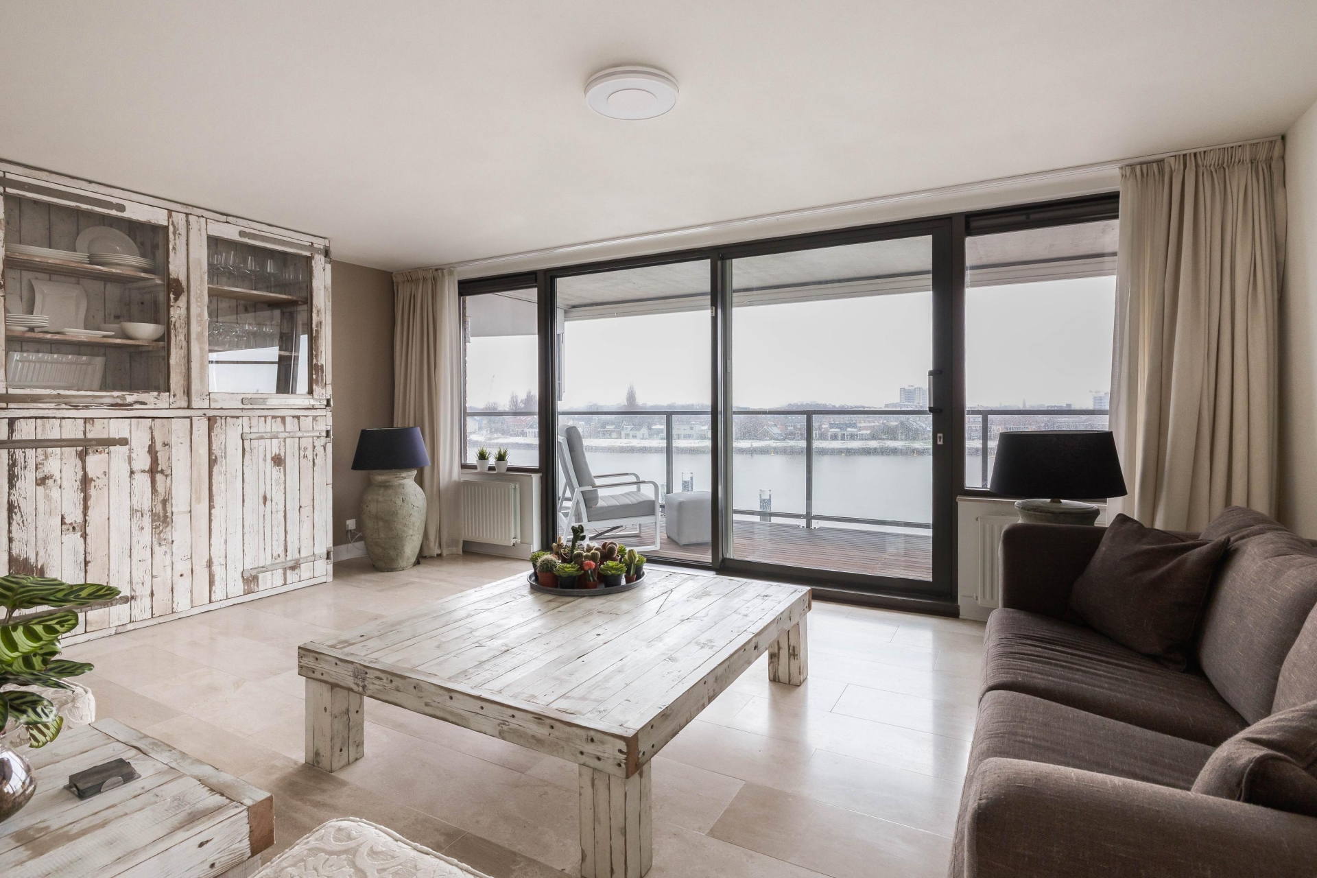 Vanaf het royale terras kijk je vrij uit over het water, met boten die rustig voorbijglijden en een steeds veranderend uitzicht. Door de ligging op de derde verdieping én de hoekpositie is het hier opvallend licht. Grote raampartijen en extra zijramen zorgen voor een prettige open sfeer, waarbij binnen en buiten moeiteloos in elkaar overlopen. Dit is zo’n plek waar je ’s ochtends rustig wakker wordt met een kop koffie in de zon en ’s avonds nog even blijft zitten omdat het uitzicht blijft trekken.