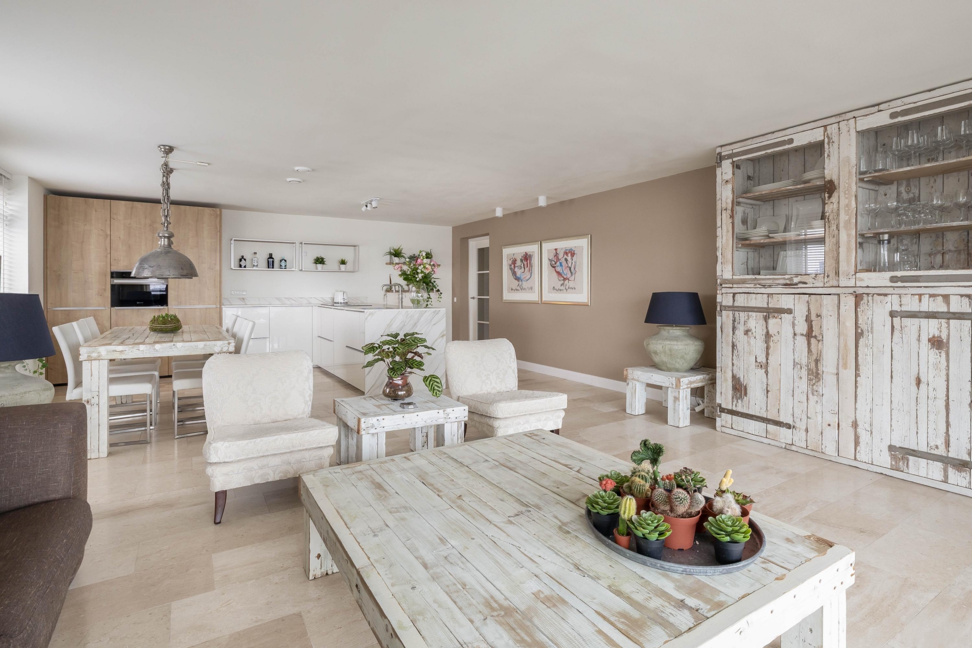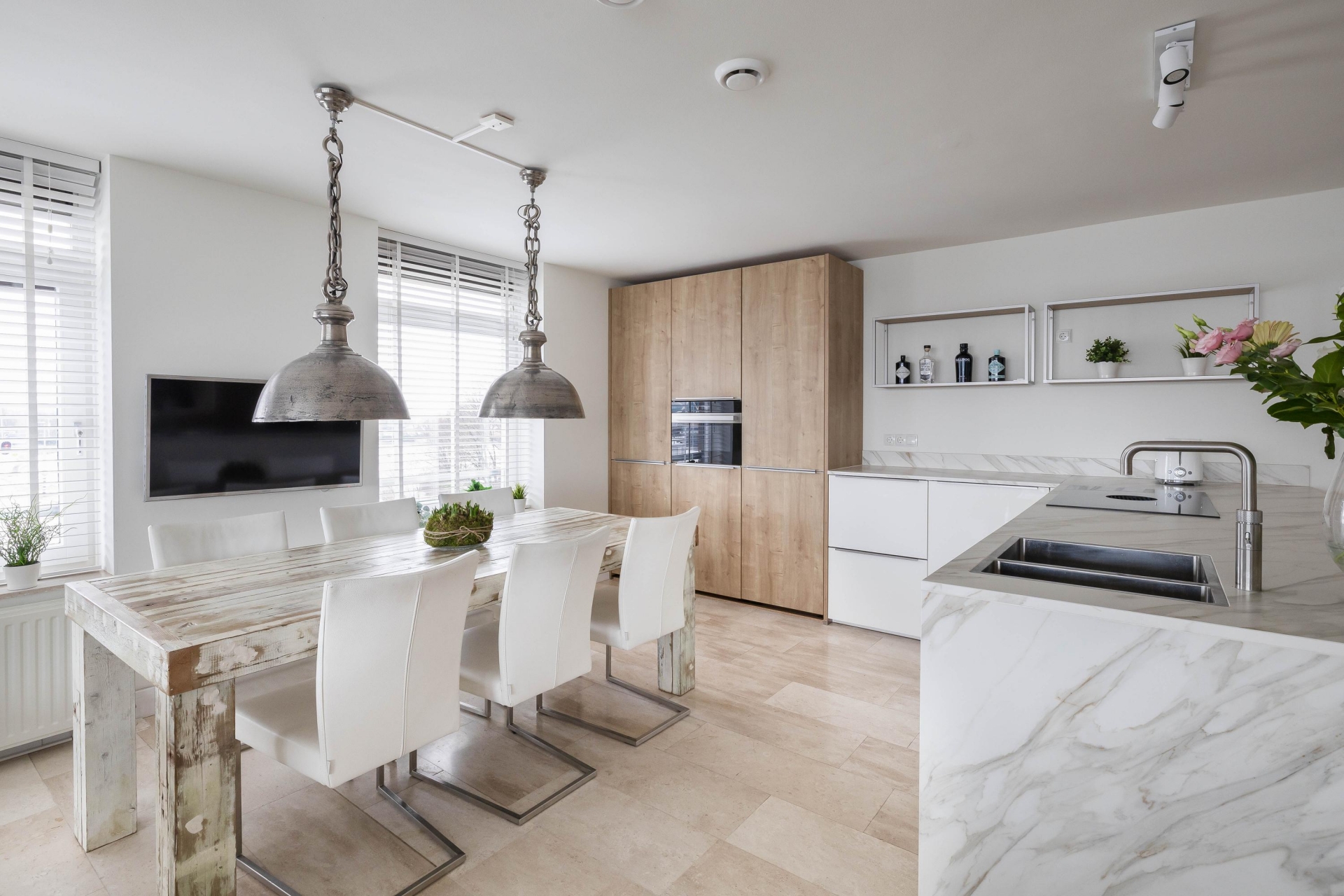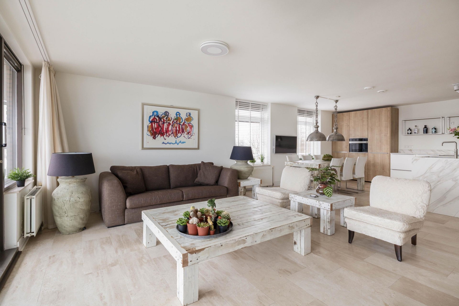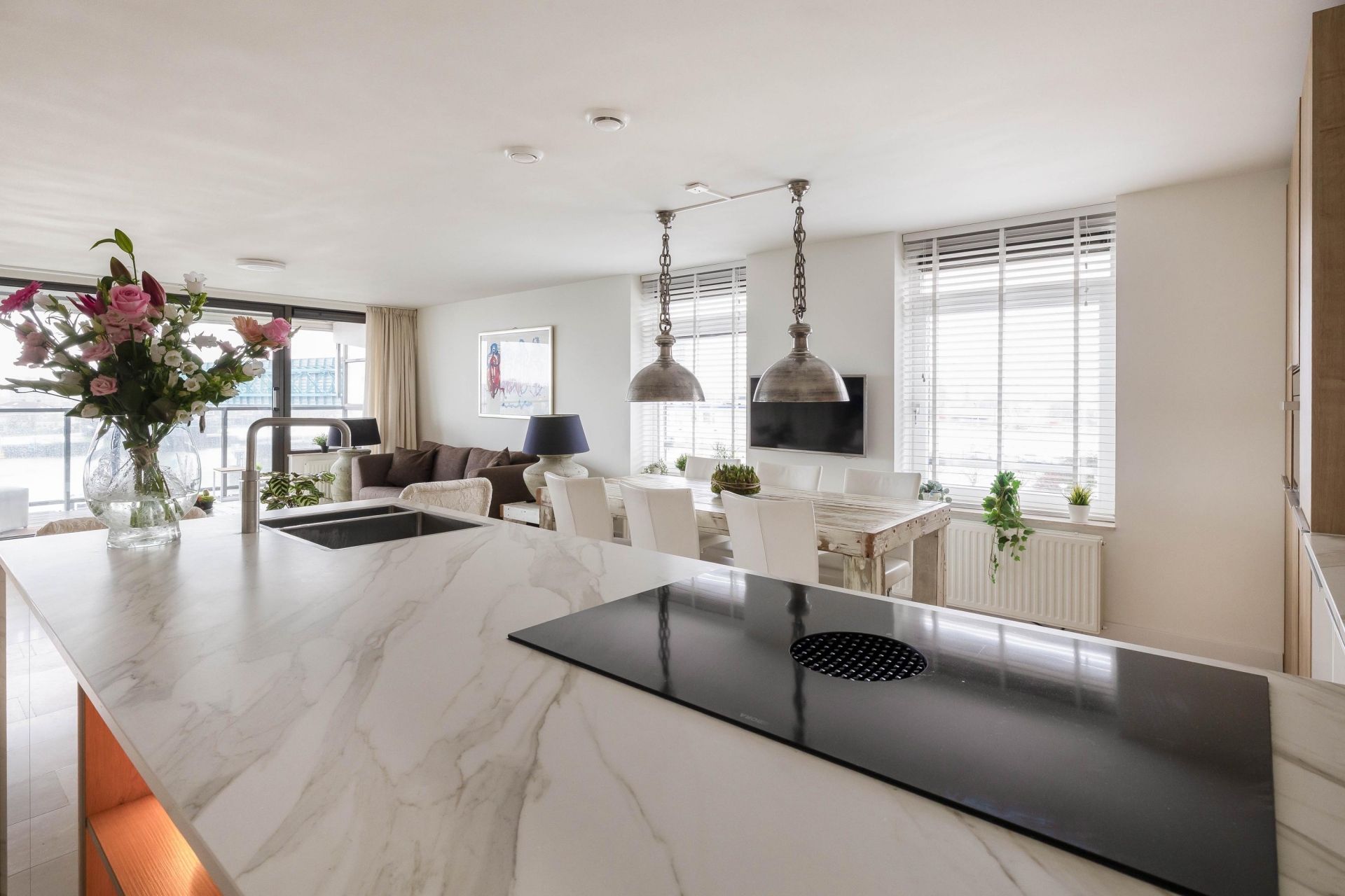 De combinatie van strakke lijnen, moderne apparatuur en warme materialen past perfect bij de rest van het appartement. Alles is logisch ingedeeld en praktisch in gebruik, zonder dat het zijn uitstraling verliest. Vanuit de keuken kijk je mooi de woonruimte in, wat het geheel extra ruimtelijk maakt.
