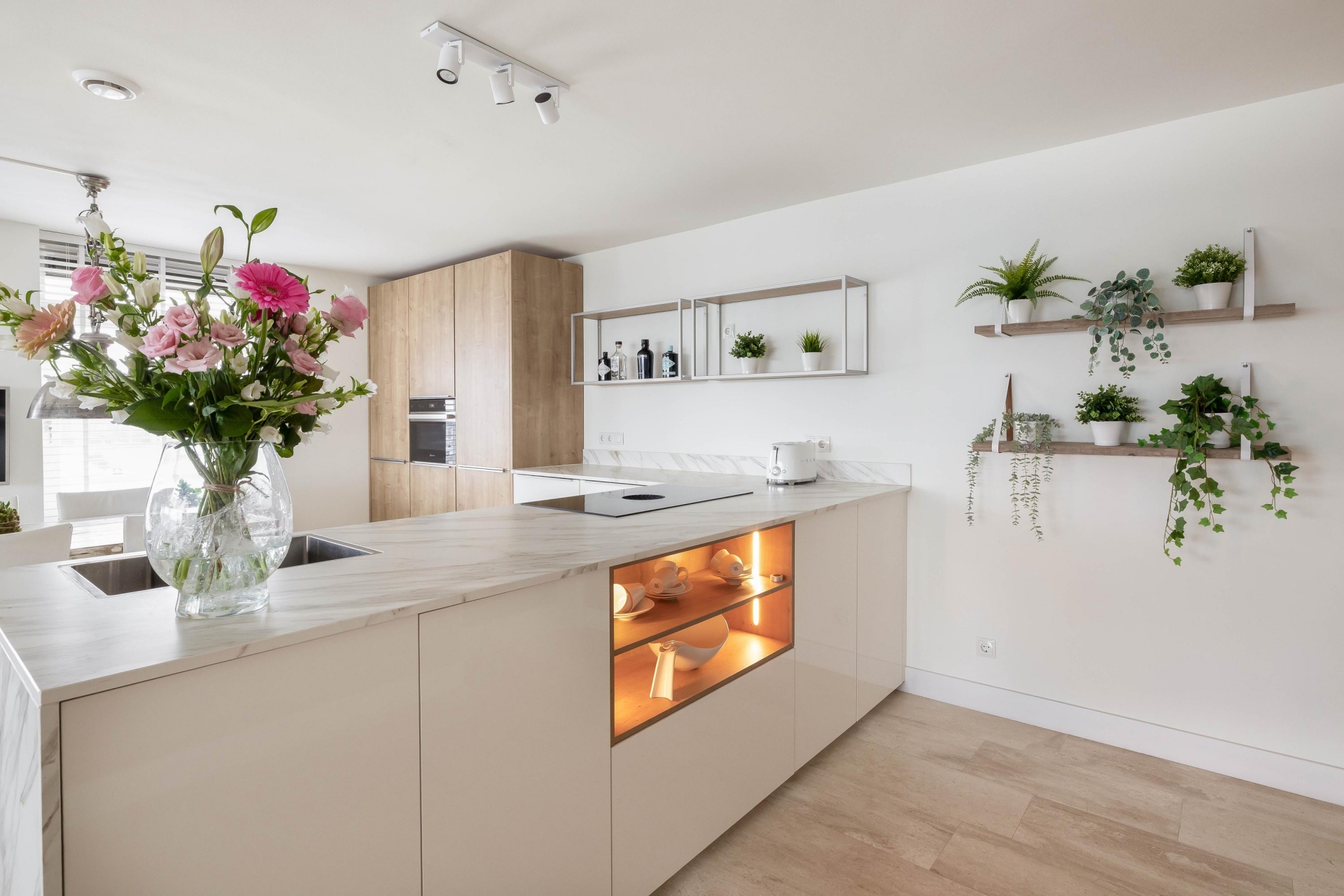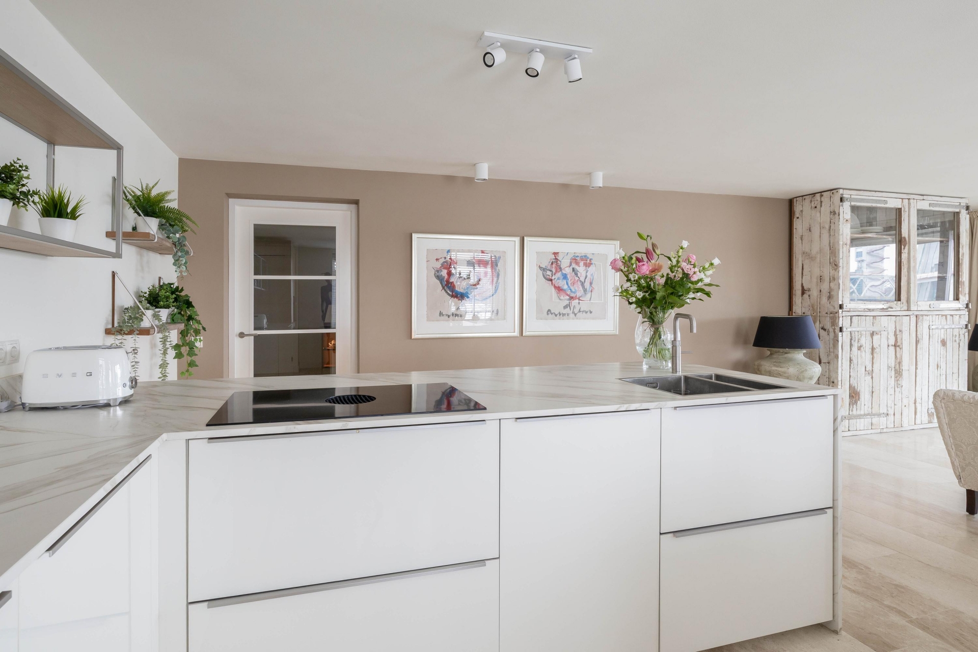 De keuken is in 2020 vernieuwd (Nolte) en vormt het hart van het appartement. Deze is luxe uitgevoerd en voorzien van alle gemakken die je mag verwachten en heeft een mooi stenen blad. Het kookeiland zorgt niet alleen voor extra werkruimte, maar maakt de keuken ook een sociale plek waar je makkelijk aanschuift. Of je nu uitgebreid kookt of gewoon samen een glas wijn drinkt: hier gebeurt het.