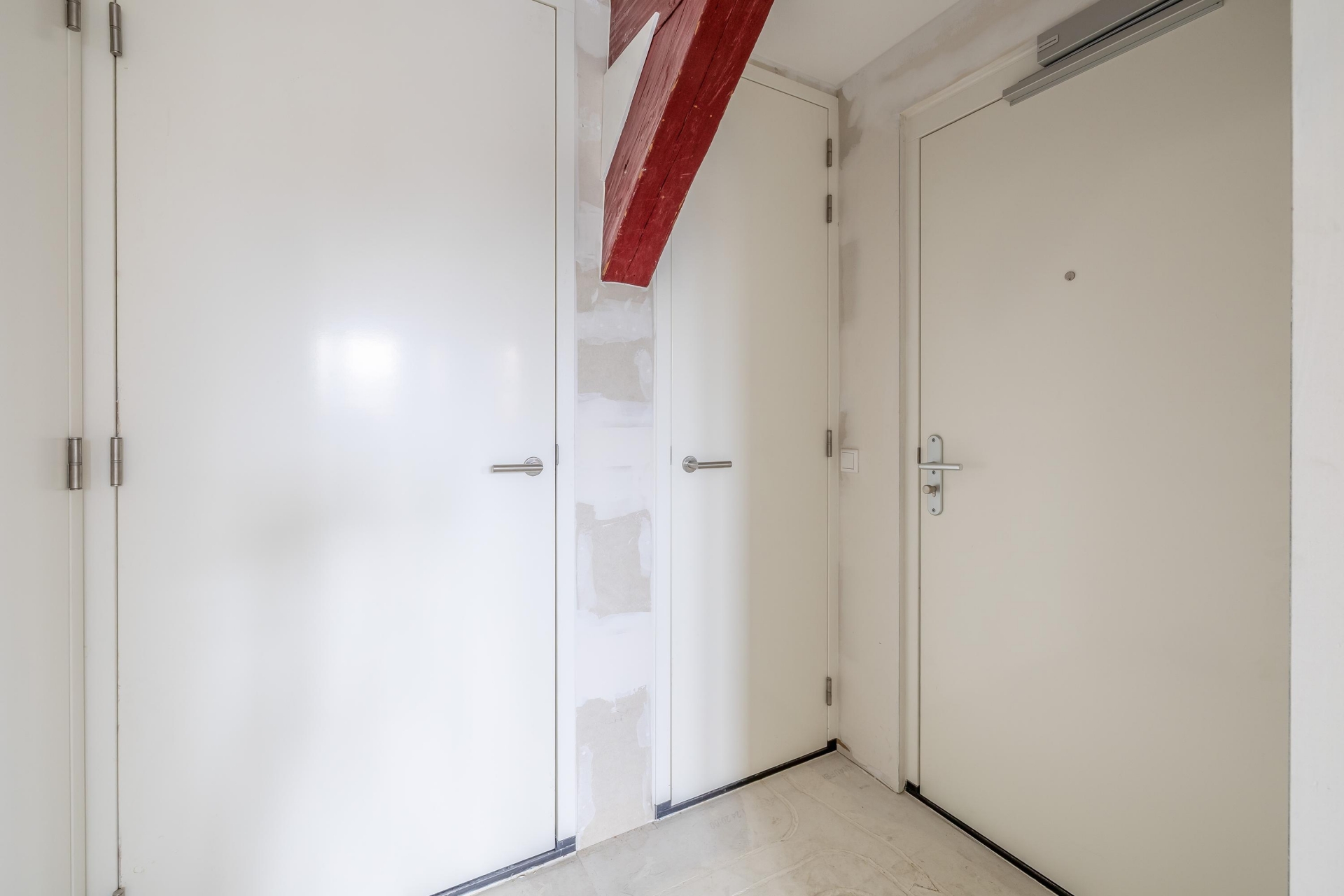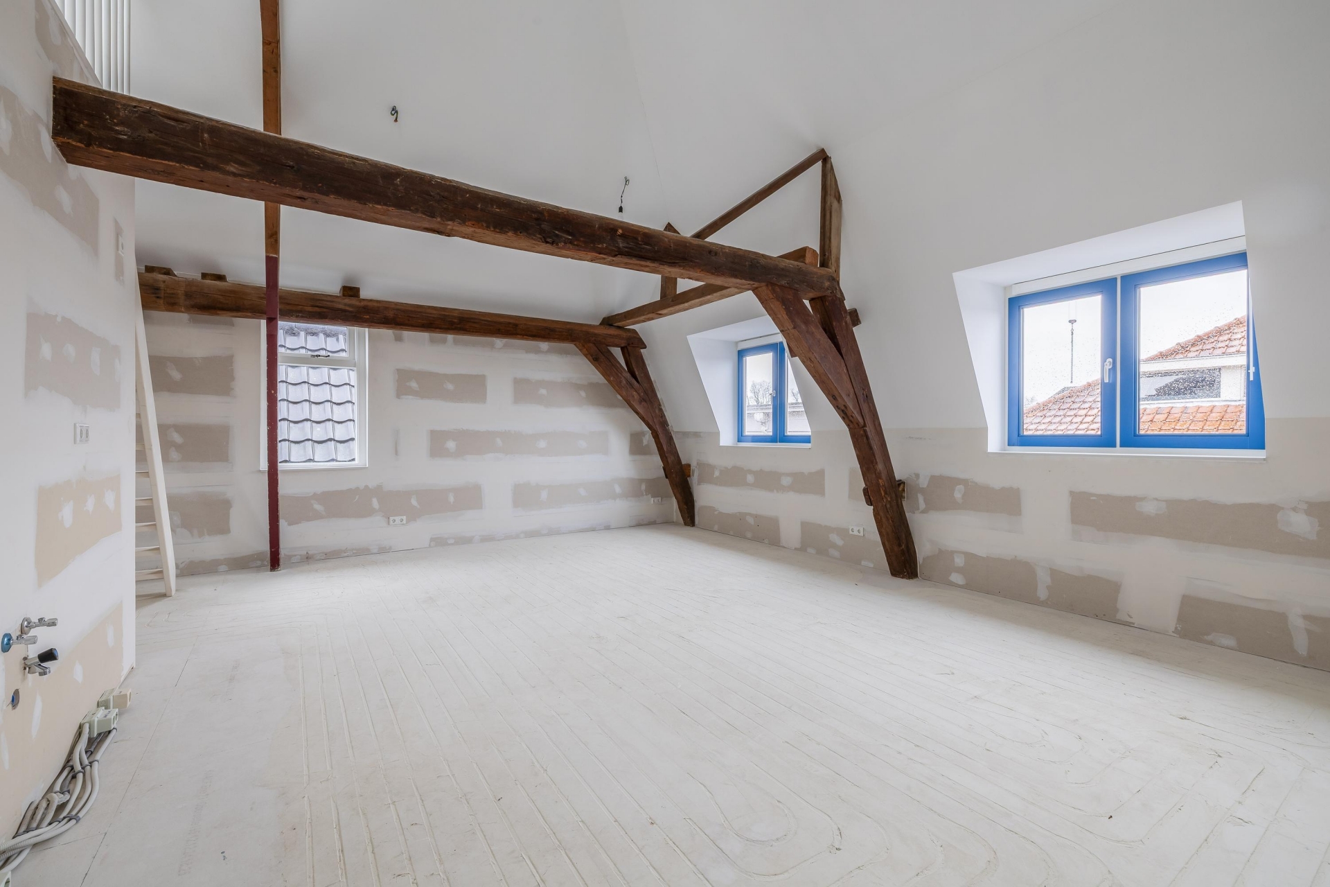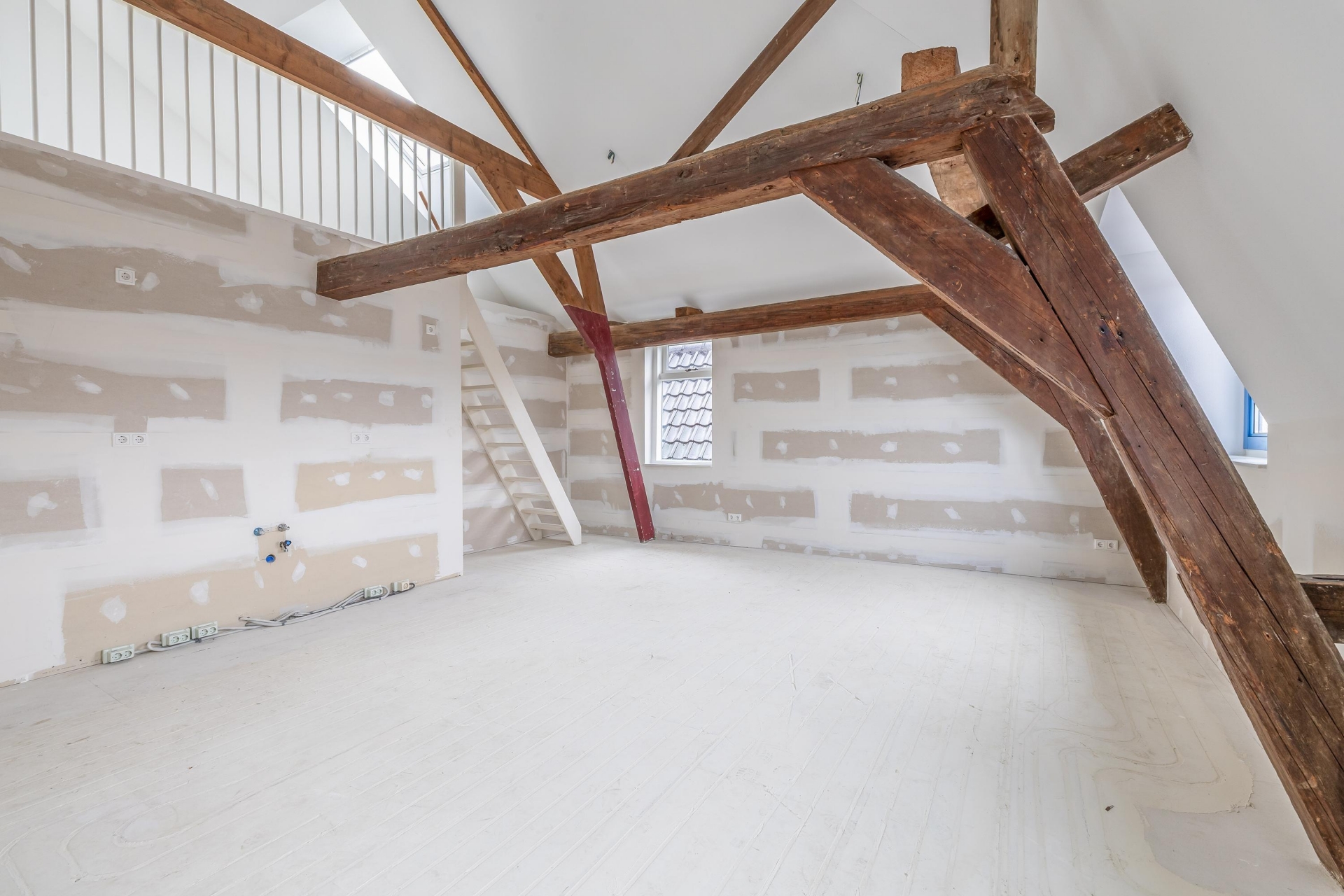 De woonruimte is licht, strak afgewerkt en helemaal klaar om jouw eigen stijl aan te geven. De wanden zijn behangklaar, de keuken is nog vrij in te richten (aansluitingen zijn aanwezig) en de fraaie entresol zorgt voor een extra dimensie in de ruimte, perfect als werkplek, hobbyruimte of logeerplek. De houten balken en de hoge vide geven echt karakter aan het appartement!
