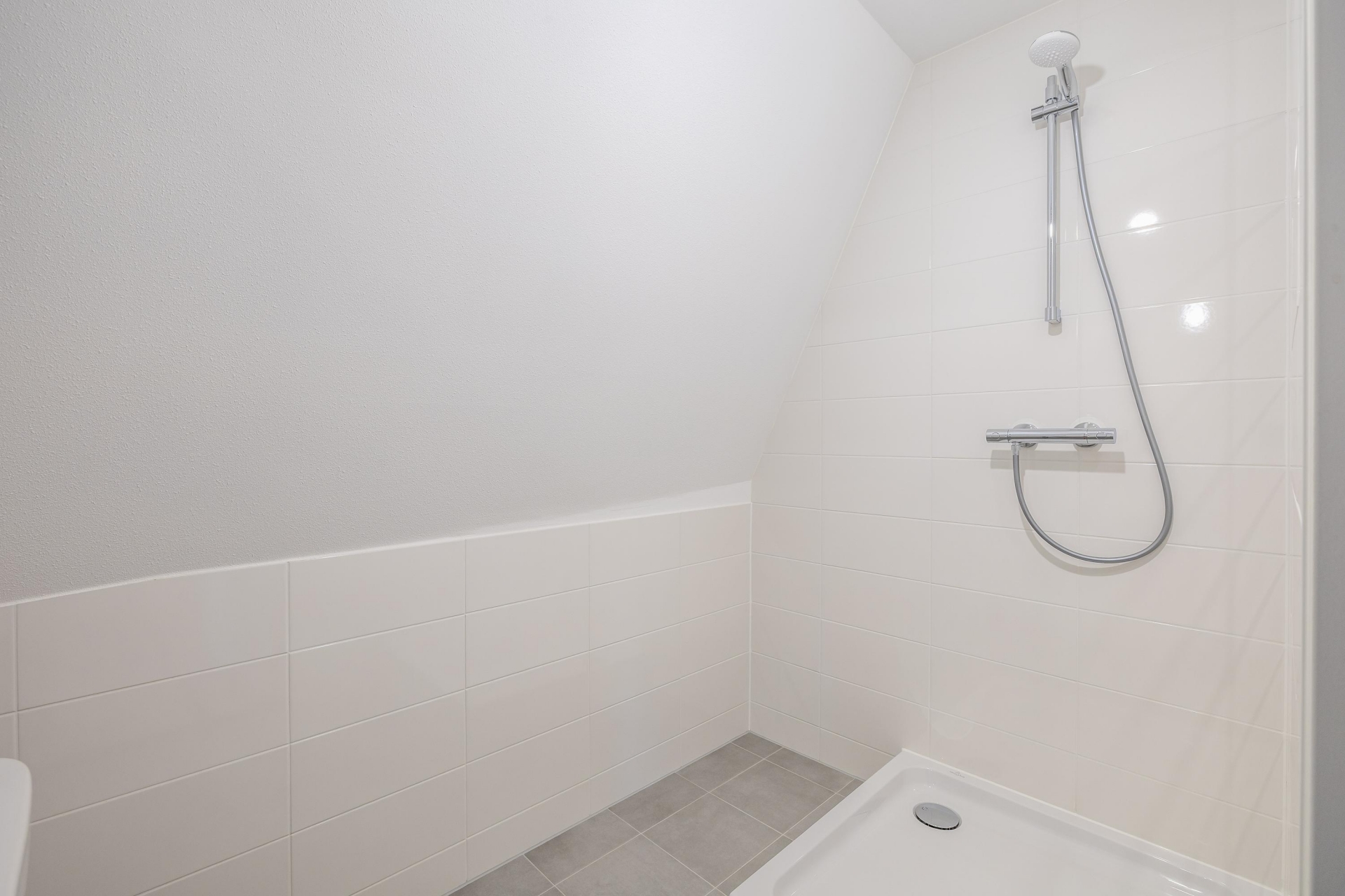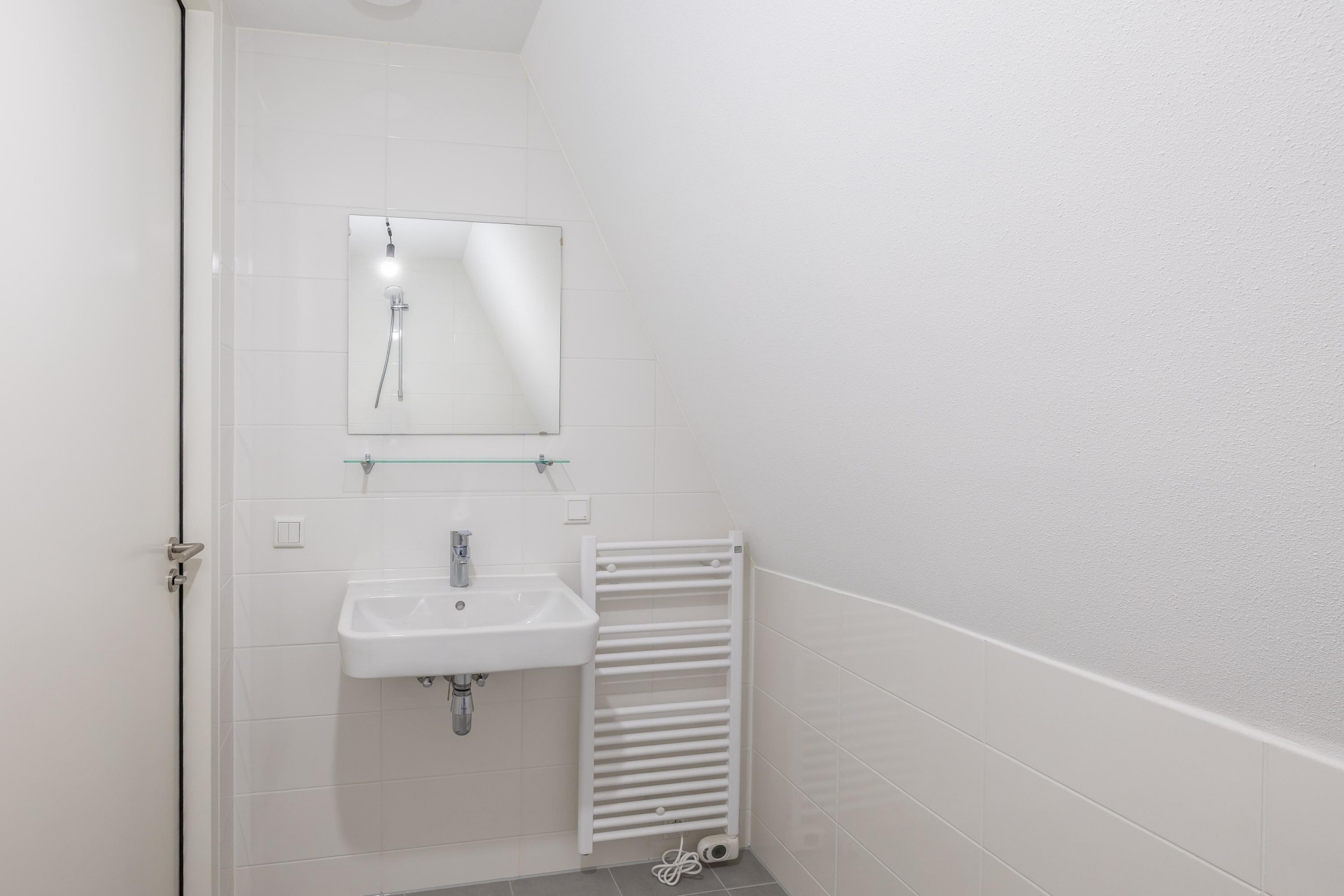 De slaapkamer biedt voldoende plek voor een tweepersoonsbed en kastruimte. De badkamer is modern afgewerkt en voorzien van een inloopdouche, wastafel en aansluiting voor de wasmachine. Een apart toilet maakt het geheel compleet.