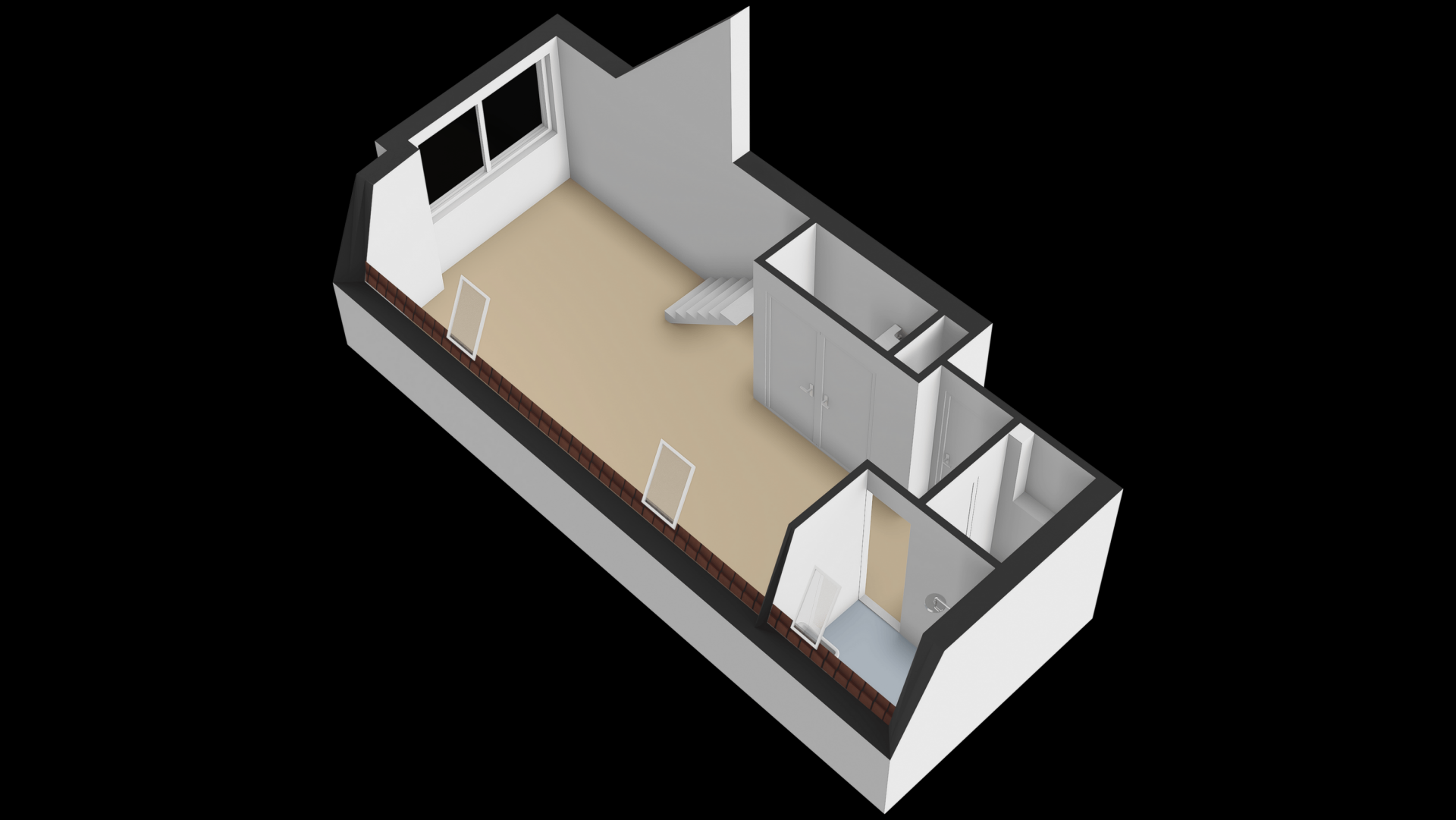 Wat deze studio bijzonder maakt, is de hoge plafondruimte met een entresol. Deze verhoogde slaapverdieping zorgt ervoor dat je de begane vloer volledig kunt gebruiken voor wonen en koken. De grote raampartijen zorgen voor een fijne lichtinval vanuit het westen, en geven de ruimte een open, loftachtige sfeer.