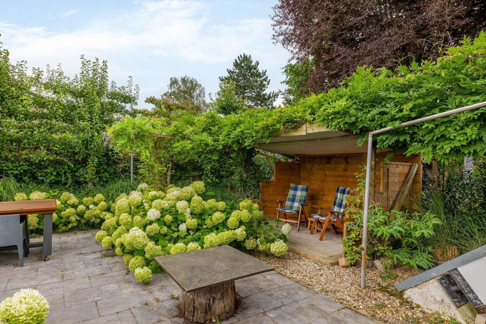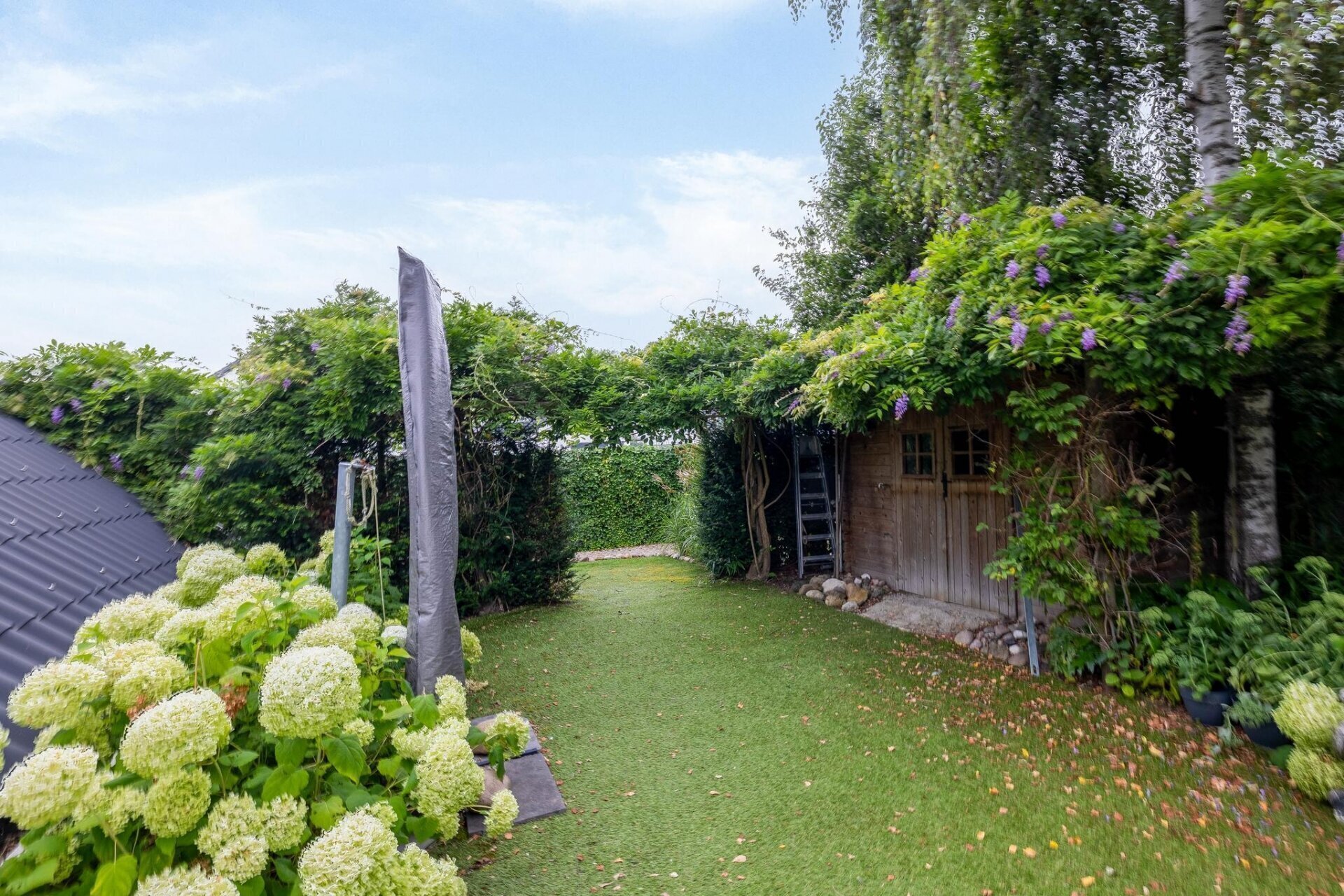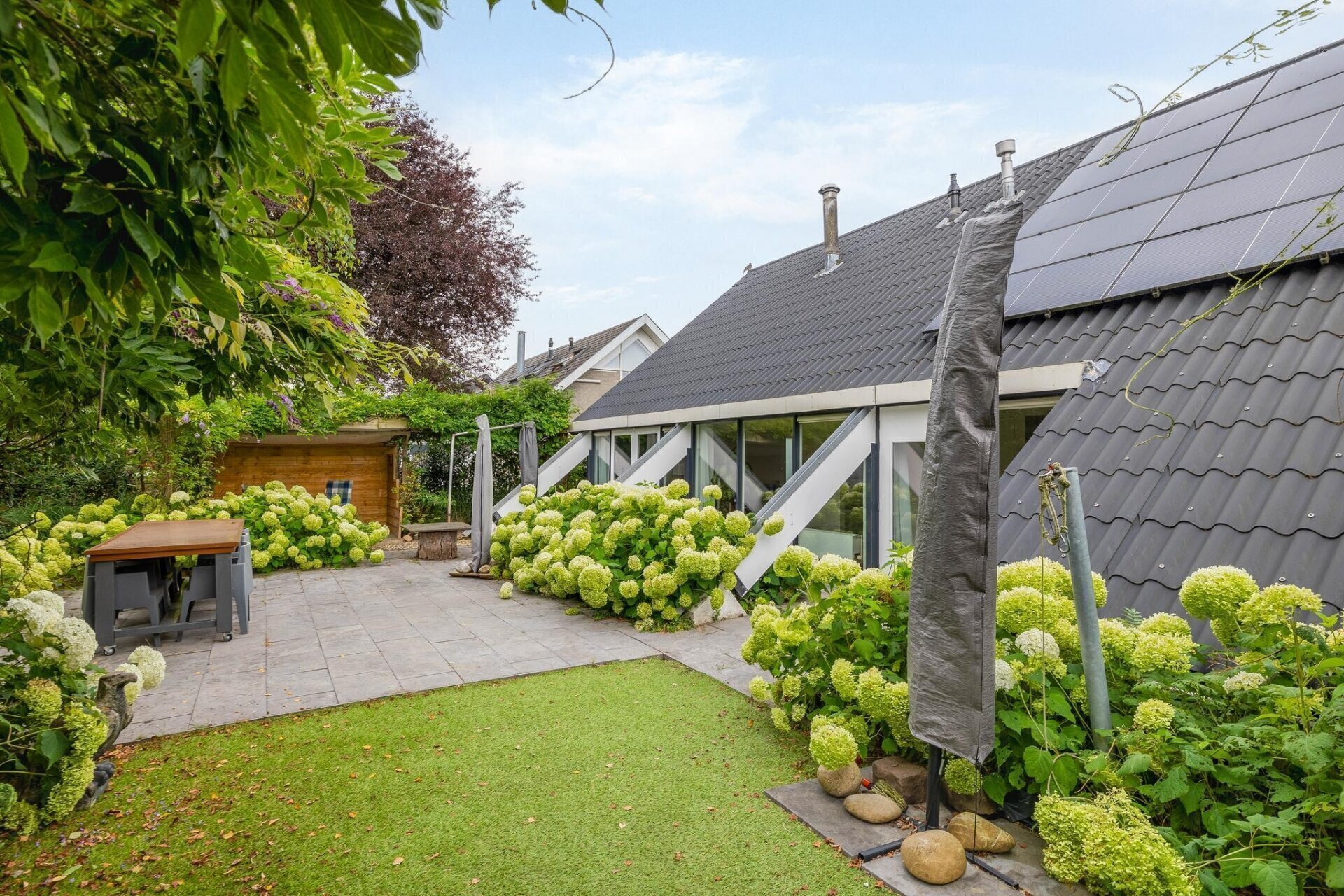De fraai aangelegde achtertuin van 23 meter breed biedt volop mogelijkheden voor sfeervolle zithoeken om gezellig met vrienden en familie buiten te genieten. Een houten overkapping biedt een beschutte plek om van het buitenleven te genieten. Aan de achterzijde is een ruime vrijstaande houten berging geschikt voor het opbergen van fietsen of tuingereedschap. Aangebouwd aan de woning bevindt zich een derde stenen berging.