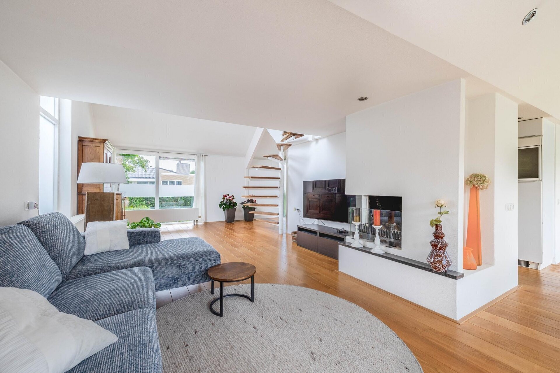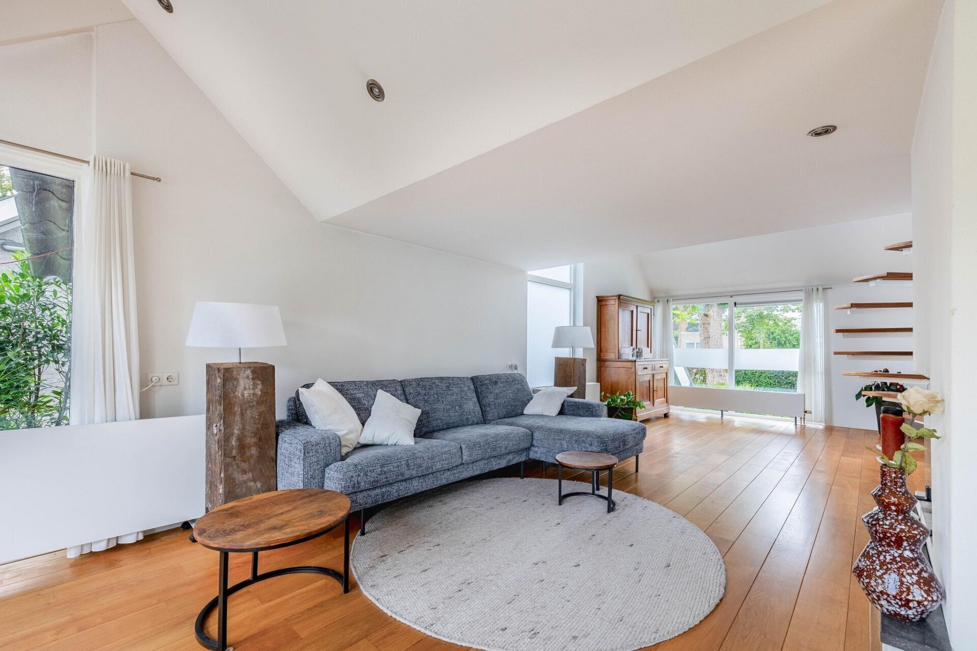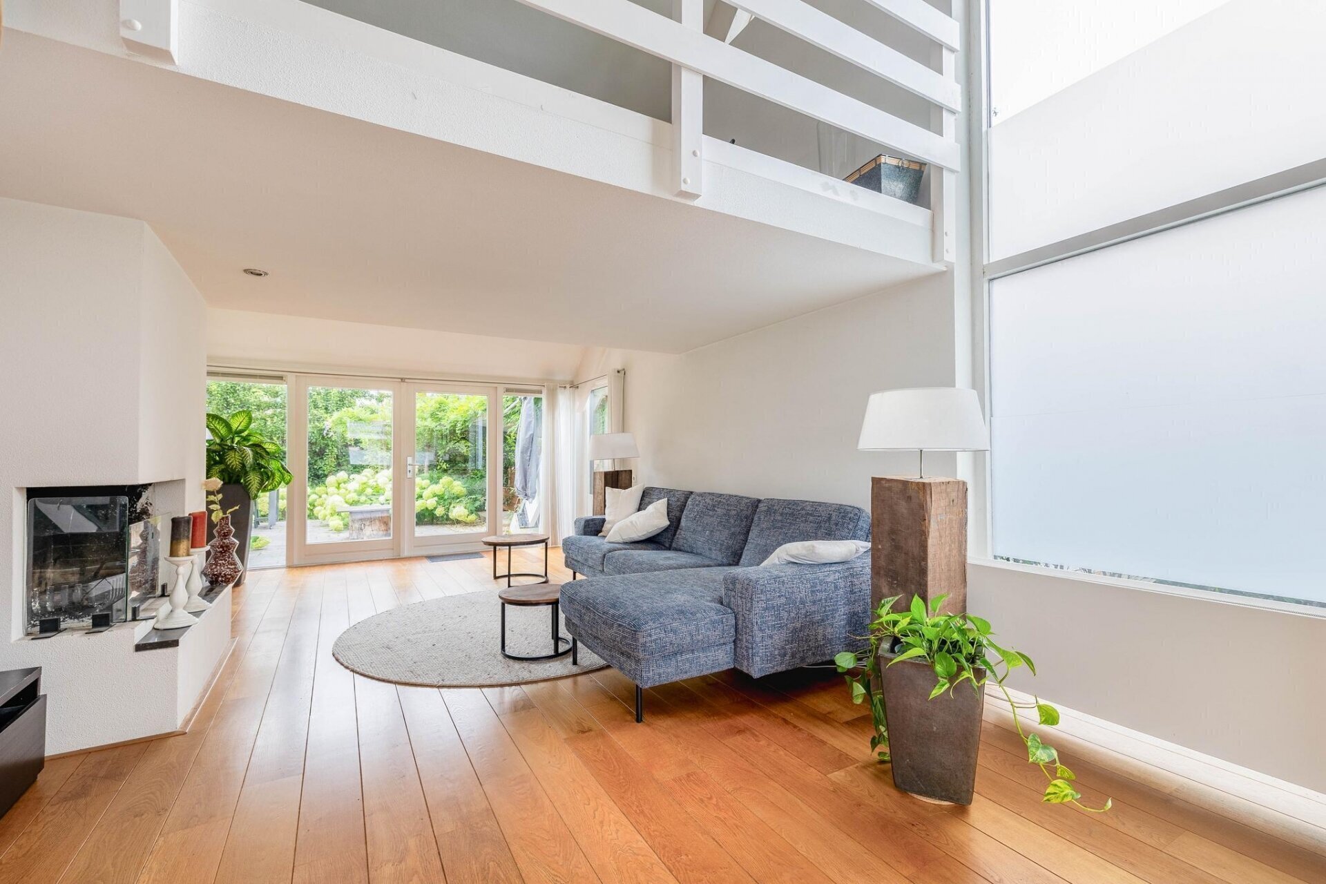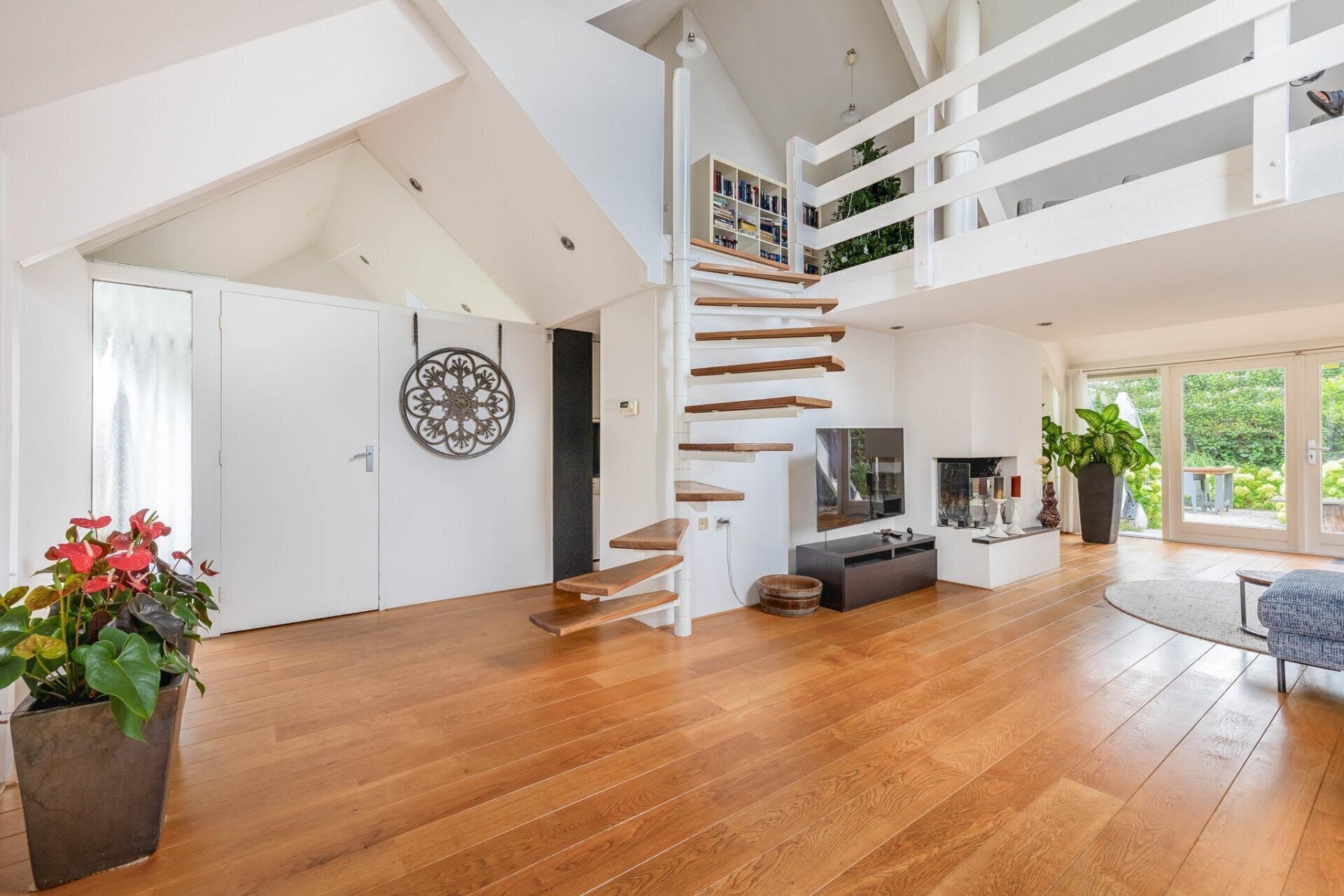 De lichte woonkamer valt op door de sfeervolle vide en grote raampartijen. De prachtige parketvloer loopt vanuit de hal door in de gehele woonkamer en keuken. De open haard en de vide met wenteltrap creëren een gezellige zithoek. De L-vormige woonkamer van circa 81 m² biedt ruimte voor een sfeervolle eethoek met uitzicht op de achtertuin en heeft dubbele openslaande deuren en een extra loopdeur naar de tuin. De woonkamer is voorzien van airconditioning.
