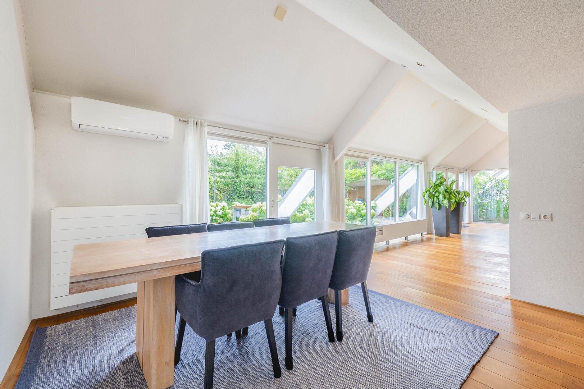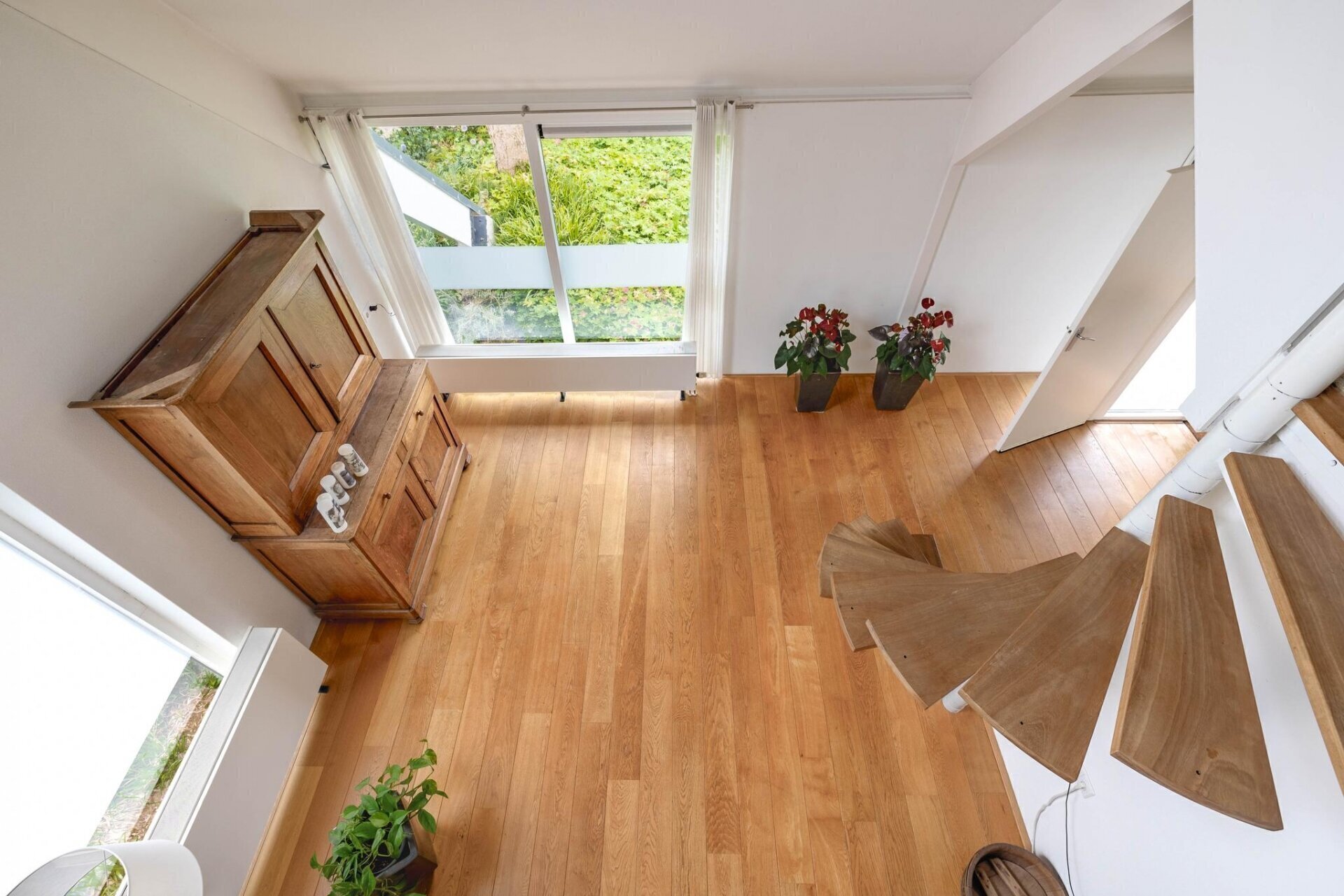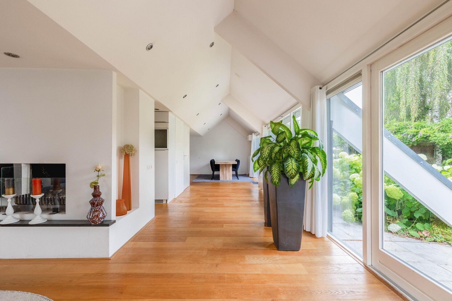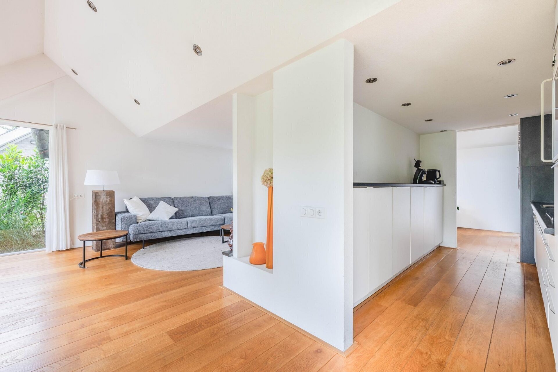 De lichte woonkamer valt op door de sfeervolle vide en grote raampartijen. De prachtige parketvloer loopt vanuit de hal door in de gehele woonkamer en keuken. De open haard en de vide met wenteltrap creëren een gezellige zithoek. De L-vormige woonkamer van circa 81 m² biedt ruimte voor een sfeervolle eethoek met uitzicht op de achtertuin en heeft dubbele openslaande deuren en een extra loopdeur naar de tuin. De woonkamer is voorzien van airconditioning.