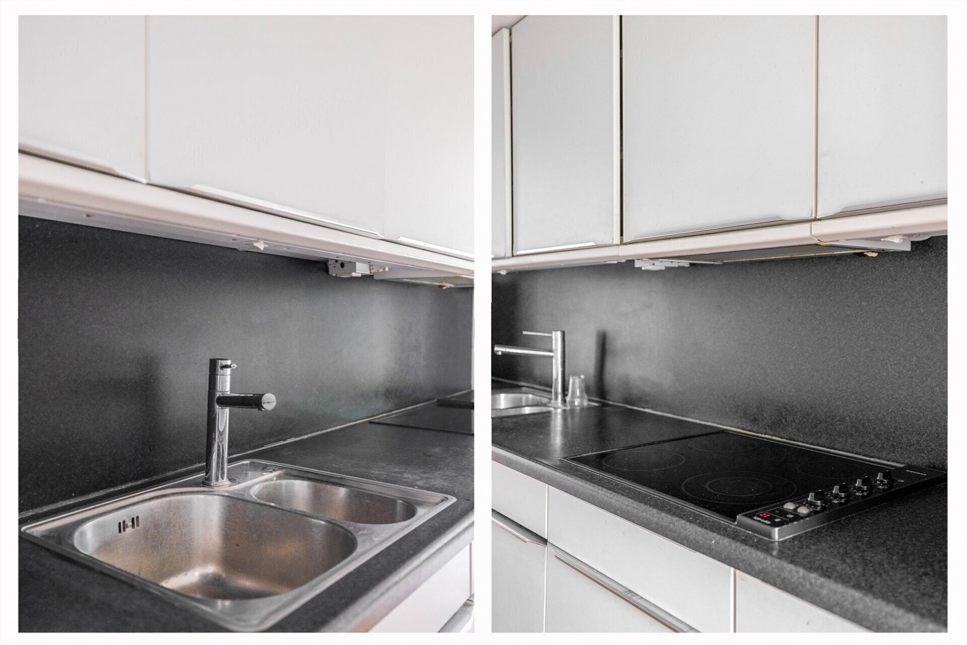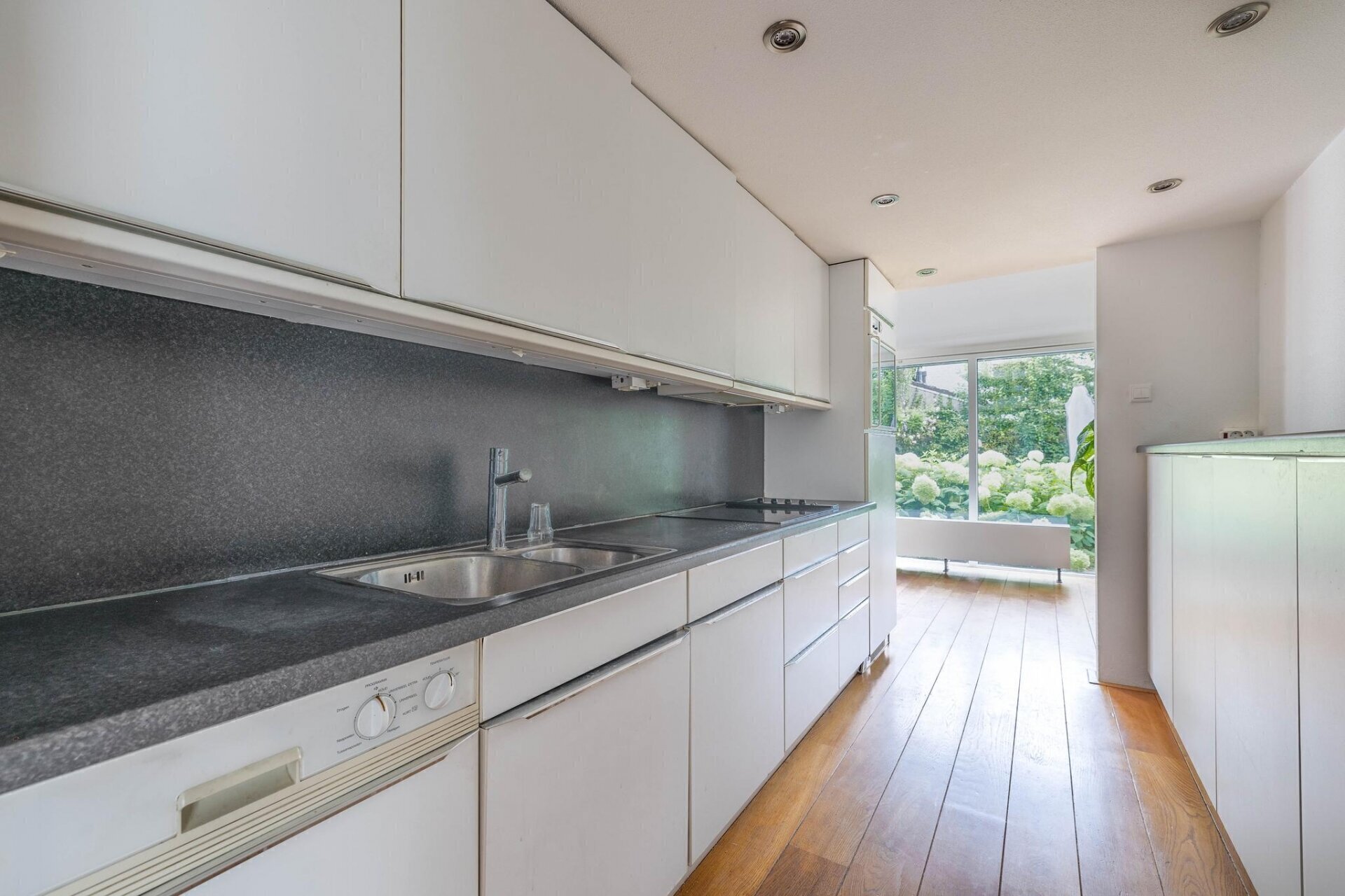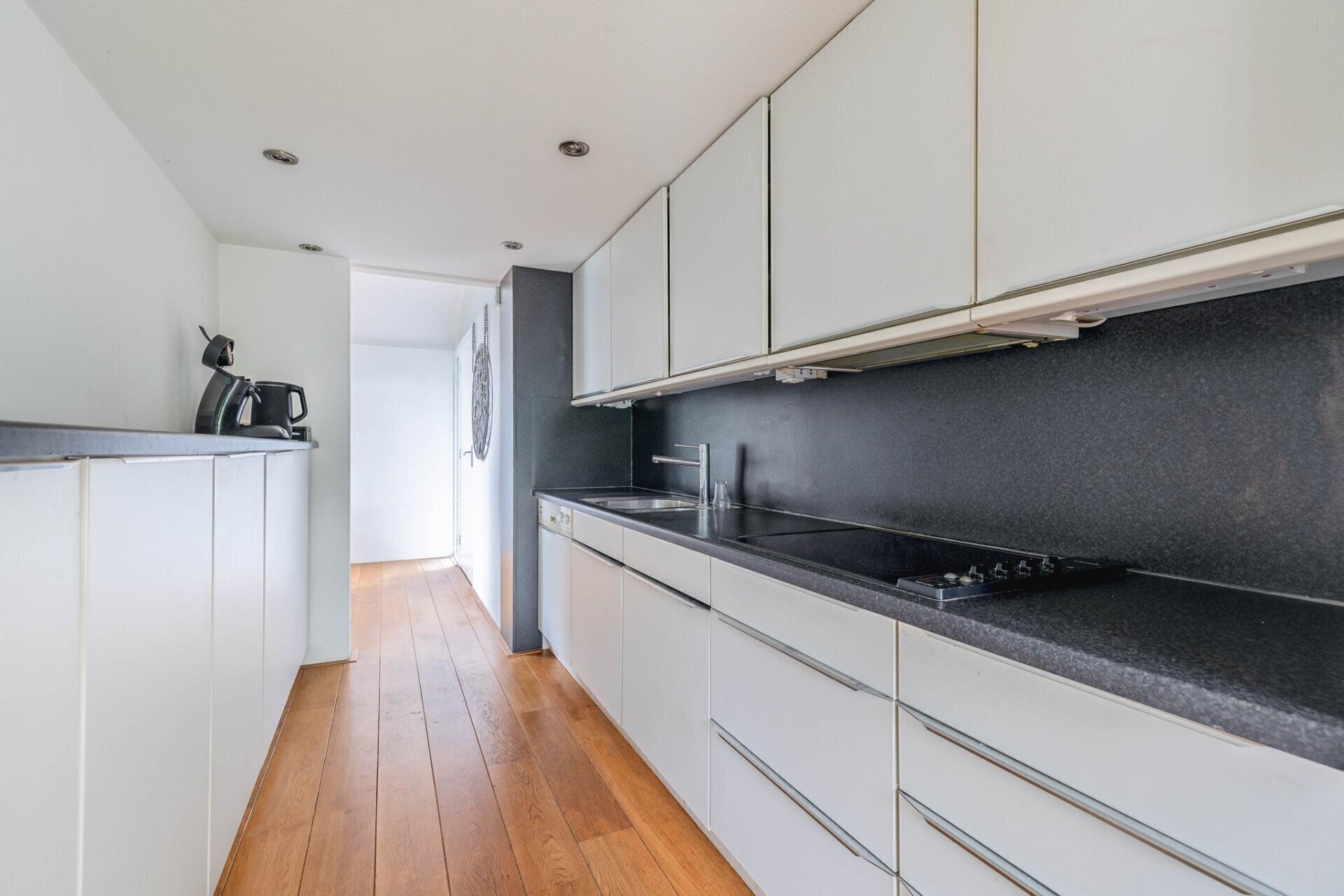De keuken is bereikbaar via de woonkamer en is uitgerust met diverse inbouwapparatuur zoals een vaatwasser, koelkast, oven, dubbele spoelbak en elektrische kookplaat met afzuiging. Naast de keuken bevindt zich een bijkeuken/berging met ruimte voor wasmachine, droger, extra witgoed en de cv-opstelling.