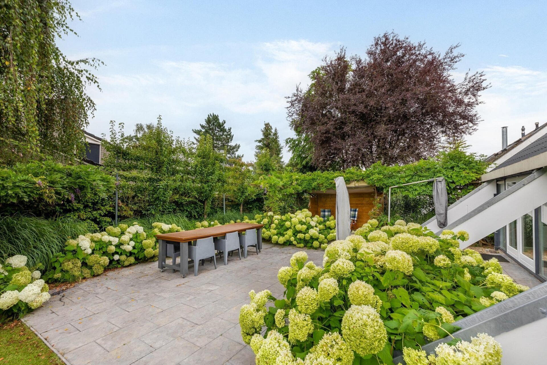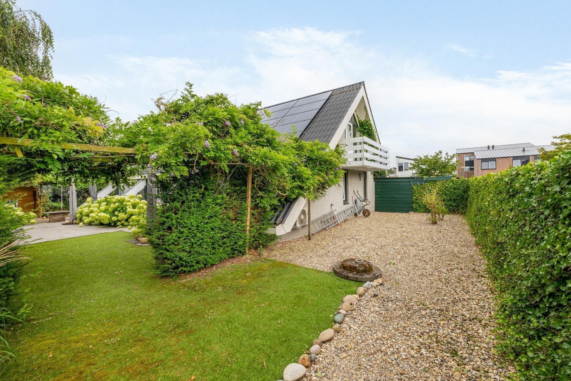 De woning is omgeven door een royale tuin met veel eigen buitenruimte en voldoende bergruimte. Aan de voorzijde is een ruime oprit met parkeergelegenheid voor twee auto's. Een schuifpoort aan de linkerzijde van de woning geeft toegang tot een zijtuin met grindwerk. De rechterzijde van de woning beschikt over een houten berging voor opslag of werkbank.