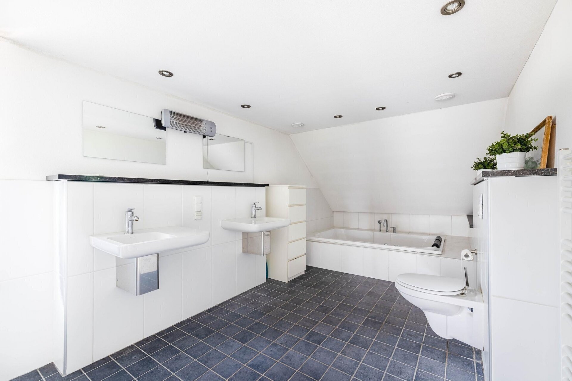 Aan de achterzijde van de woonkamer bevinden zich twee slaapkamers. De grootste slaapkamer heeft een inbouwkast en uitzicht over de voorzijde van de woning. De tweede slaapkamer is gerealiseerd in de voormalige garage en beschikt over een vaste kast. Tegenover deze slaapkamer bevindt zich een ruime badkamer met vloerverwarming, een ligbad met Whirlpool, zwevend toilet, twee wastafels, een inloopdouche en een handdoekenradiator.