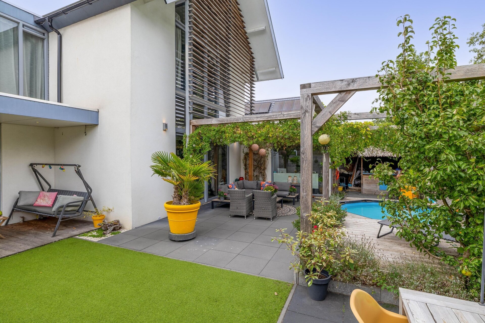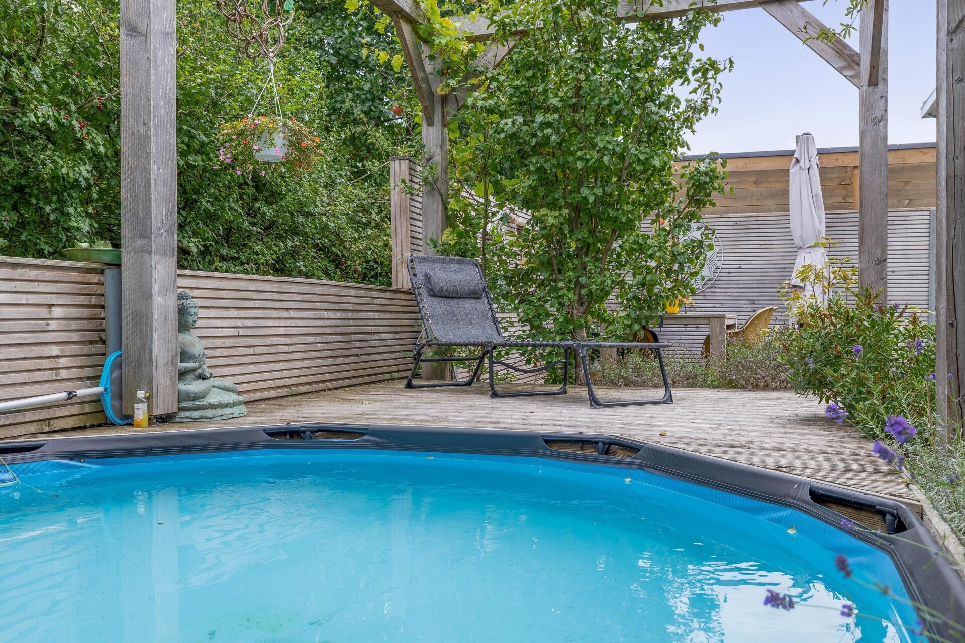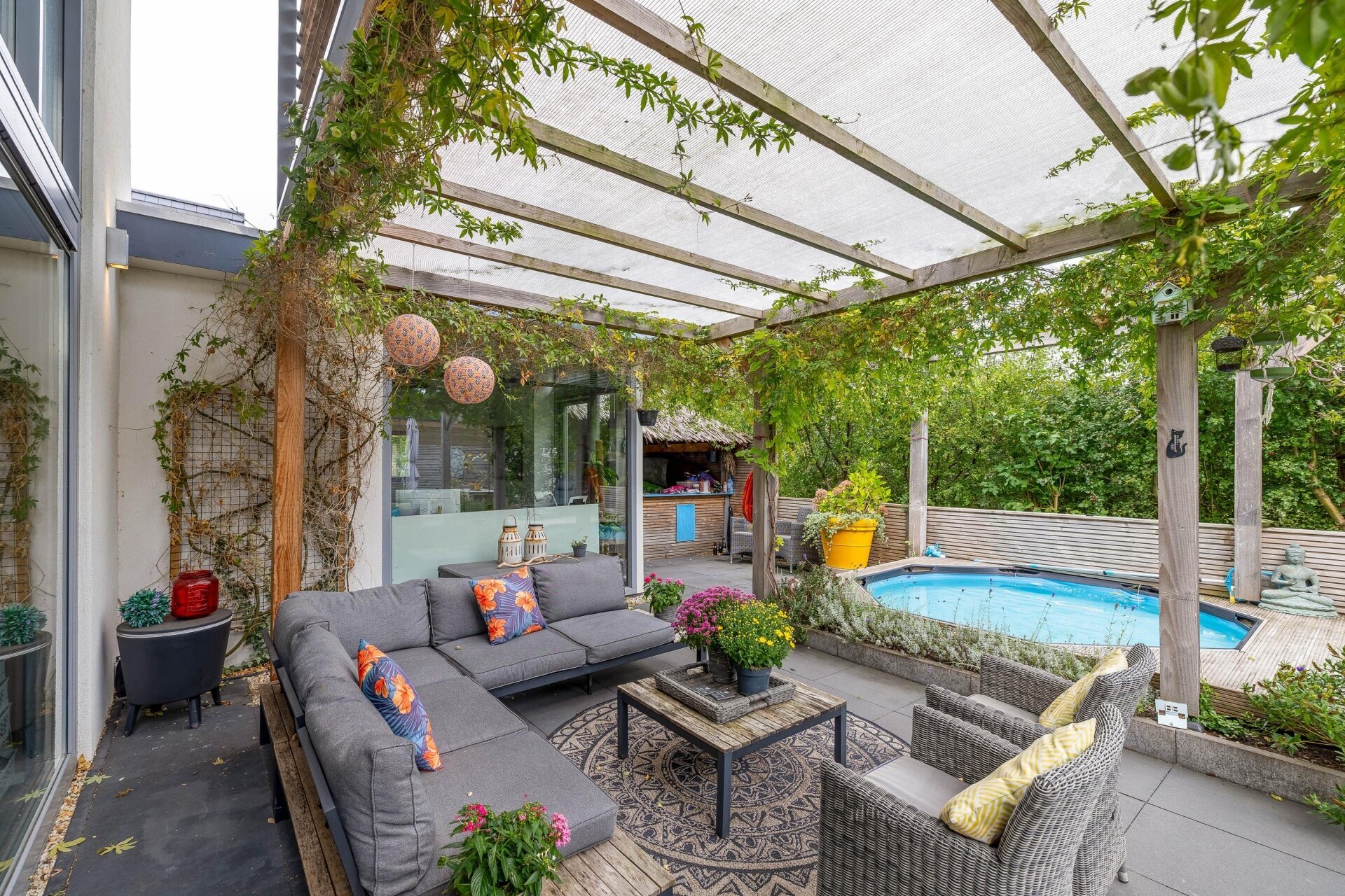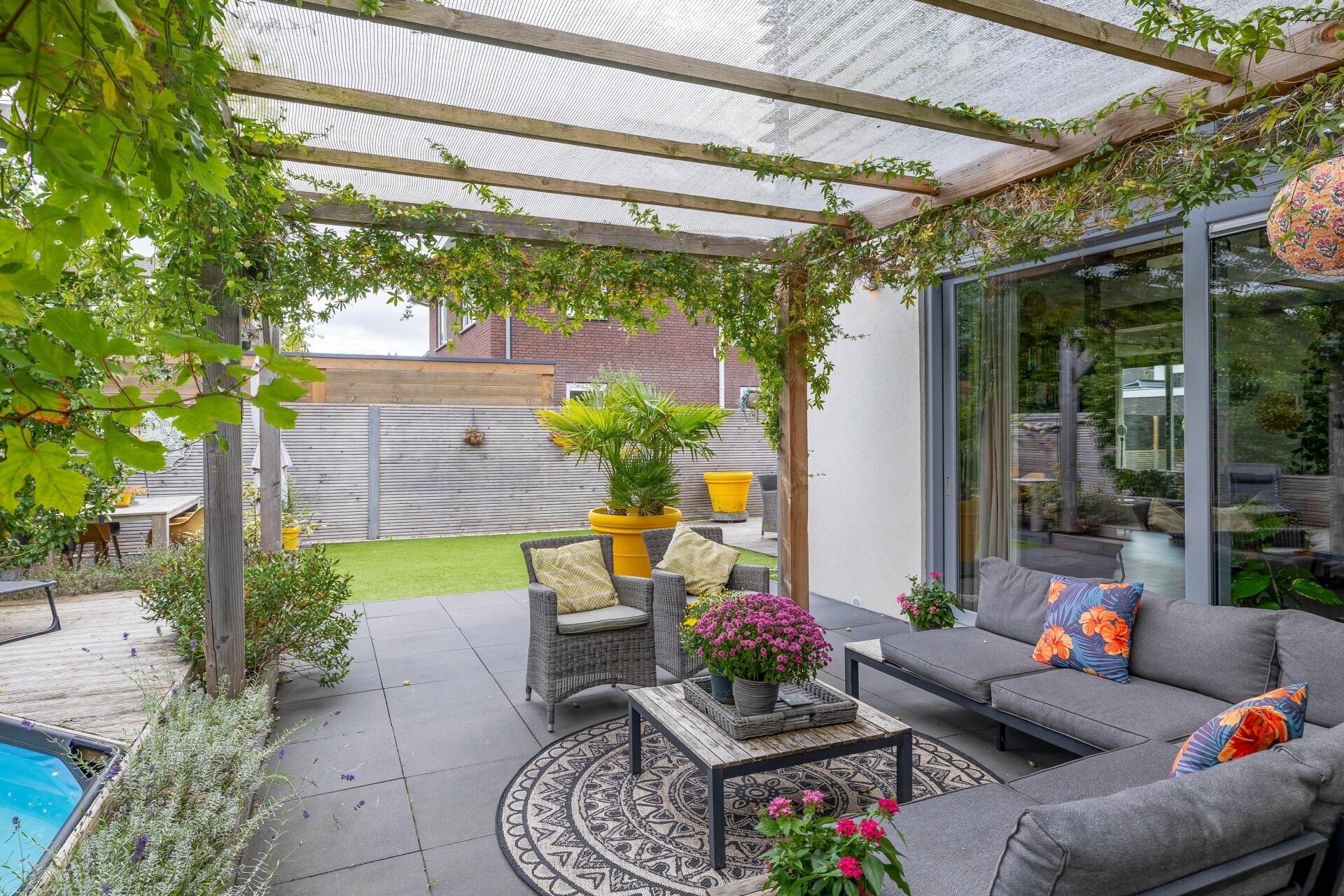 Buiten wacht een fraai aangelegde tuin, met buitenkeuken en klein zwembad die volop privacy biedt – waar u kunt ontspannen, gasten kunt ontvangen of genieten van lange zomeravonden. De royale oprit biedt plaats aan 3 auto’s en de inpandige garage maken het geheel compleet.