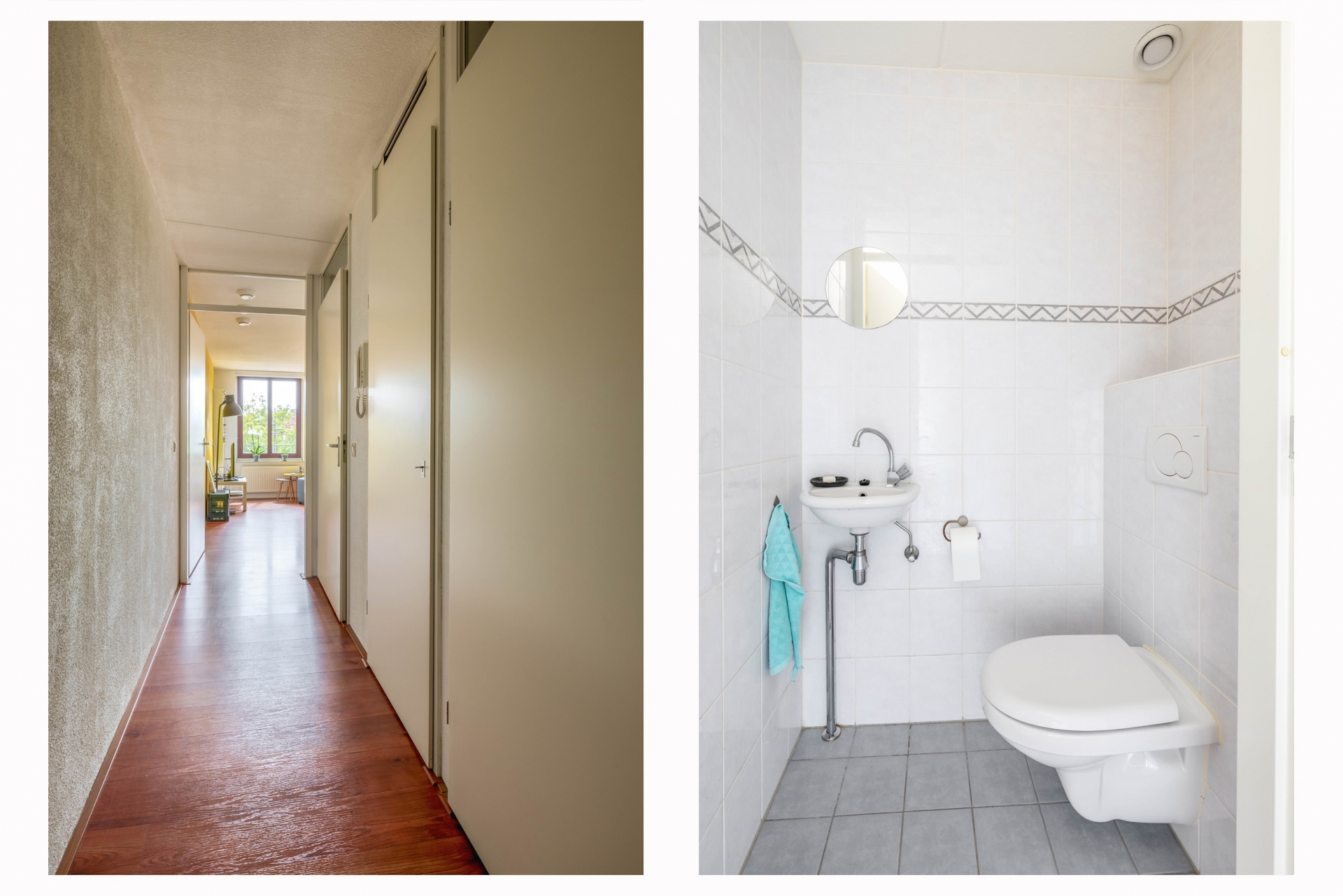 De hal geeft toegang tot een modern betegeld toilet en een praktische inpandige berging met opstelling voor de cv-installatie en mechanische ventilatie. Aan de voorzijde ligt de eerste slaapkamer, ideaal als werkkamer, hobbyruimte of logeerkamer.