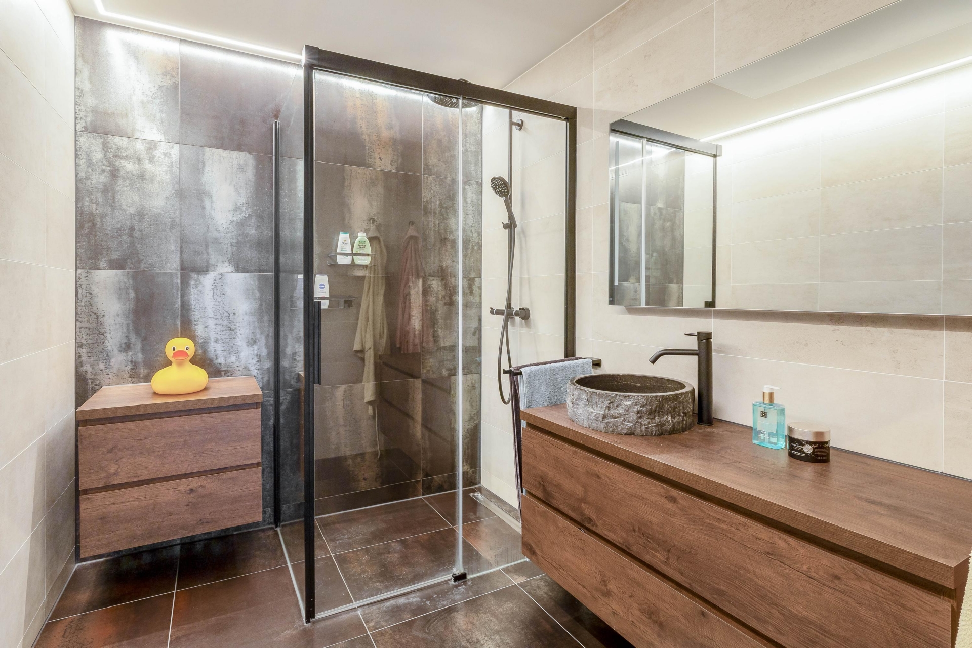 De badkamer (2022) is stijlvol afgewerkt en voorzien van alle comfort. Denk aan een volledig betegelde ruimte met een inloopdouche, een modern wastafelmeubel met natuurstenen waskom en goede verlichting. Ook deze ruimte is perfect onderhouden.