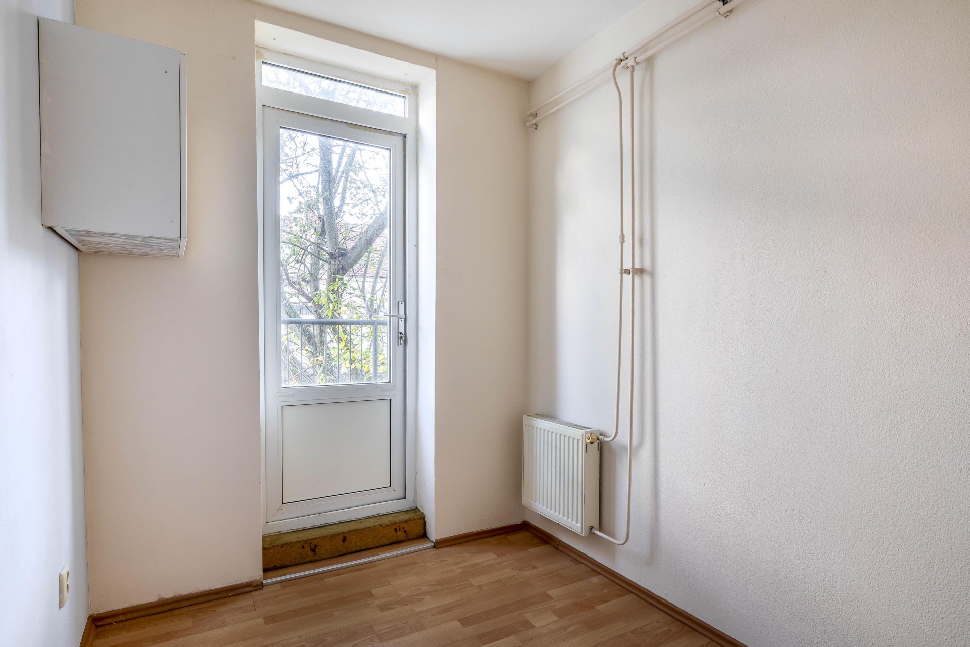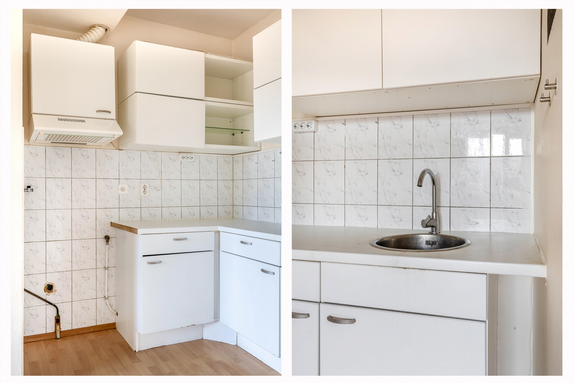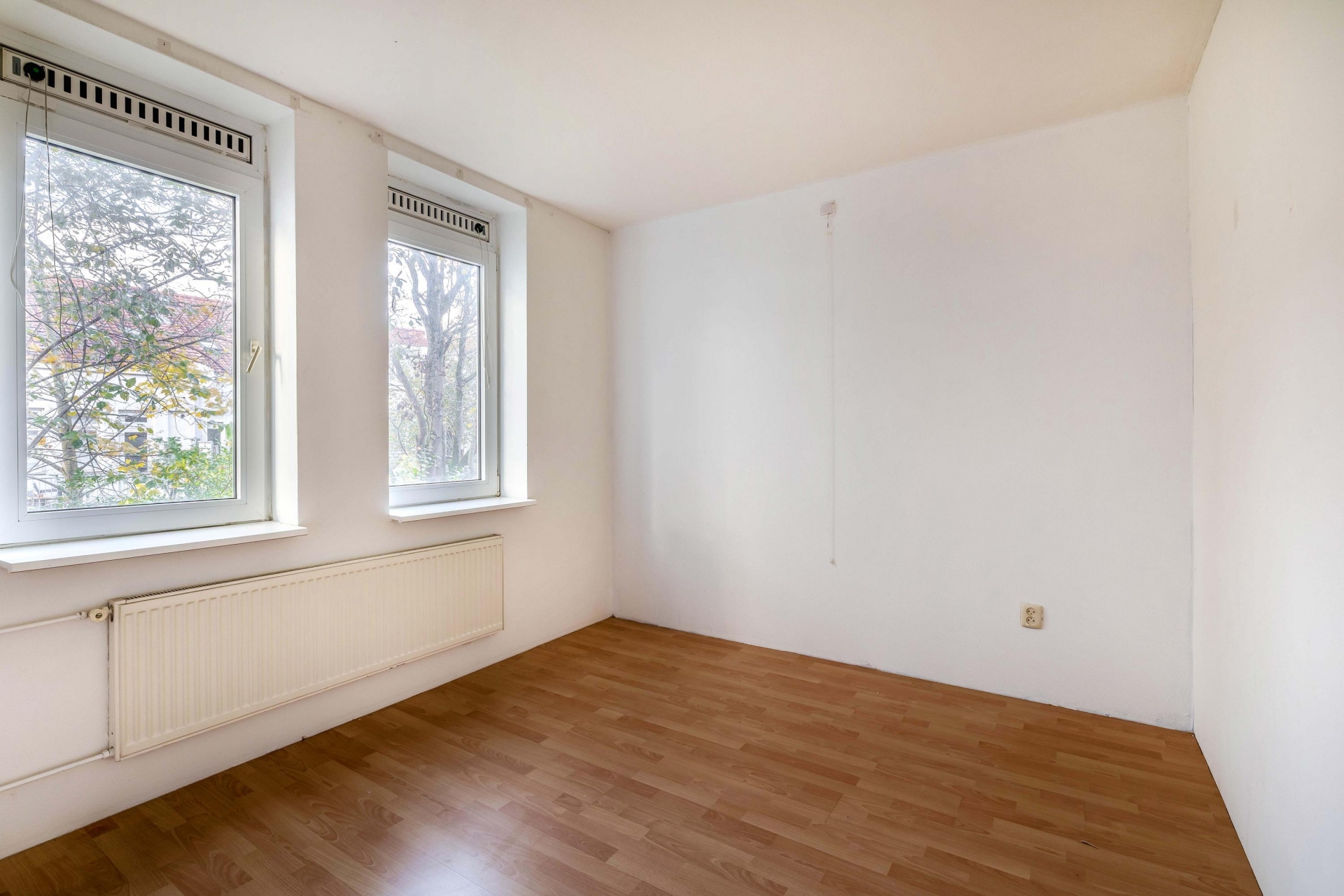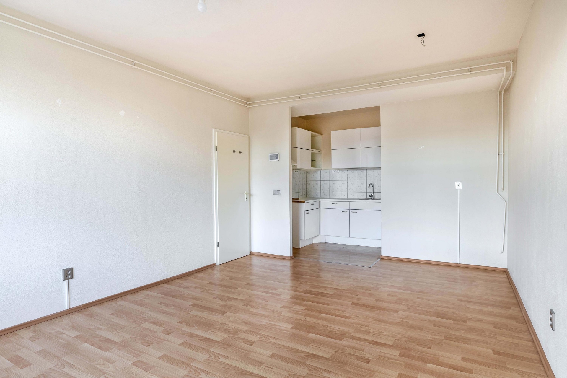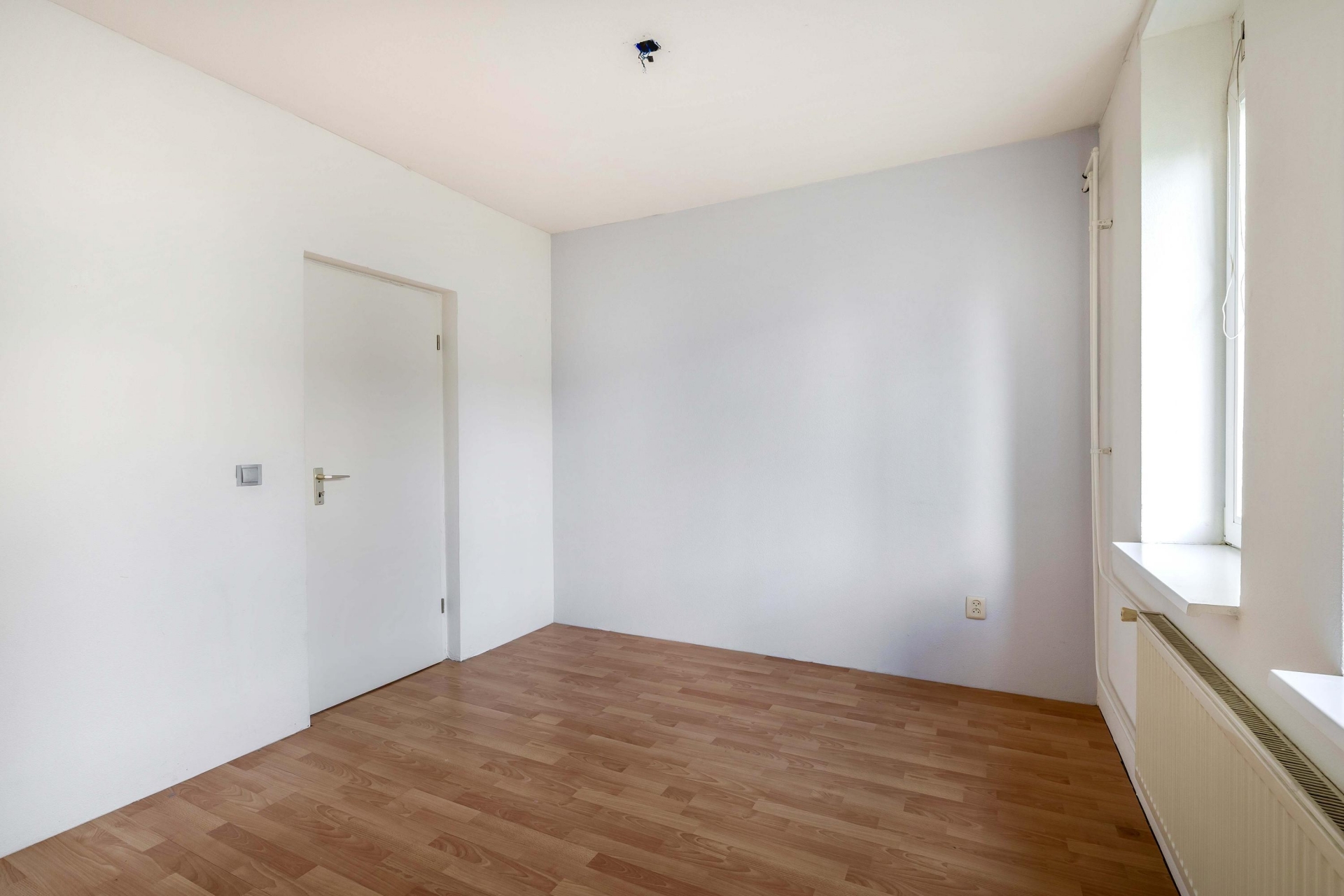 Zodra je binnenkomt, valt de frisse, lichte woonkamer op. De laminaatvloer geeft het geheel een verzorgde uitstraling en zorgt voor een prettige basis in elke woonstijl. De halfopen keuken sluit er soepel op aan: open genoeg voor gezelligheid, maar net beschut genoeg om het kookdeel een eigen hoek te geven. Hier kook je ontspannen, met ruimte voor een bakkie of een borrel terwijl je staat te roeren in de pan.