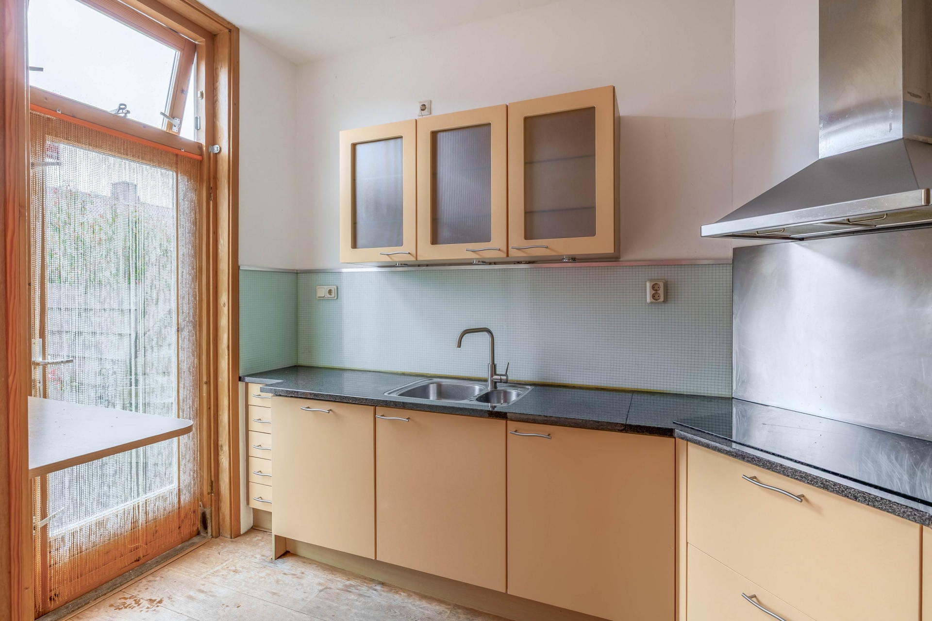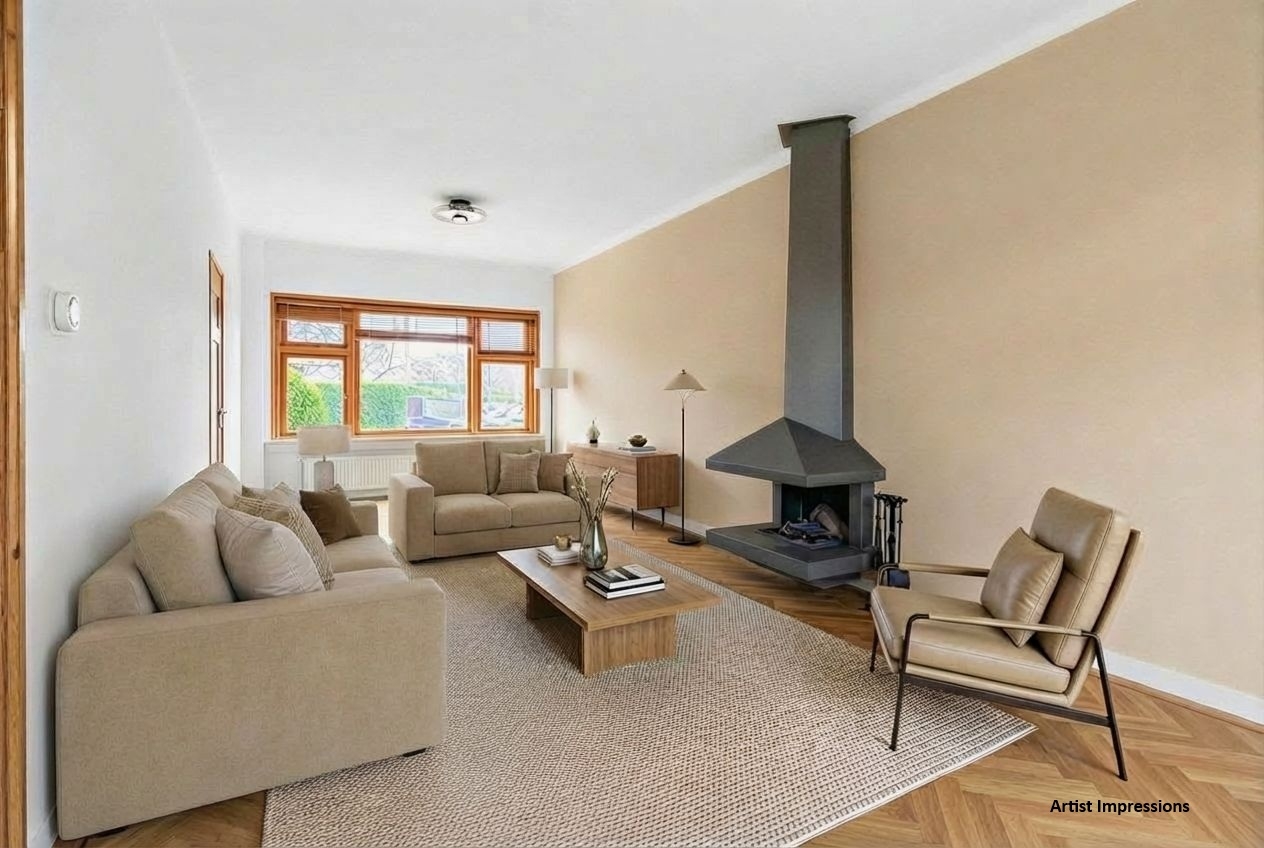 De woonkamer is heerlijk licht dankzij de grote raampartijen en biedt meer dan genoeg plek voor een royale zithoek en een grote eettafel. Hier woon je comfortabel, met alle ruimte voor het dagelijks leven. Tegelijkertijd is dit zo’n huis waar je met wat modernisering echt iets eigens kunt neerzetten.
