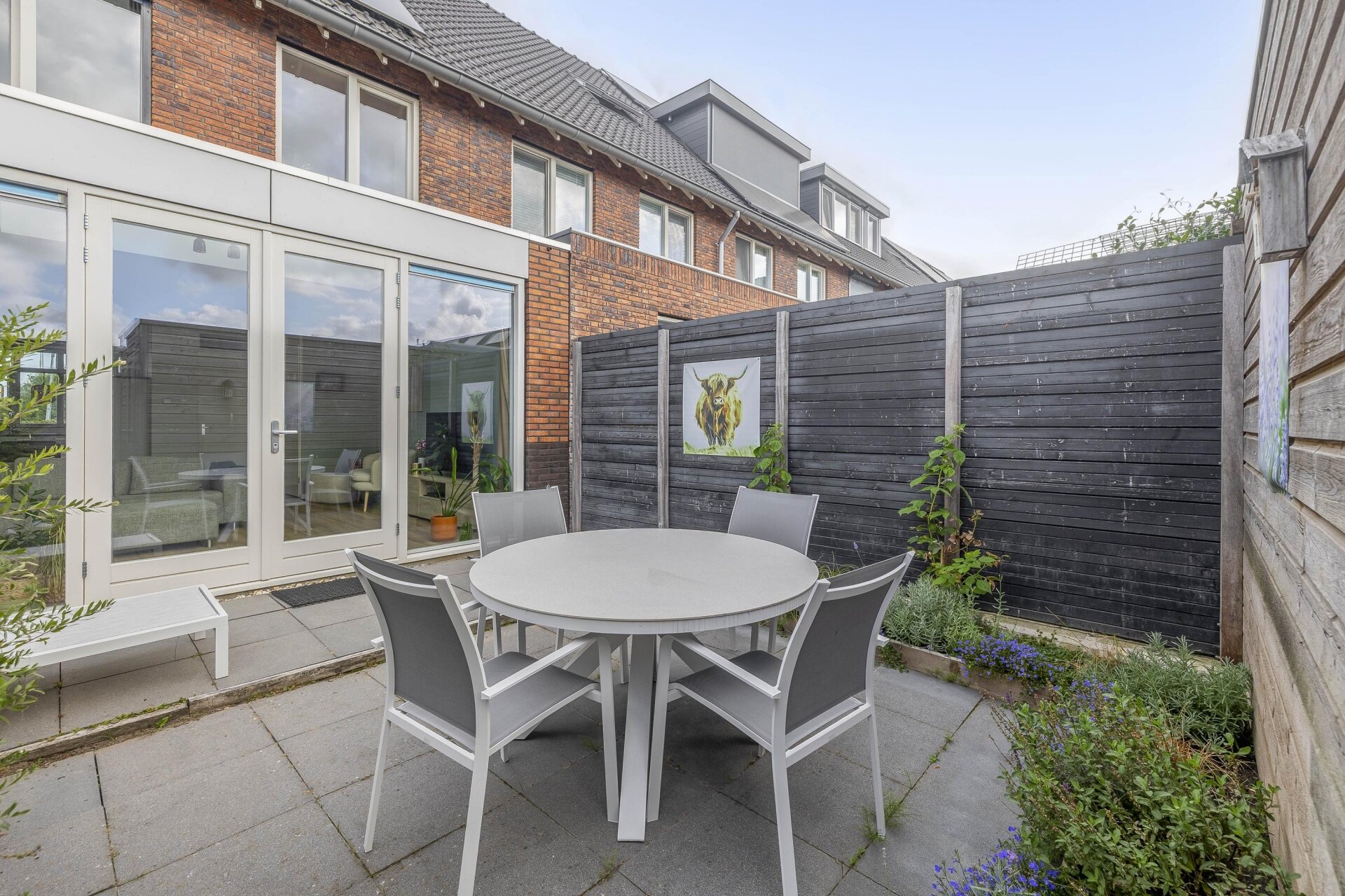 De achtertuin ligt pal op het zuiden: een groot pluspunt voor iedereen die graag buiten leeft. Hier kun je al vroeg in het voorjaar tot laat in de avond genieten van de zon. Het terras is praktisch aangelegd en biedt genoeg ruimte voor een eettafel en loungehoek. Achterin de tuin een houten berging en toegang tot het achterpad.