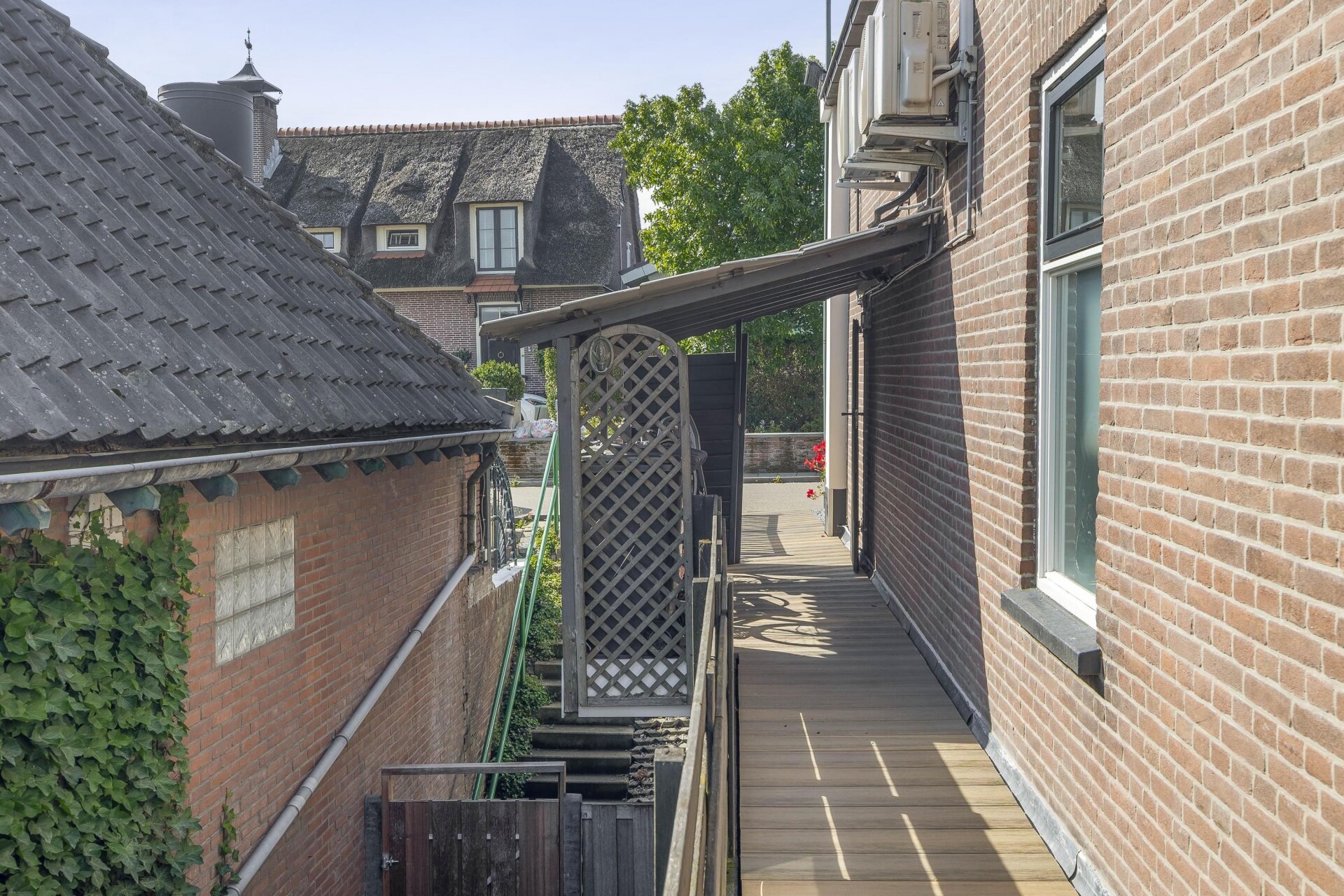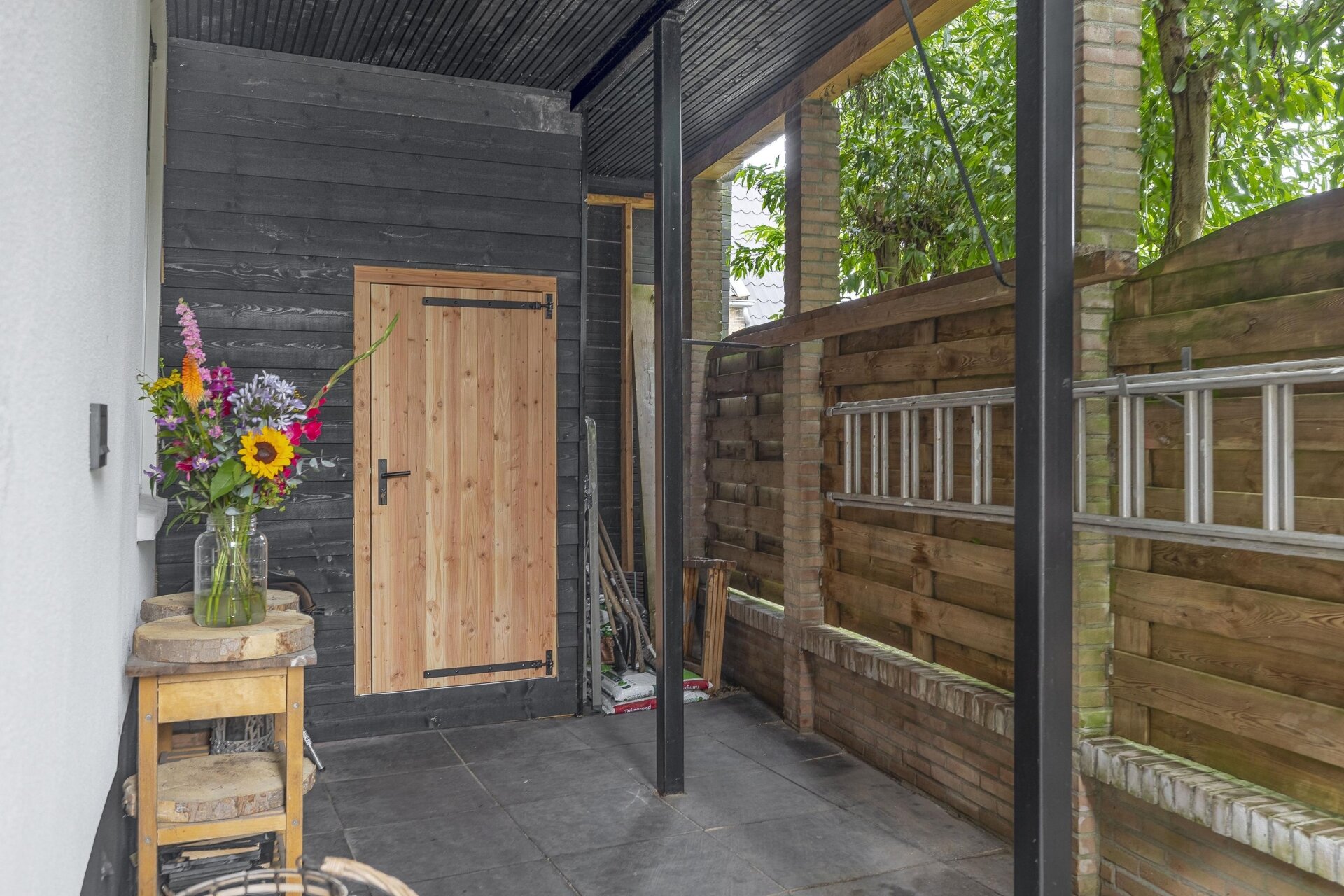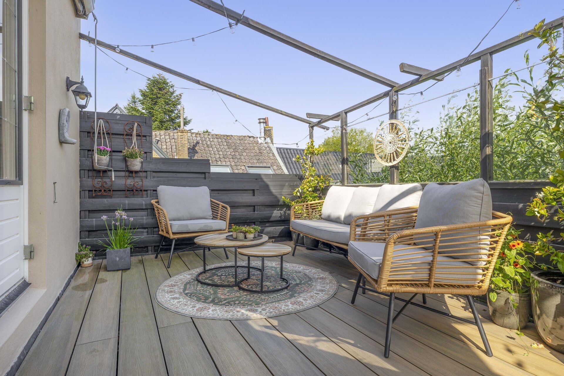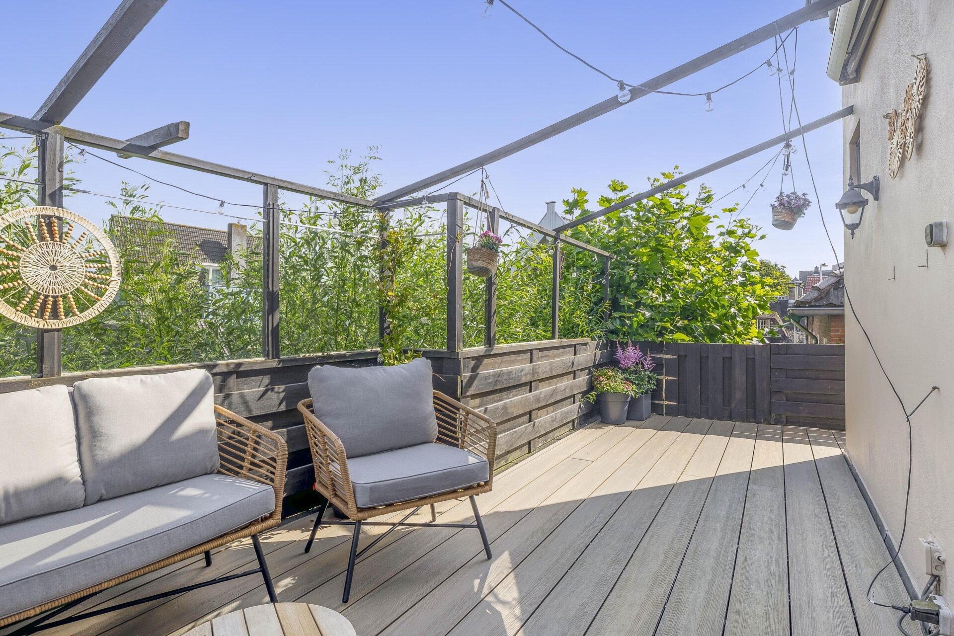 De aangrenzende keuken is praktisch ingedeeld, voorzien van alle moderne gemakken en beschikt over veel bergruimte. De combinatie van sfeervolle details met hedendaags comfort zorgt voor een fijne plek waar koken vanzelf ontspanning wordt. Het terras aan de achterzijde is een verlengde van de woonkeuken.