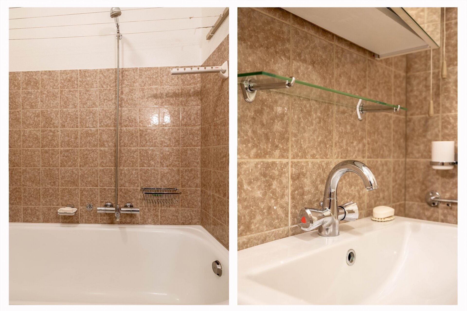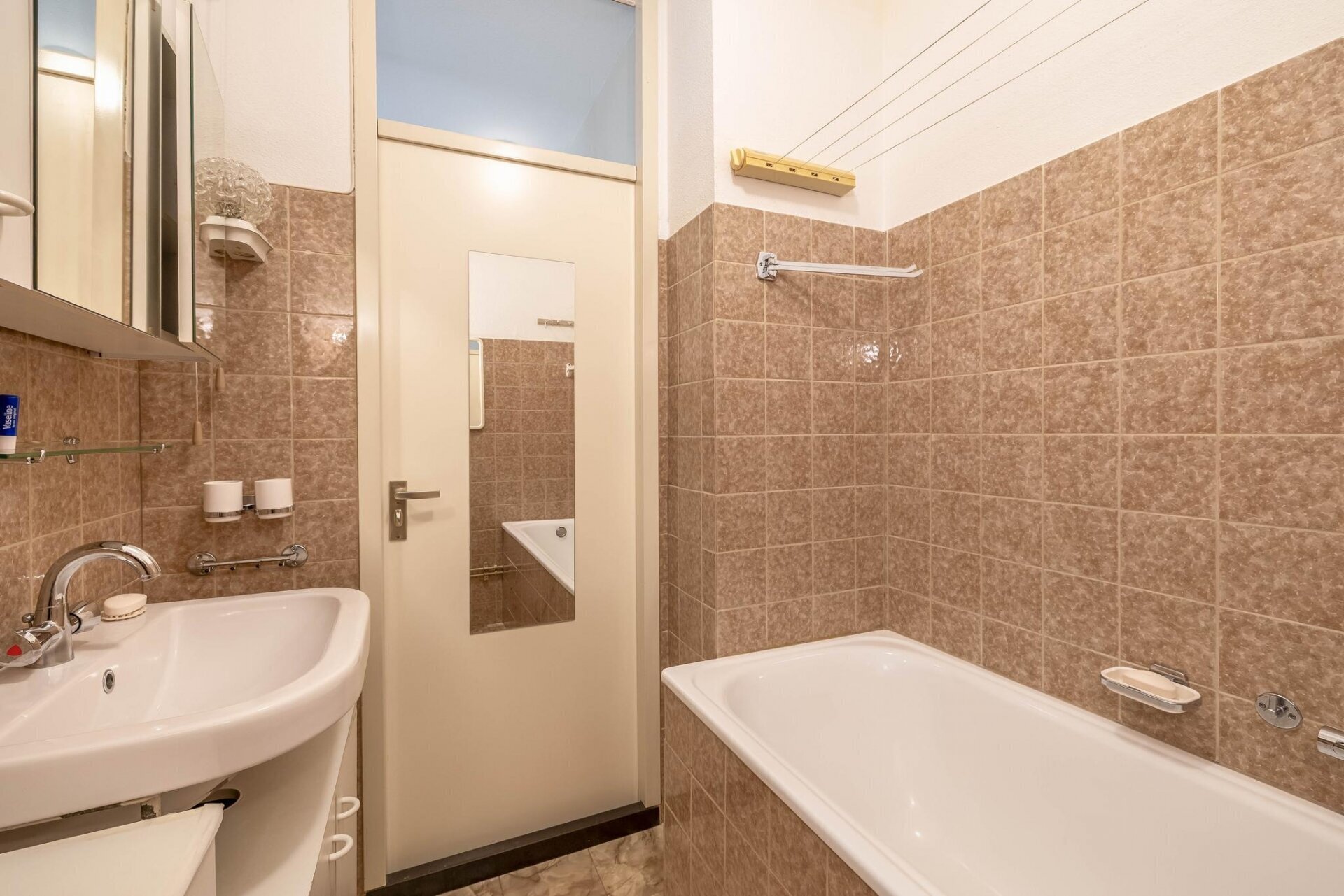 Aan de linkerzijde bevindt zich de badkamer, voorzien van een bad-douchecombinatie, een wastafelmeubel en een aansluiting voor de wasmachine. Direct naast de badkamer is een separaat toilet met fonteintje.