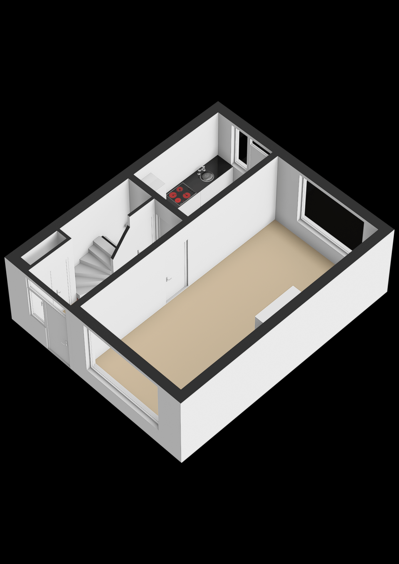 Begane grond: Entree, hal, meterkast, trapopgang naar de bovengelegen verdiepingen, betegelde toiletruimte met en fonteintje en toegang tot de woonkamer. Vanuit de hal komt u terecht in de verrassend ruime doorzonkamer. Aan de achterzijde van de woning bevindt zich de keuken. Vanuit de keuken heeft u toegang tot de royale achtertuin welke is gelegen op het westen. Deze diepe achtertuin is voorzien van een eigen stenen berging en achterom.