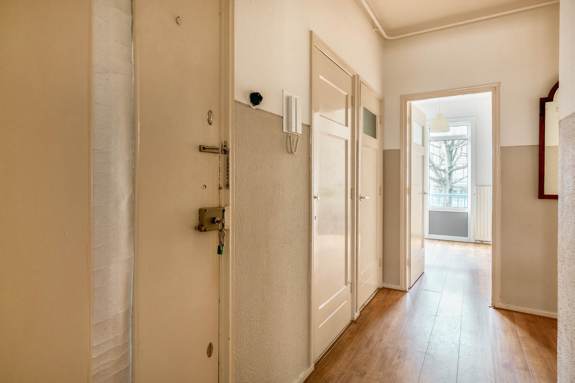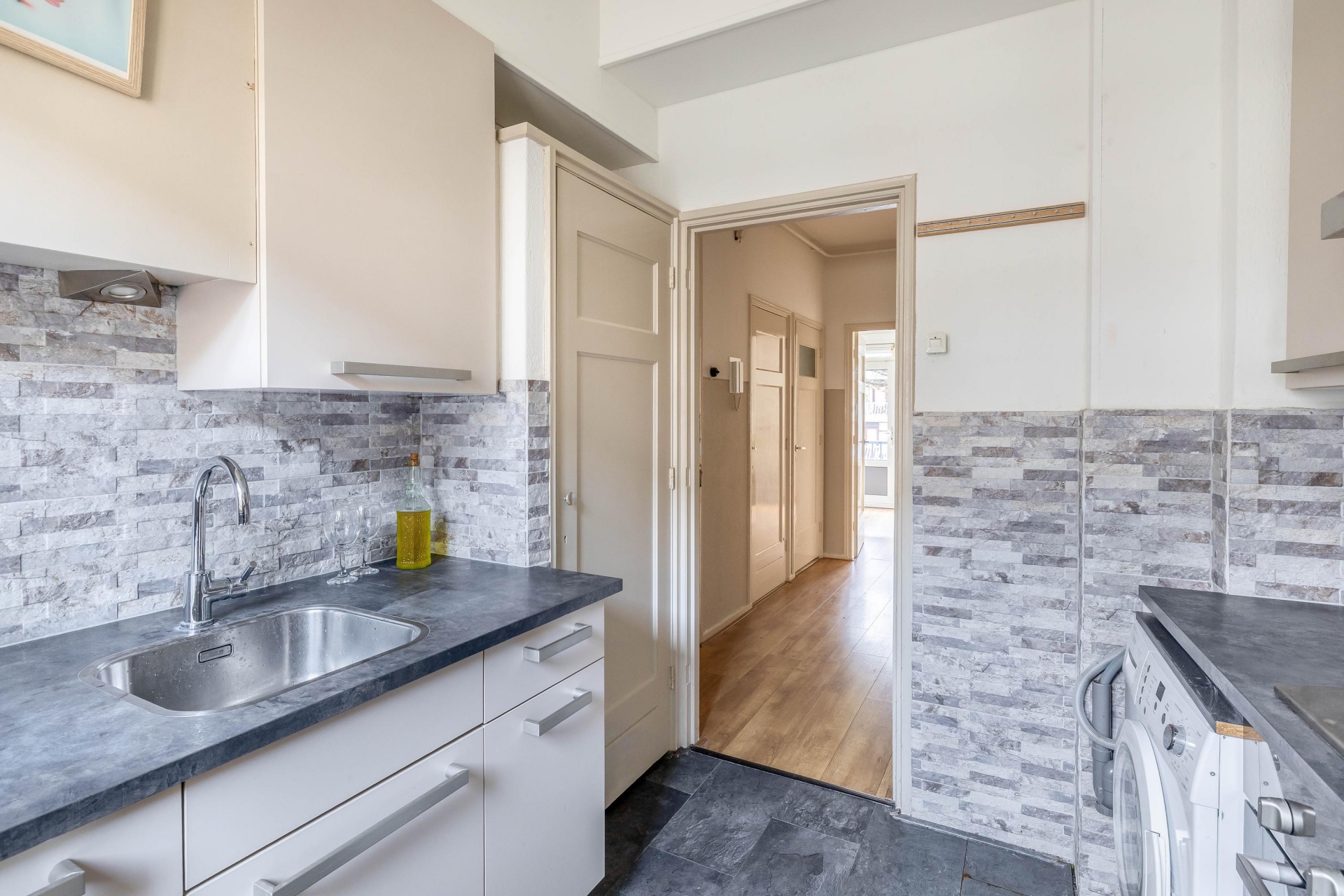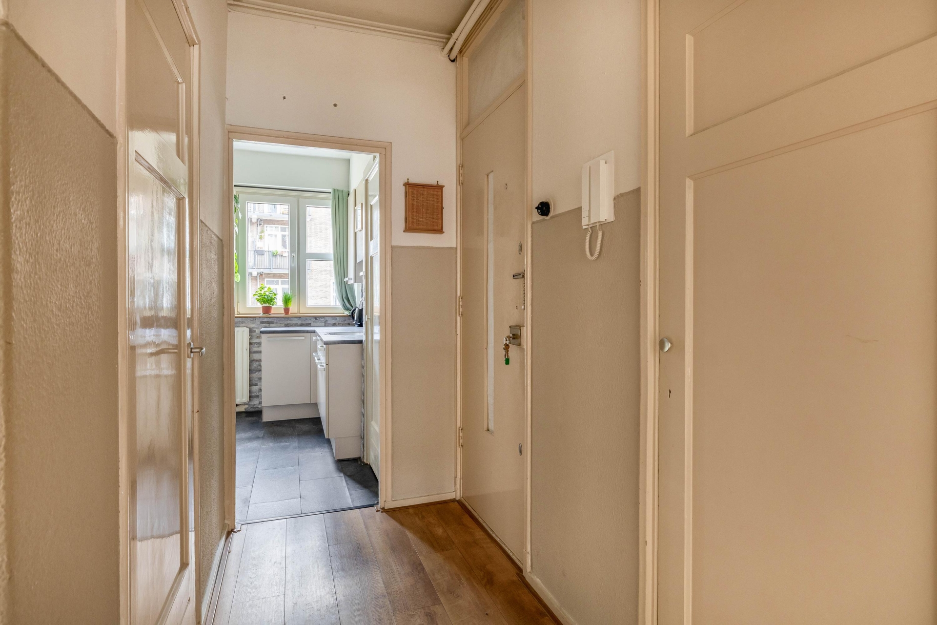 Aan de achterzijde vind je de gesloten keuken, ideaal als je geen fan bent van kookluchtjes in je woonkamer. De keuken verkeerd in een nette staat en bied gelijk toegang tot het balkon. Dit ligt aan de rustige achterzijde van het pand, perfect voor een kop koffie in de ochtendzon of een borrel aan het eind van de dag.