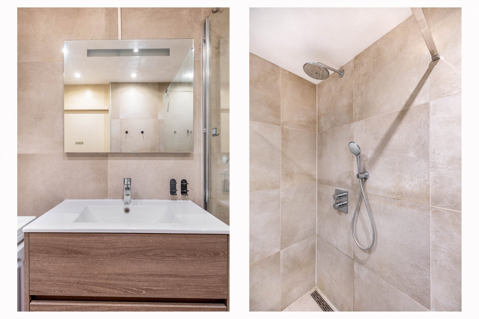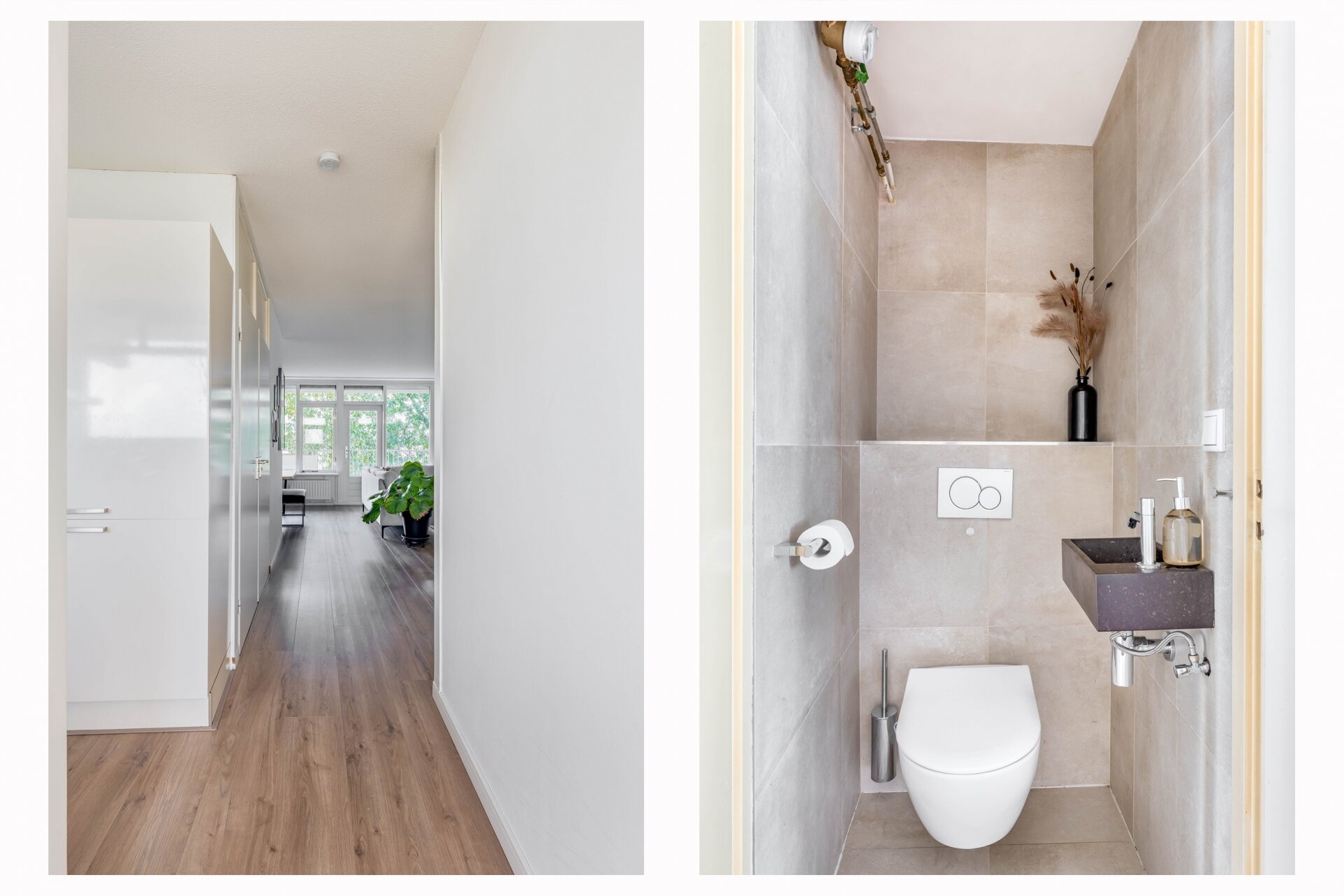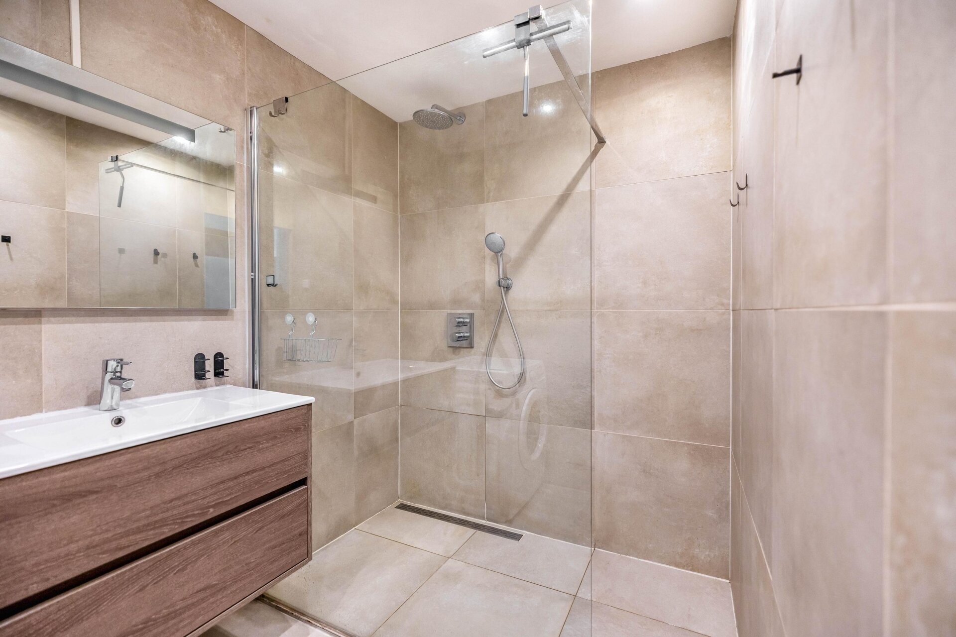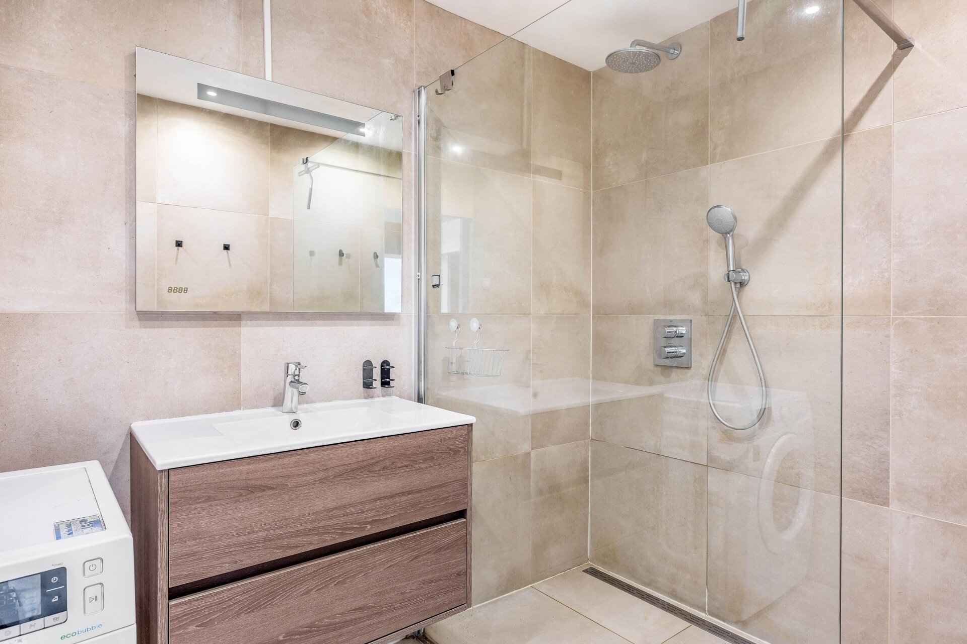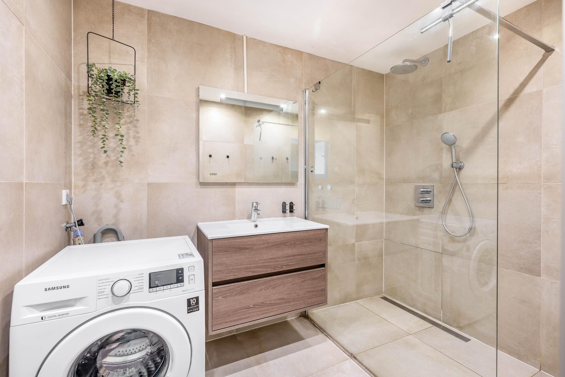 De keuken is uitgevoerd in een moderne, matte stijl met een rustige uitstraling. Dankzij de praktische indeling, ruime werkbladen en complete inbouwapparatuur kook je hier met plezier. De badkamer sluit daar naadloos op aan: stijlvol afgewerkt met luxe tegels, voorzien van een inloopdouche, wastafelmeubel en een aansluiting voor de wasmachine. Alles straalt kwaliteit uit, klaar om zo te betrekken.