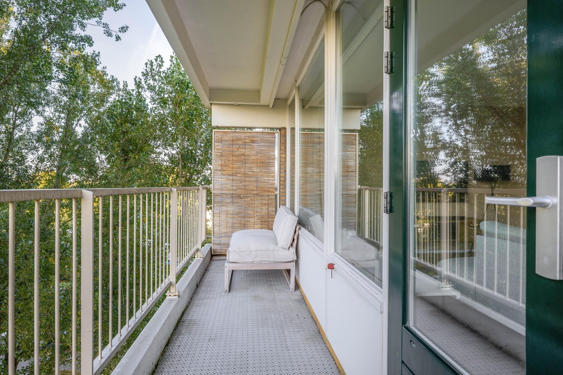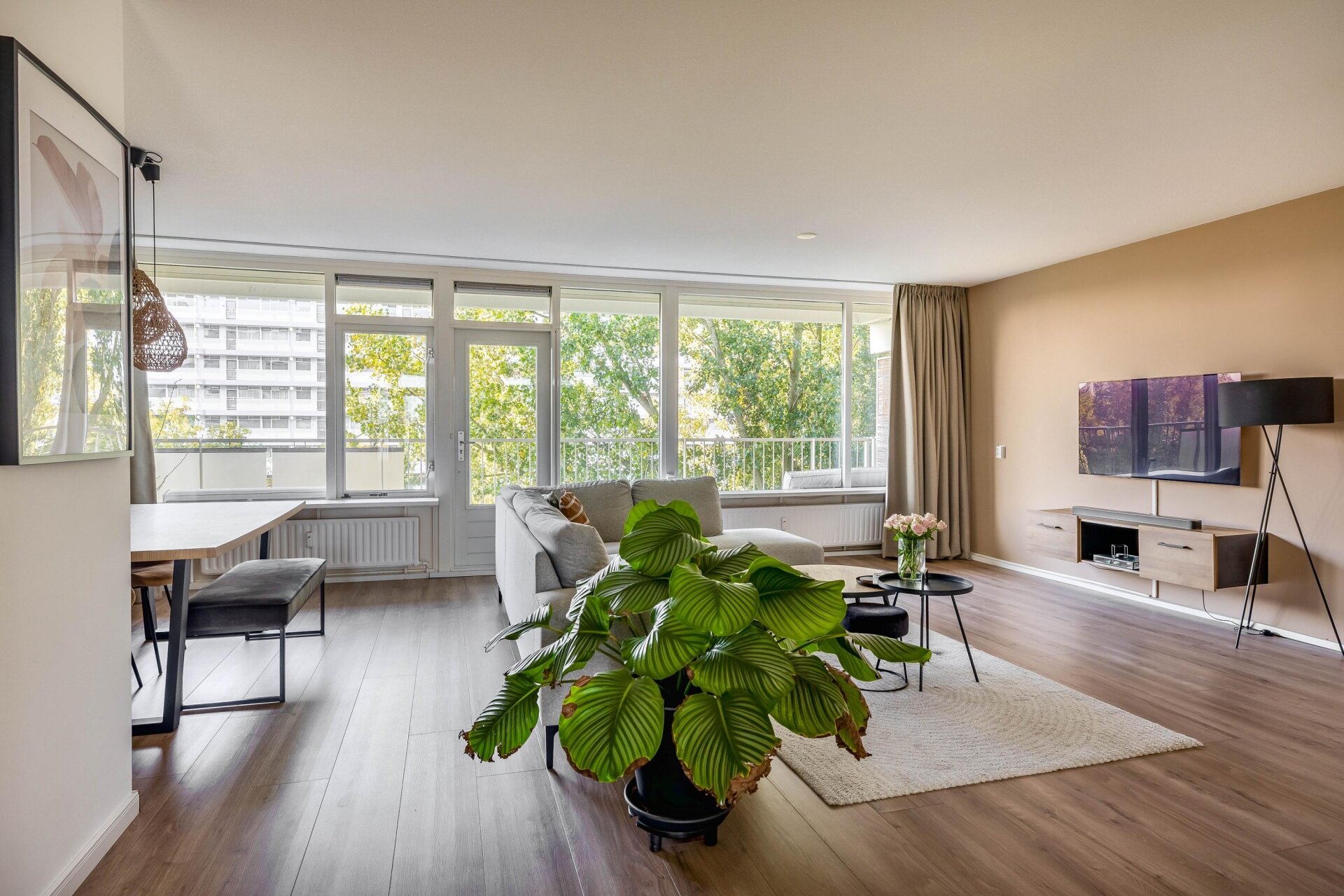 De woonkamer is royaal opgezet en oogt nog ruimer dankzij de grote raampartijen die het daglicht overvloedig binnenlaten. Vanuit hier stap je zo het zonnige balkon op het zuidwesten op, waar je tot in de late uurtjes kunt genieten van de zon. Dankzij de slimme indeling is er volop ruimte voor een comfortabele zithoek én een sfeervolle eethoek.