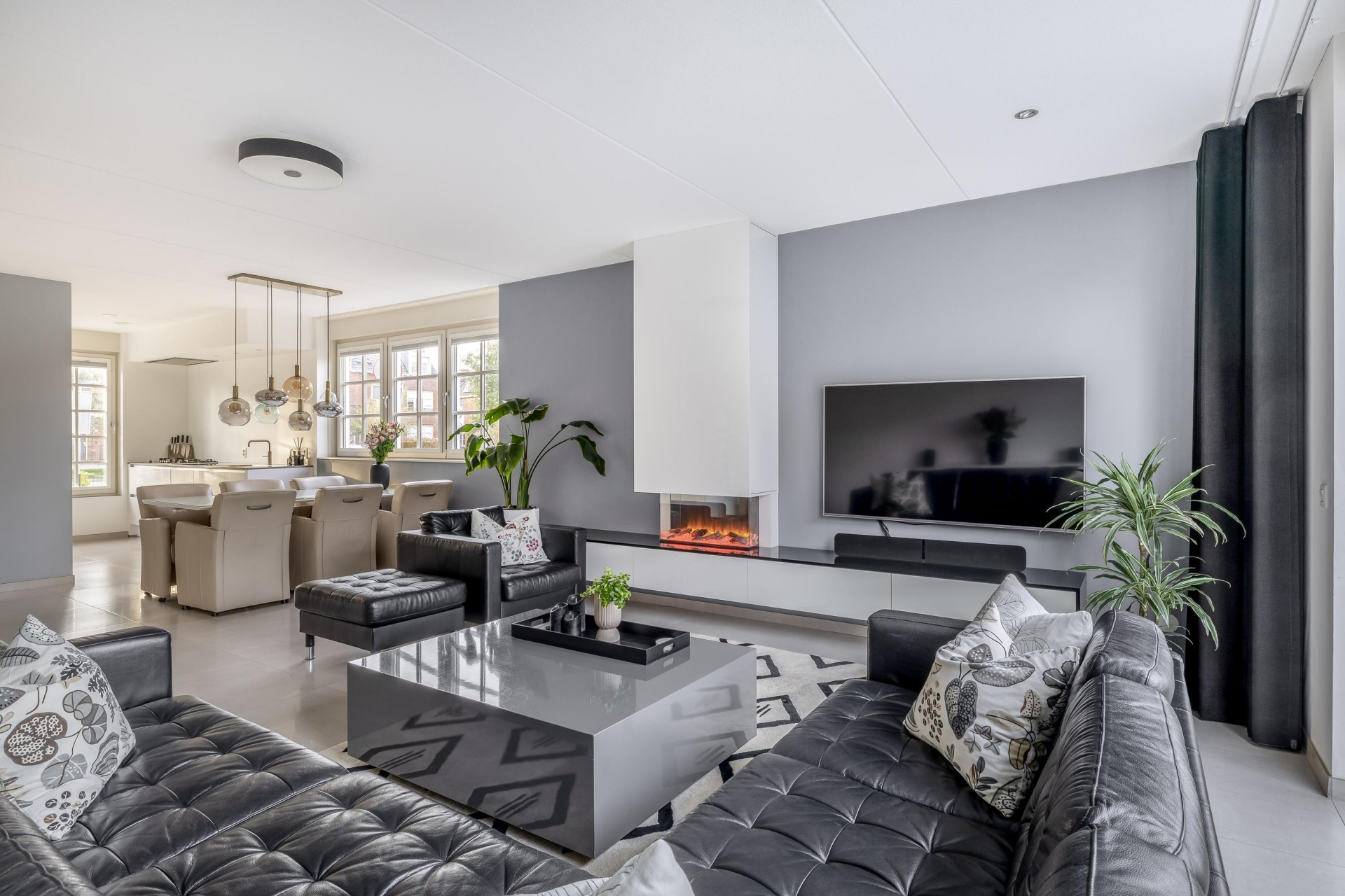 De woonkamer straalt een combinatie van warmte en luxe uit, met een moderne afwerking, grote raampartijen en een fraaie tegelvloer die doorloopt over de gehele begane grond (met vloerverwarming). Dankzij de hoekligging profiteer je van extra veel lichtinval. De leefruimte is open, overzichtelijk en biedt plek voor zowel een comfortabele zithoek als een royale eettafel. De ingebouwde haard en strakke afwerking maken het geheel helemaal af.