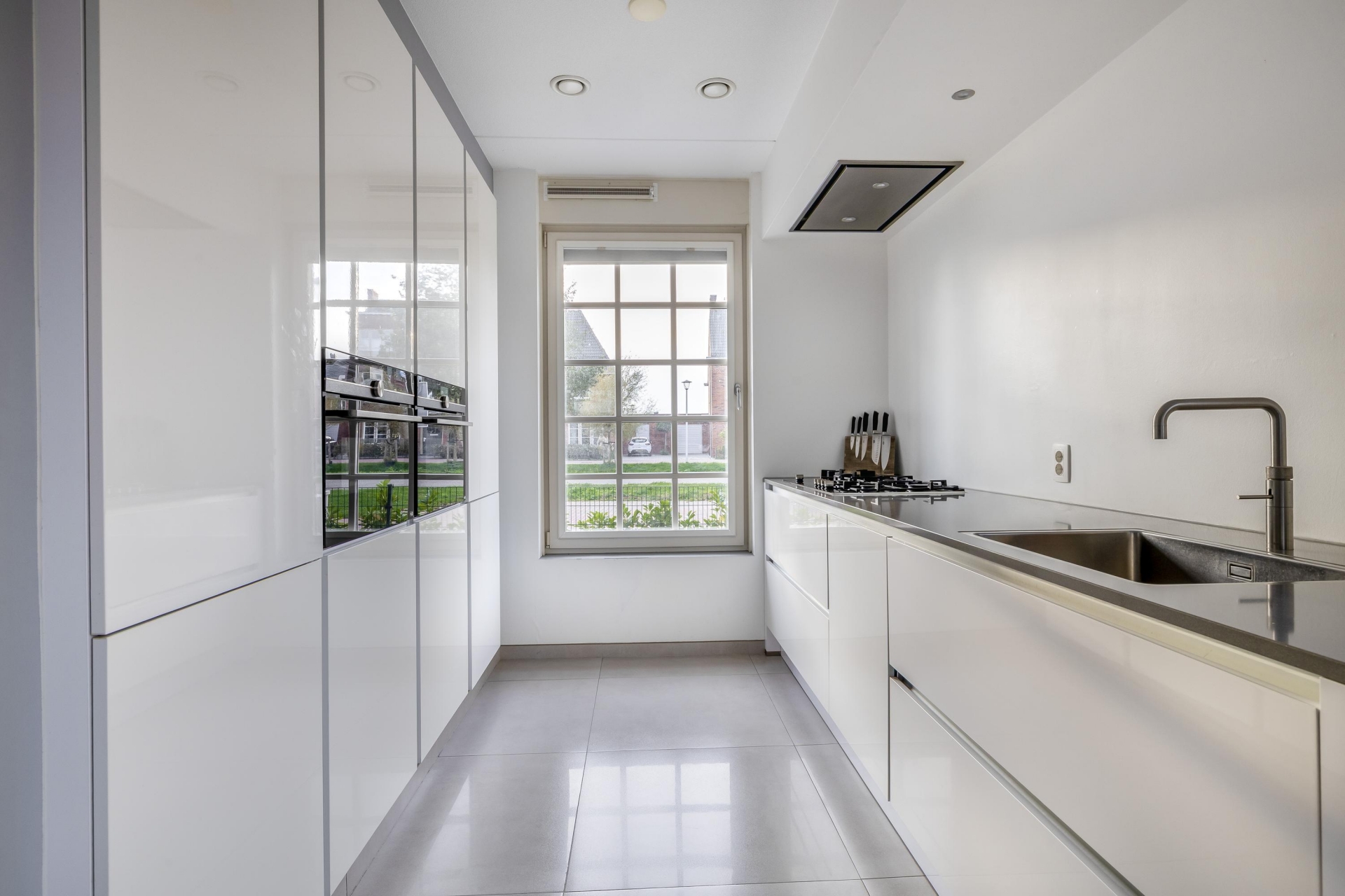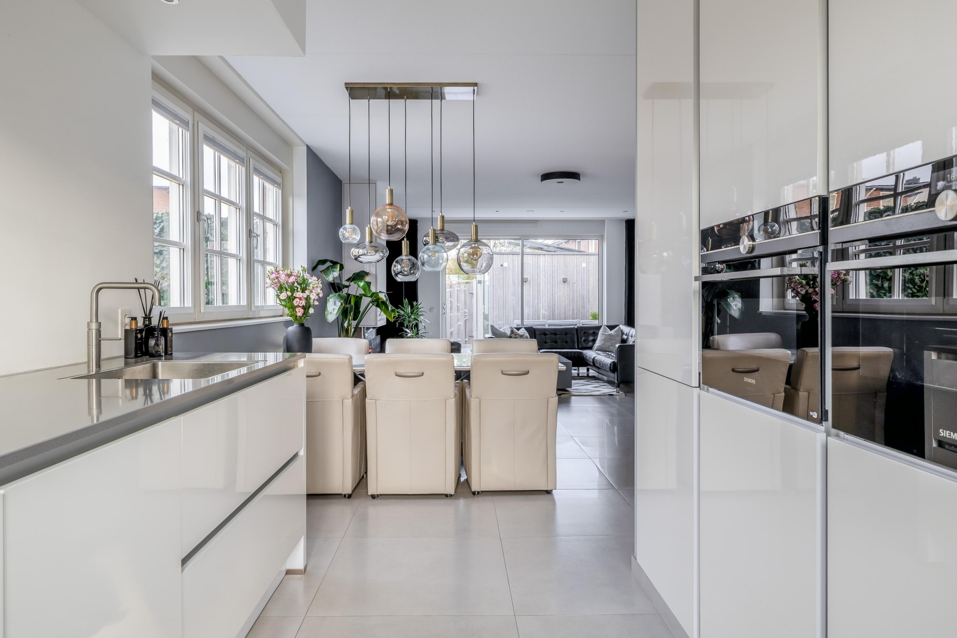 De open keuken aan de voorzijde is modern uitgevoerd met greeploze kasten, een vijfpits gaskookplaat, afzuiging verwerkt in het plafond en een strak werkblad. Vanuit hier kijk je fijn uit over de rustige straat. Ook de hal is tot in de puntjes verzorgd, met inbouwverlichting in de trap die zorgt voor een sfeervolle binnenkomst.