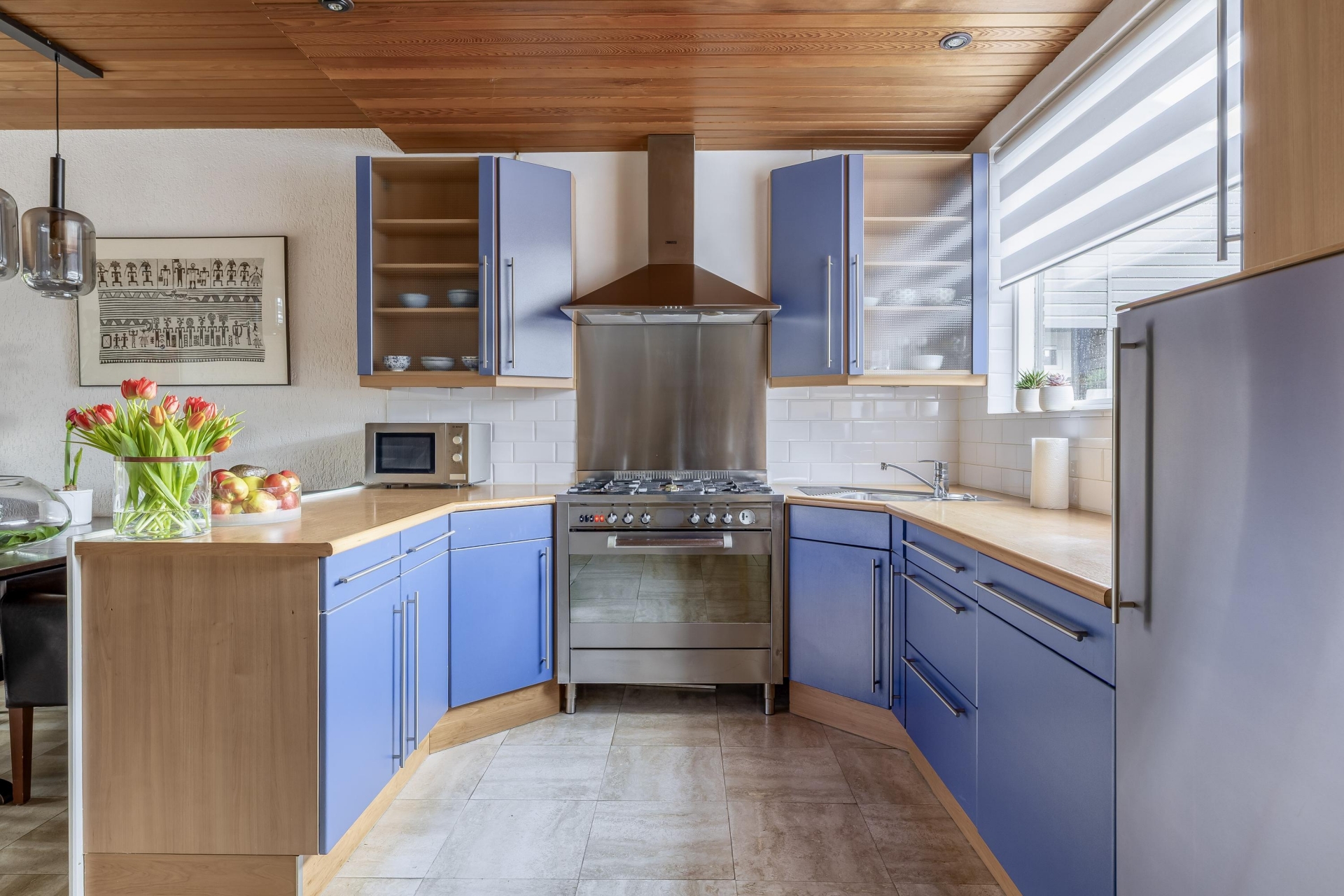 Keuken aan de voorzijde voorzien van een koelkast met vriesvak, vaartwasser, 5 pits gasfornuis, oven, afzuigkap en draaicarrousel.