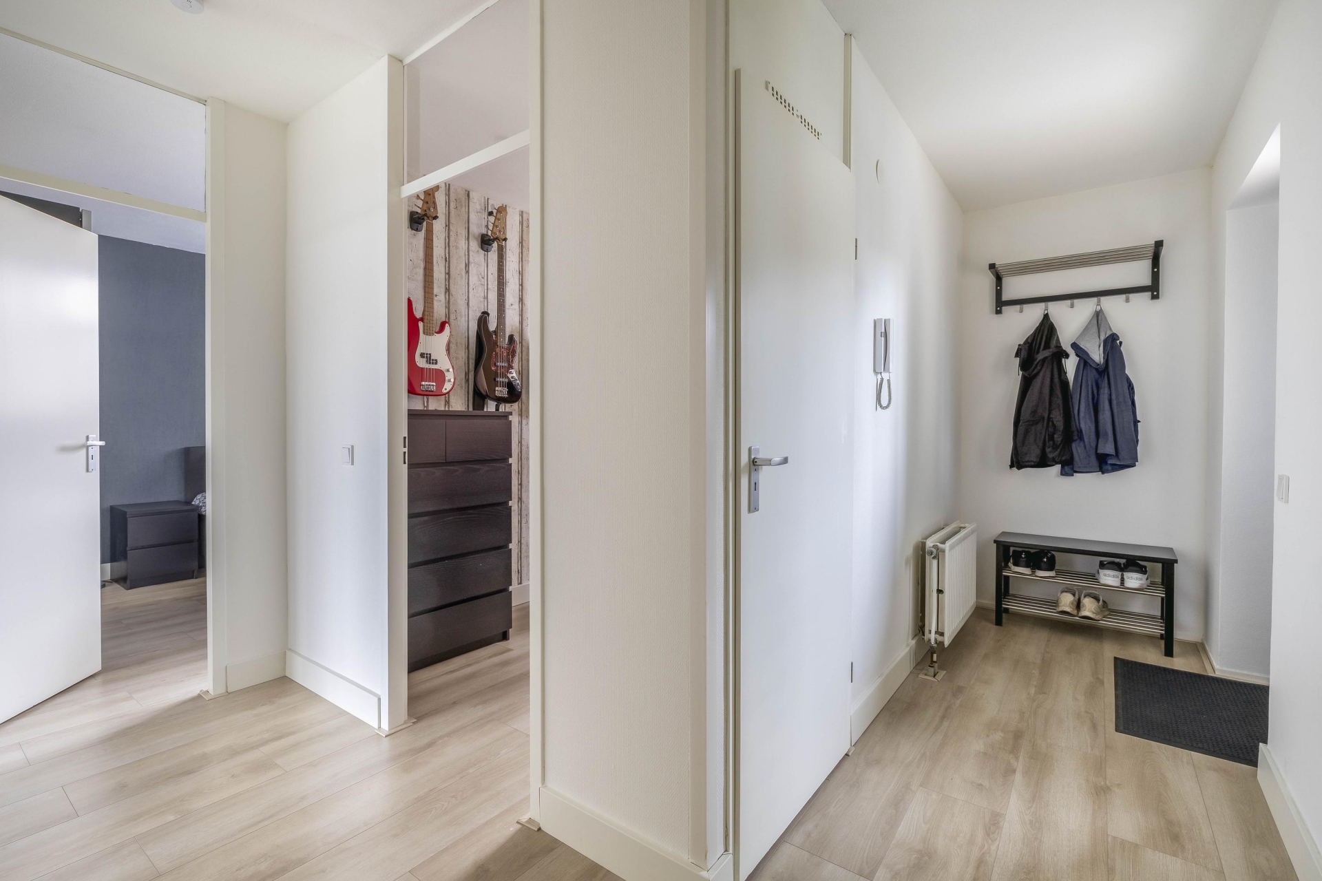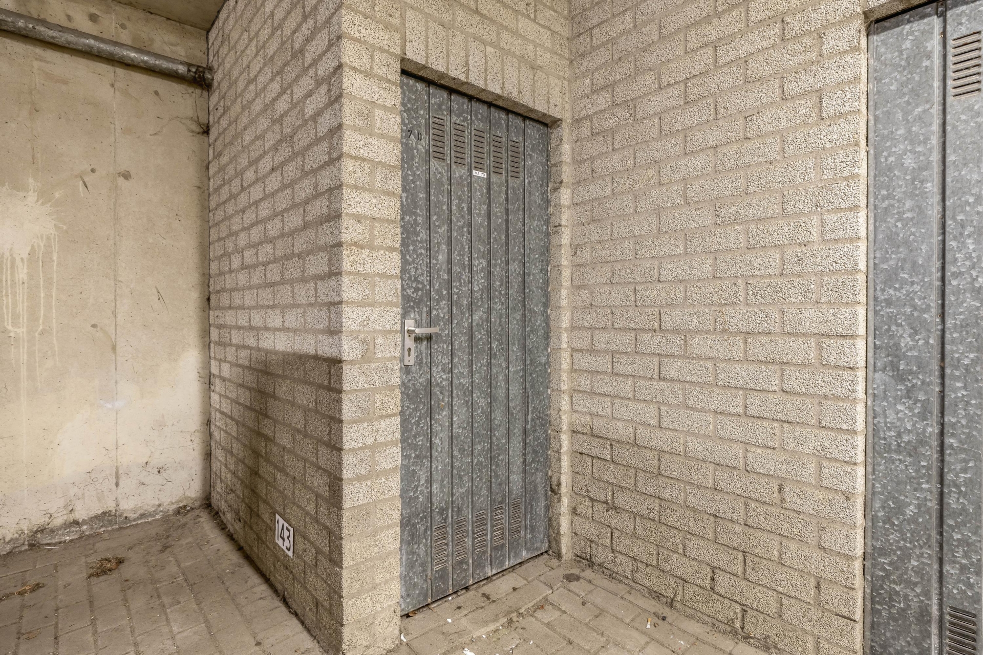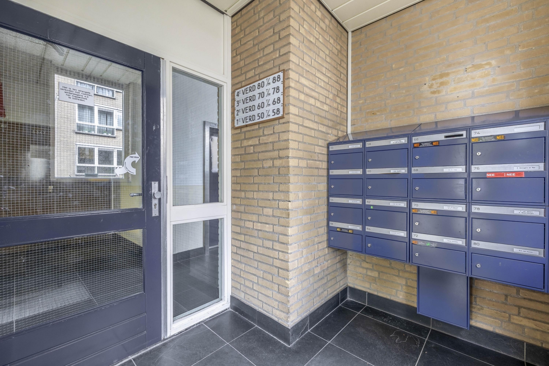 Afgesloten entree met bellentableau en brievenbussen. Vanuit hier heeft u toegang tot de bergingen, het trappenhuis en de lift.