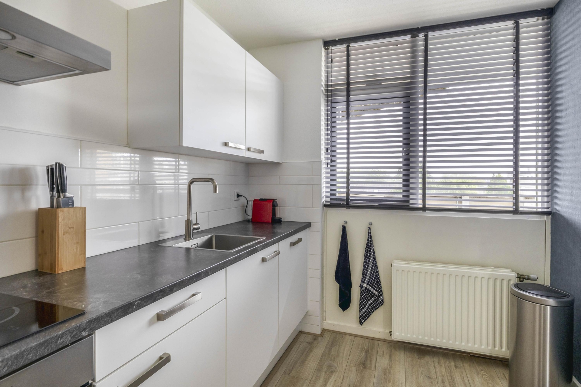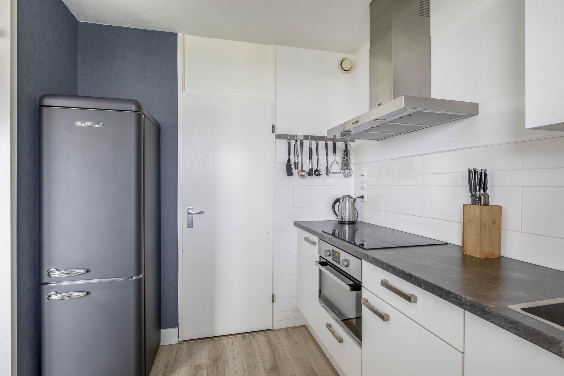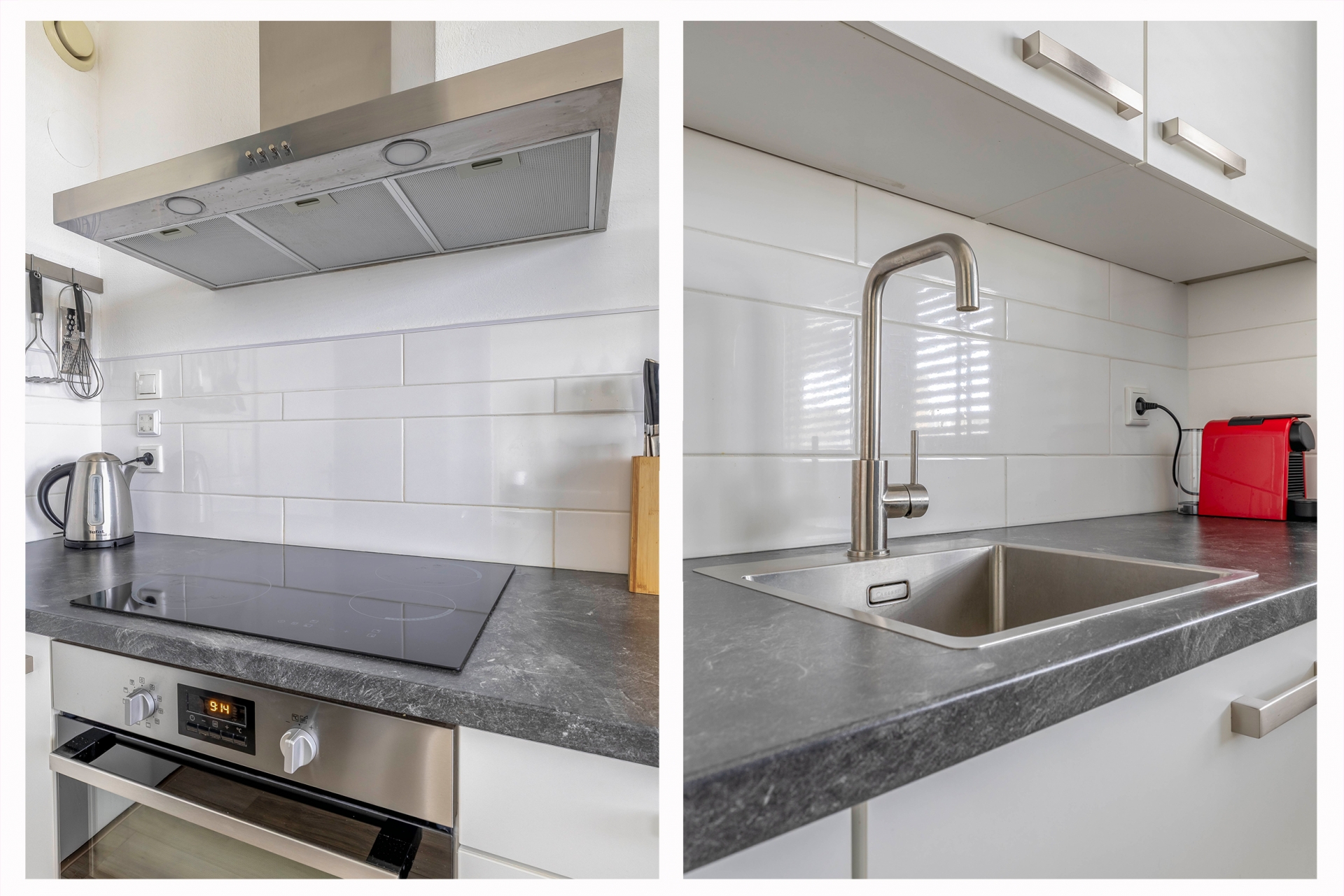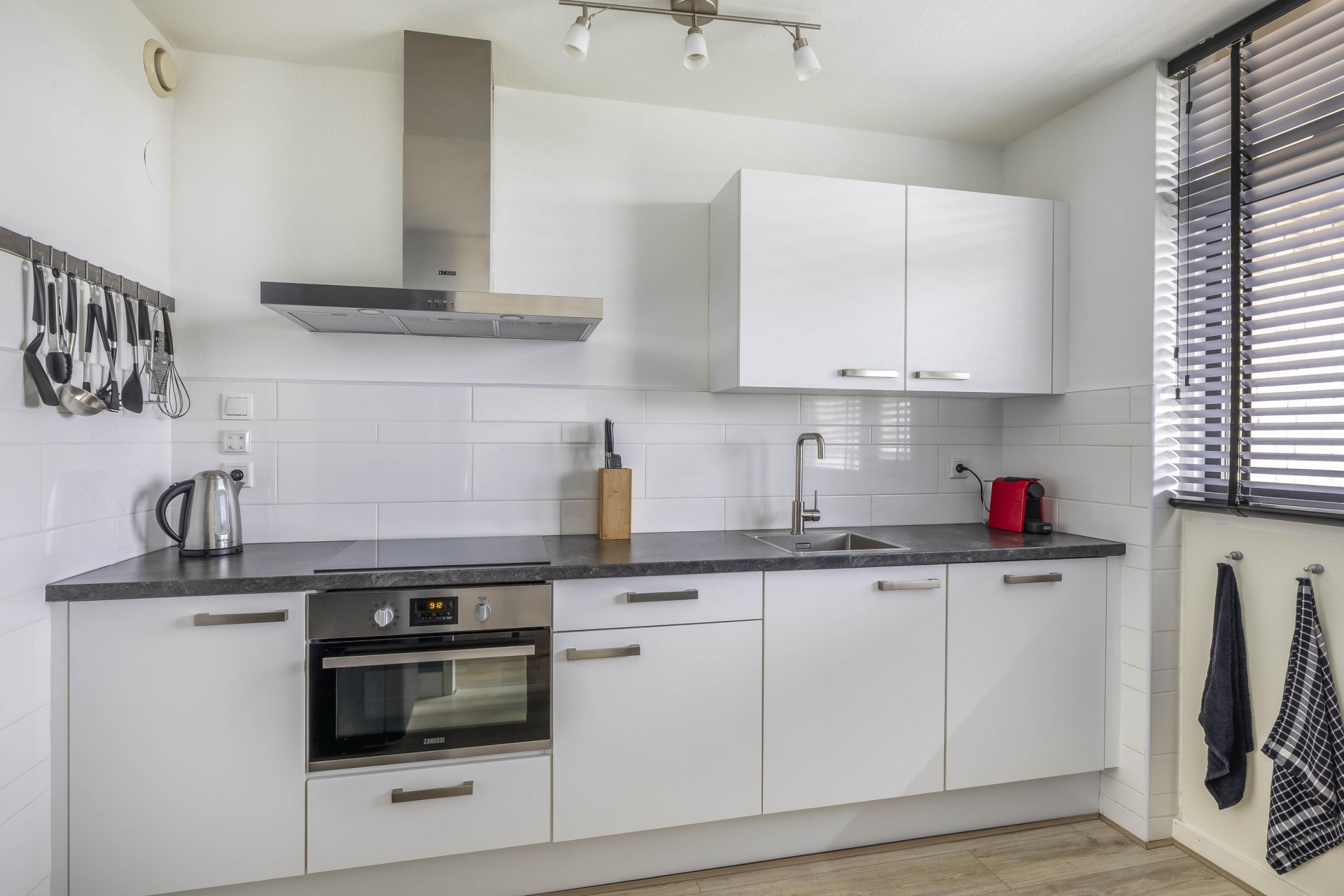 De afgesloten keuken grenst direct aan de woonkamer en is uitgevoerd in een eenvoudige opstelling met diverse inbouwapparatuur. Aansluitend vindt u de bijkeuken met veel bergruimte en de motor van de mechanische ventilatie.