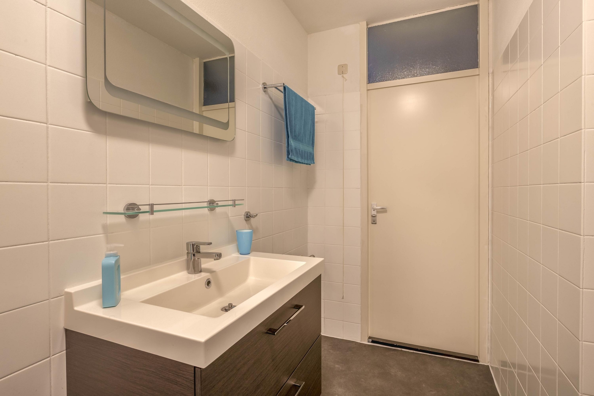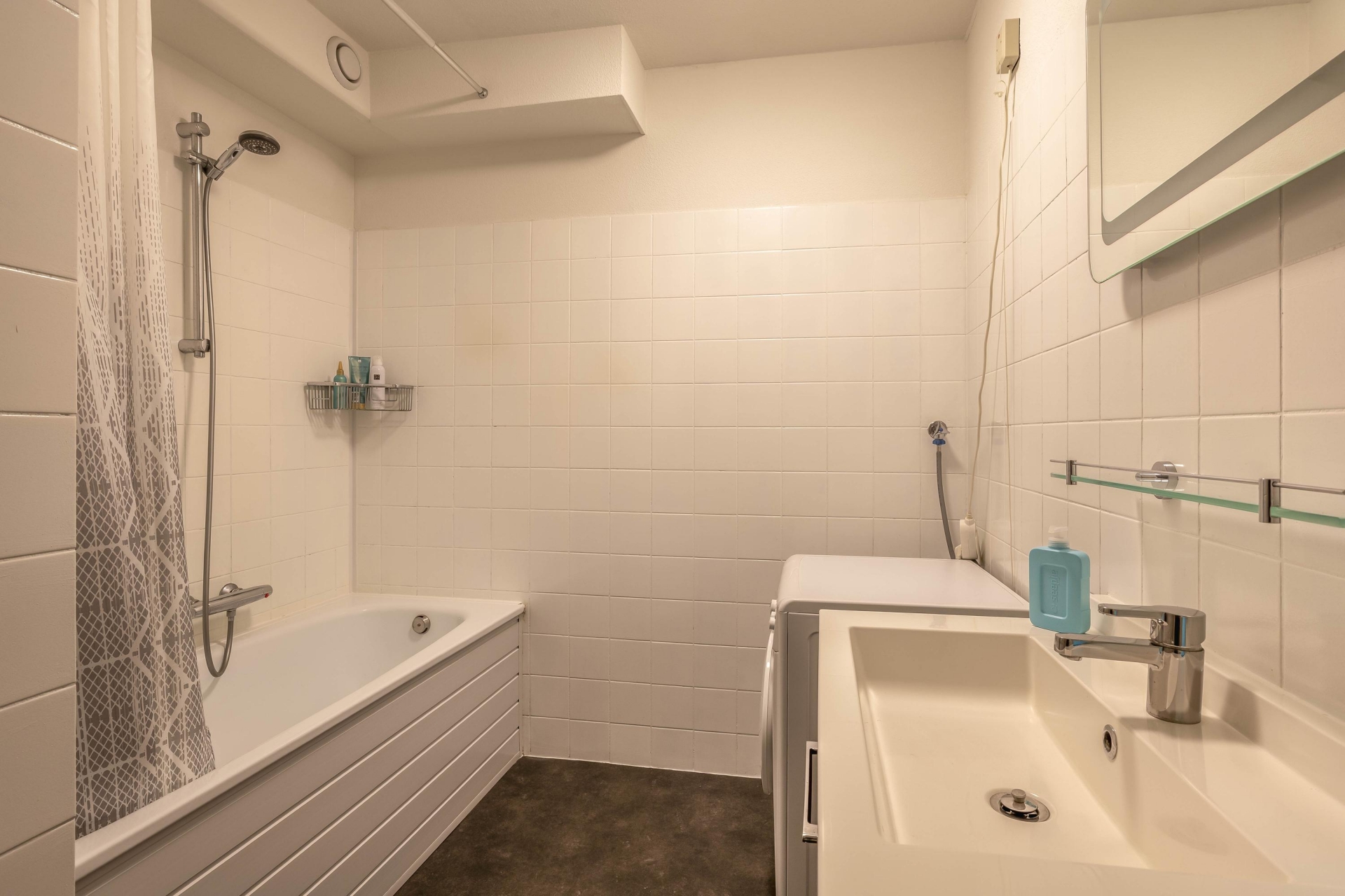 Centraal in het appartement bevindt zich de badkamer, uitgerust met een ligbad/douche, wastafel, verwarming en wasmachineaansluiting.