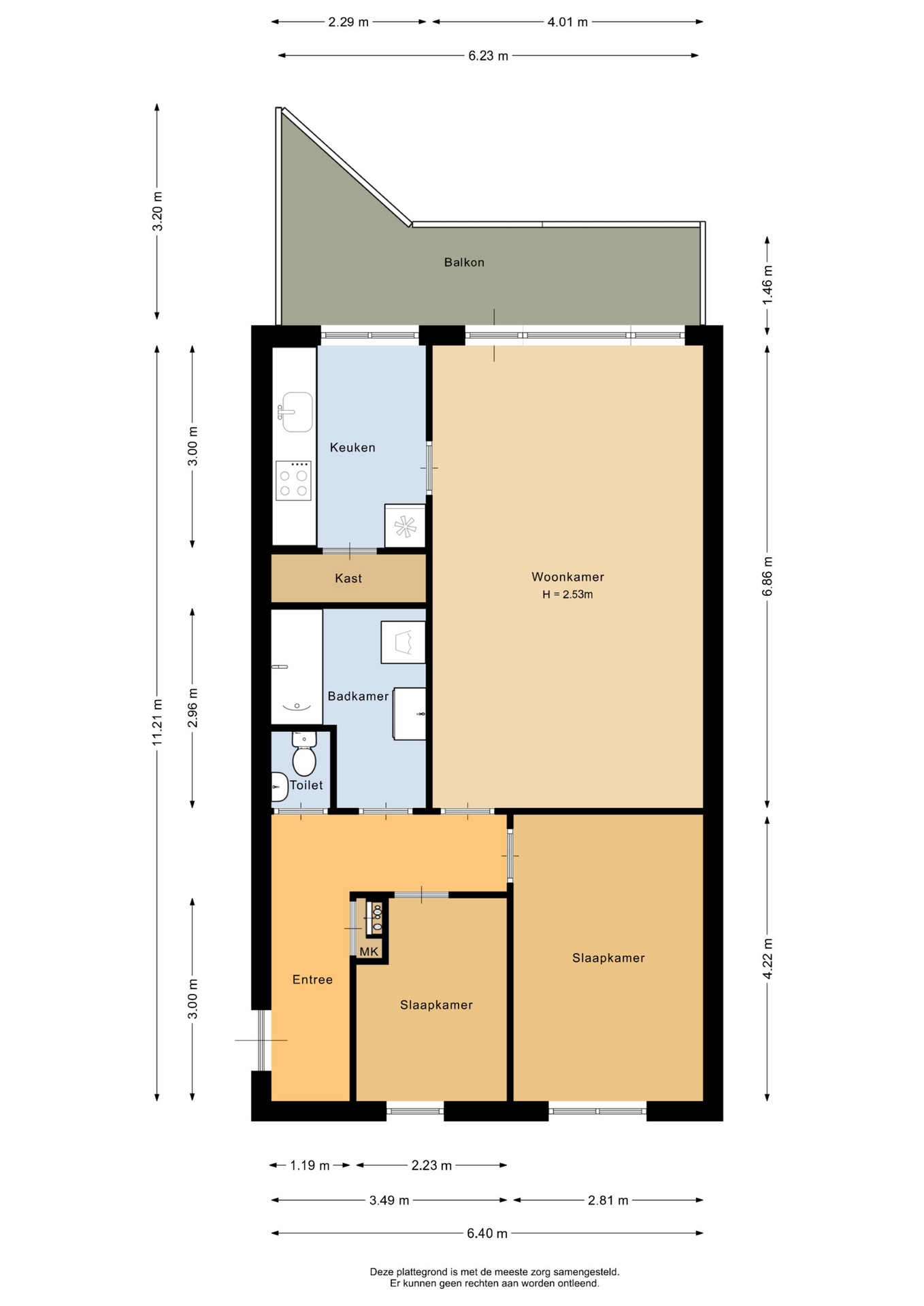 Aan de voorzijde liggen twee slaapkamers van ca. 6 m² en 12 m².