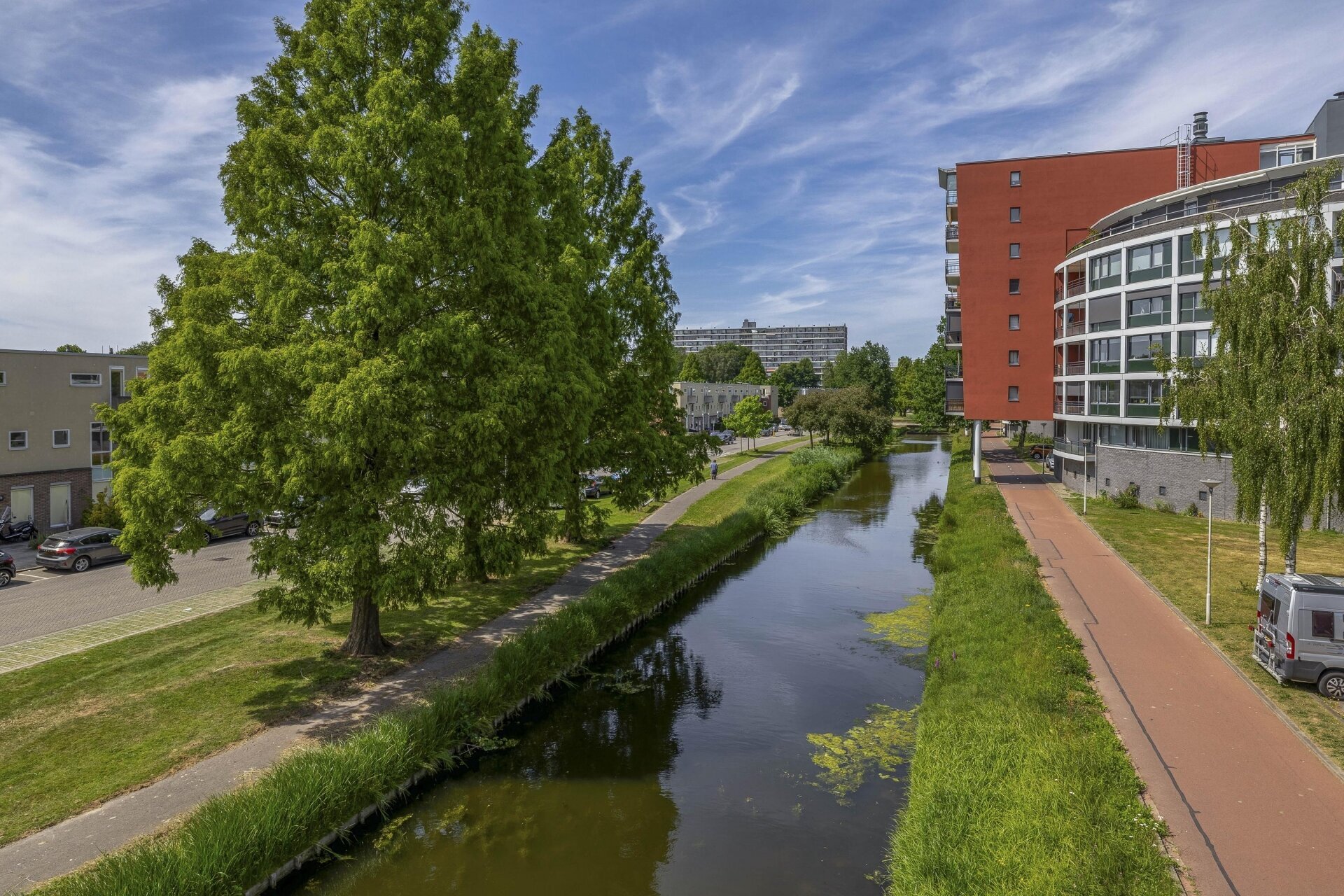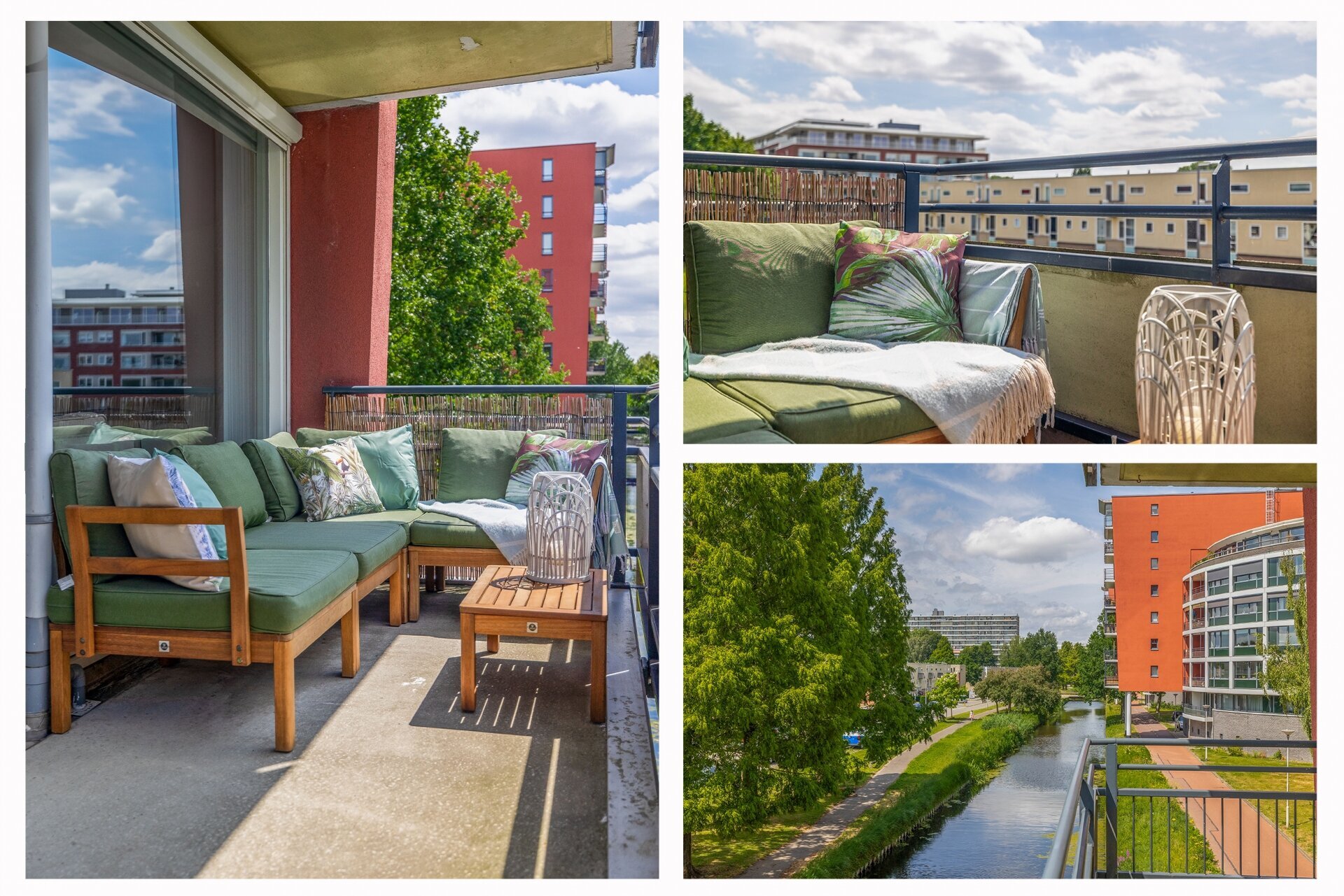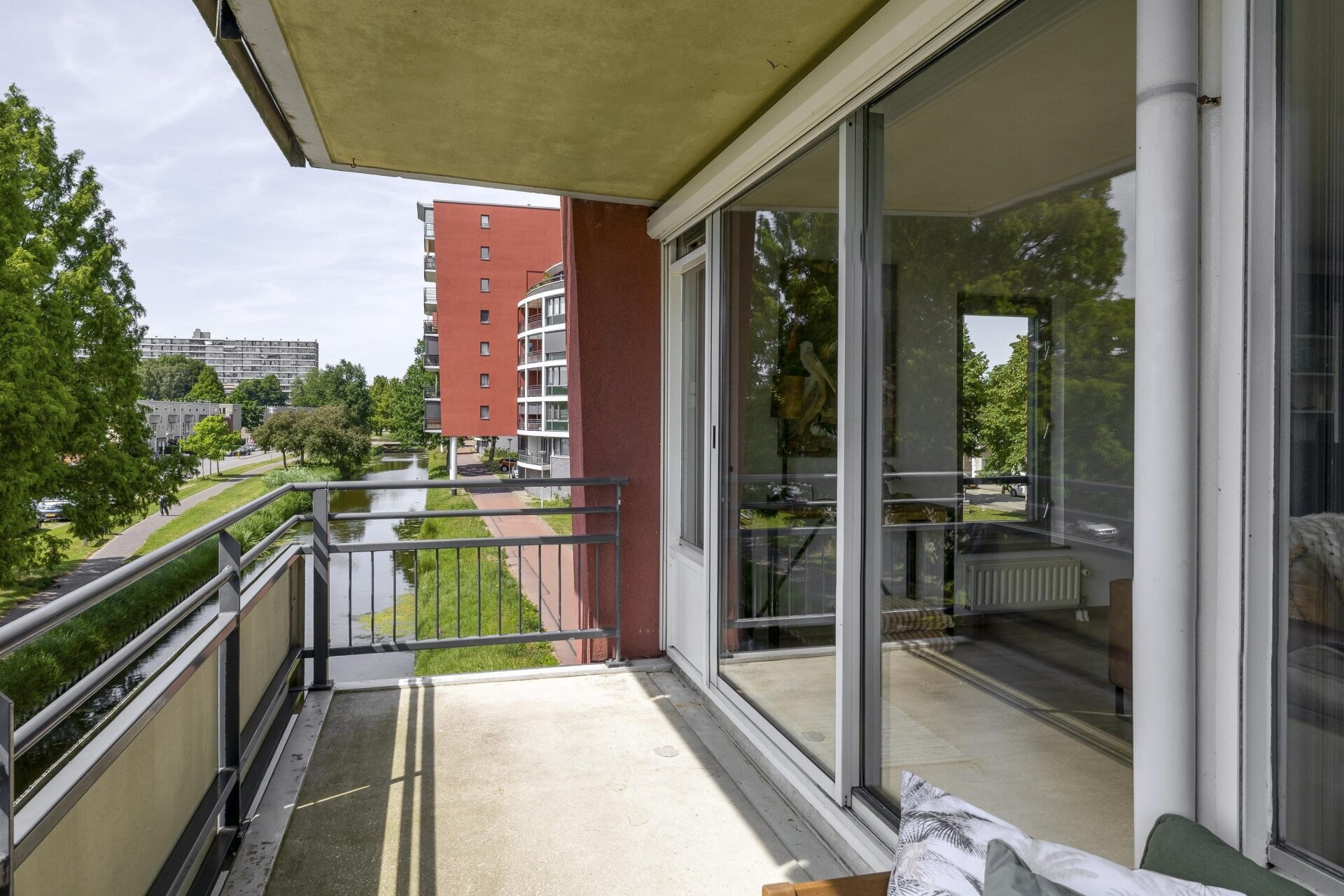 Via de schuifpui in de woonkamer stap je zo het ruime balkon van ca. 10 m² op. Gelegen op het westen, geniet je hier ’s middags en aan het begin van de avond van de zon. Het uitzicht op het rustige watertje vóór het appartementencomplex geeft een vrij en groen gevoel, zonder directe inkijk. Ideaal voor een kop koffie in de zon, een borrel met vrienden of gewoon even ontspannen met een boek.