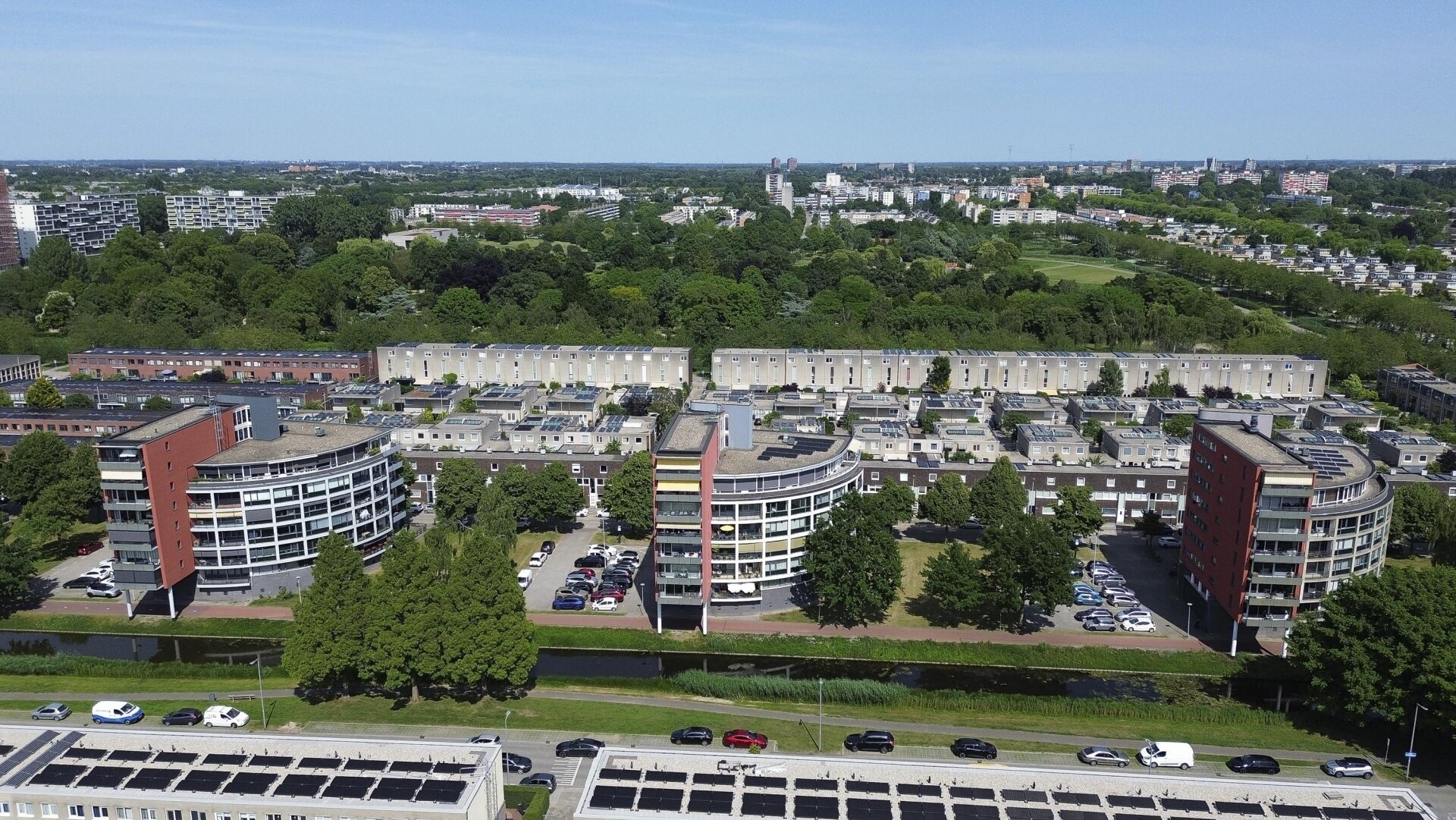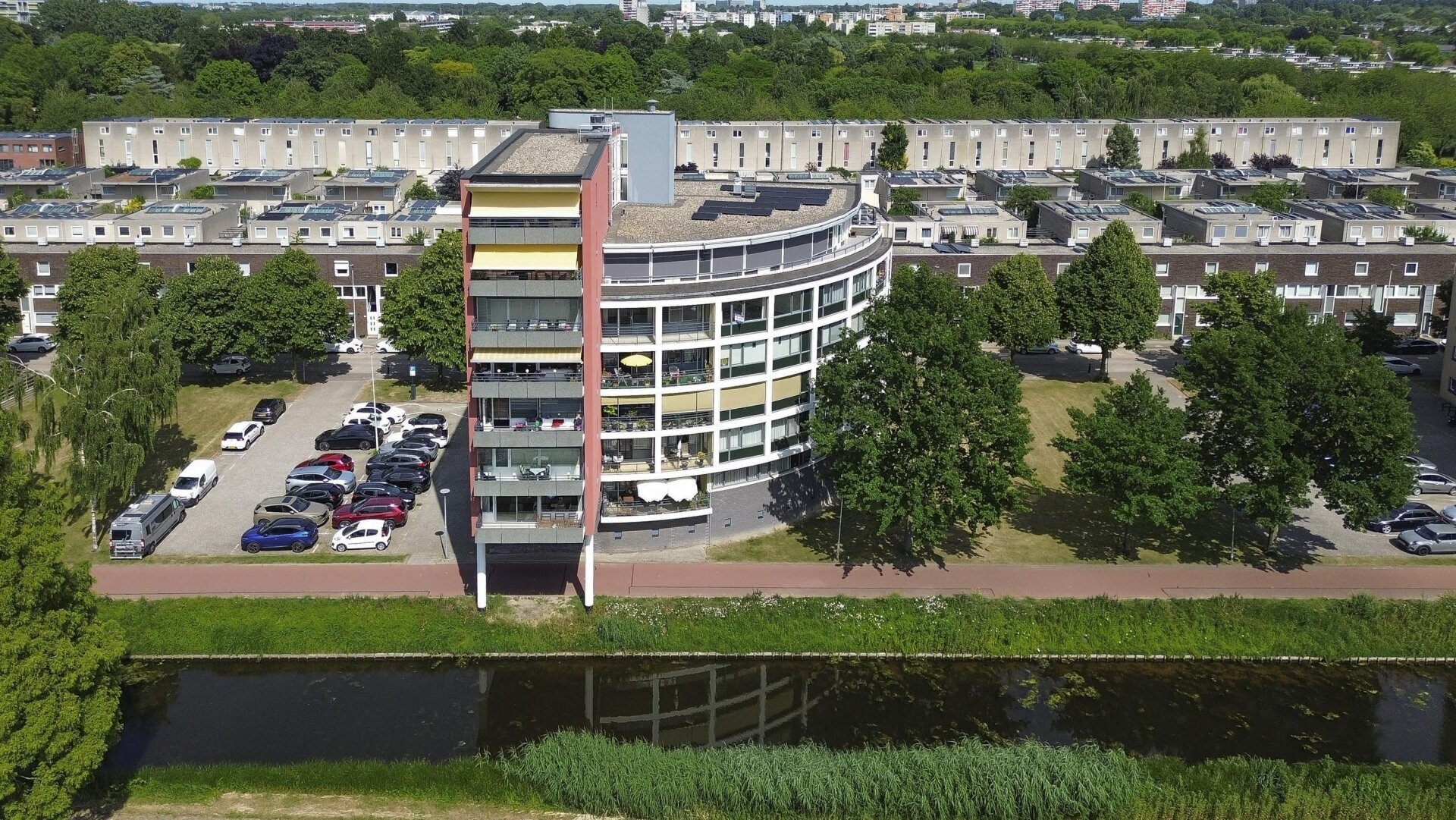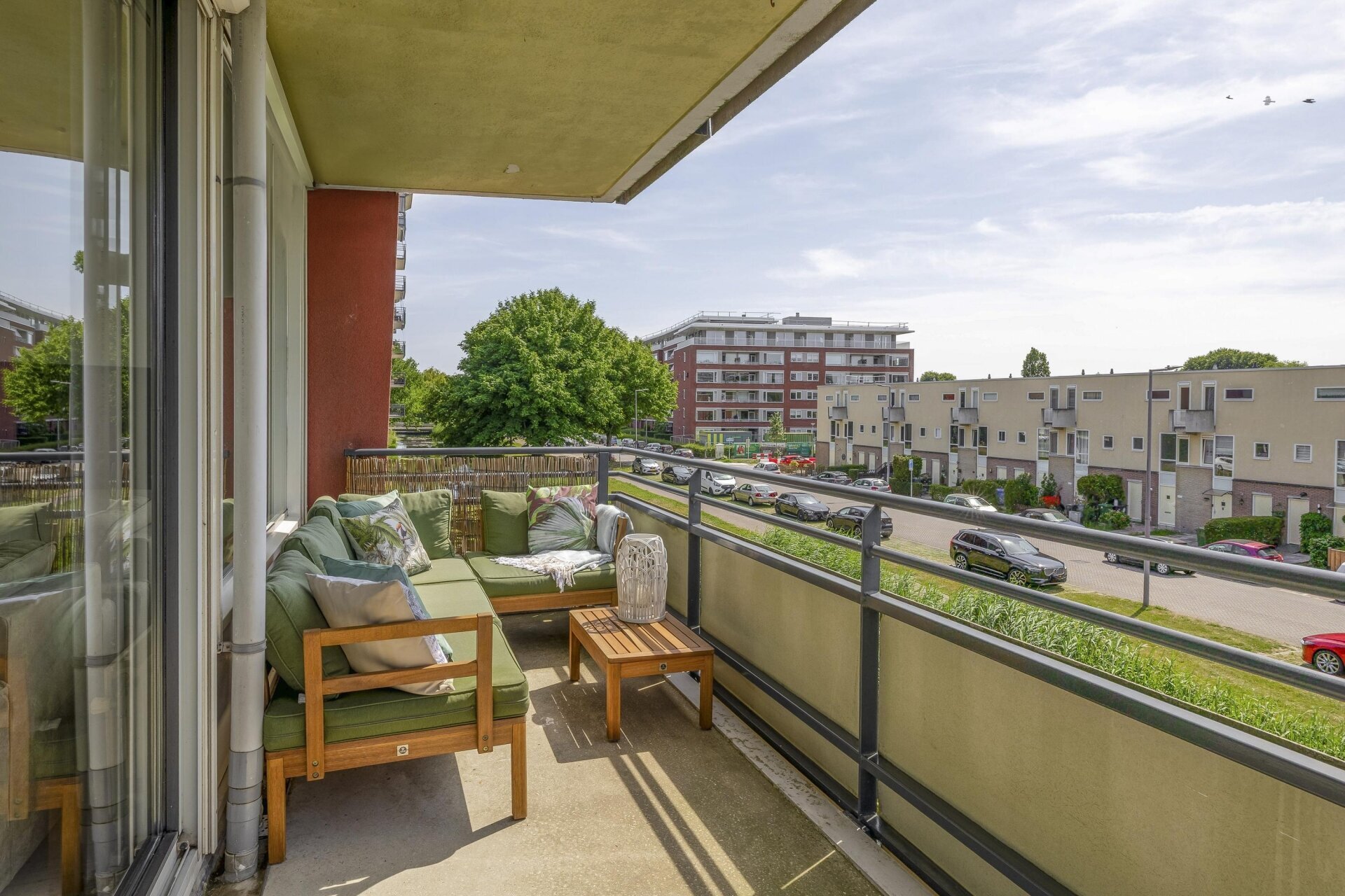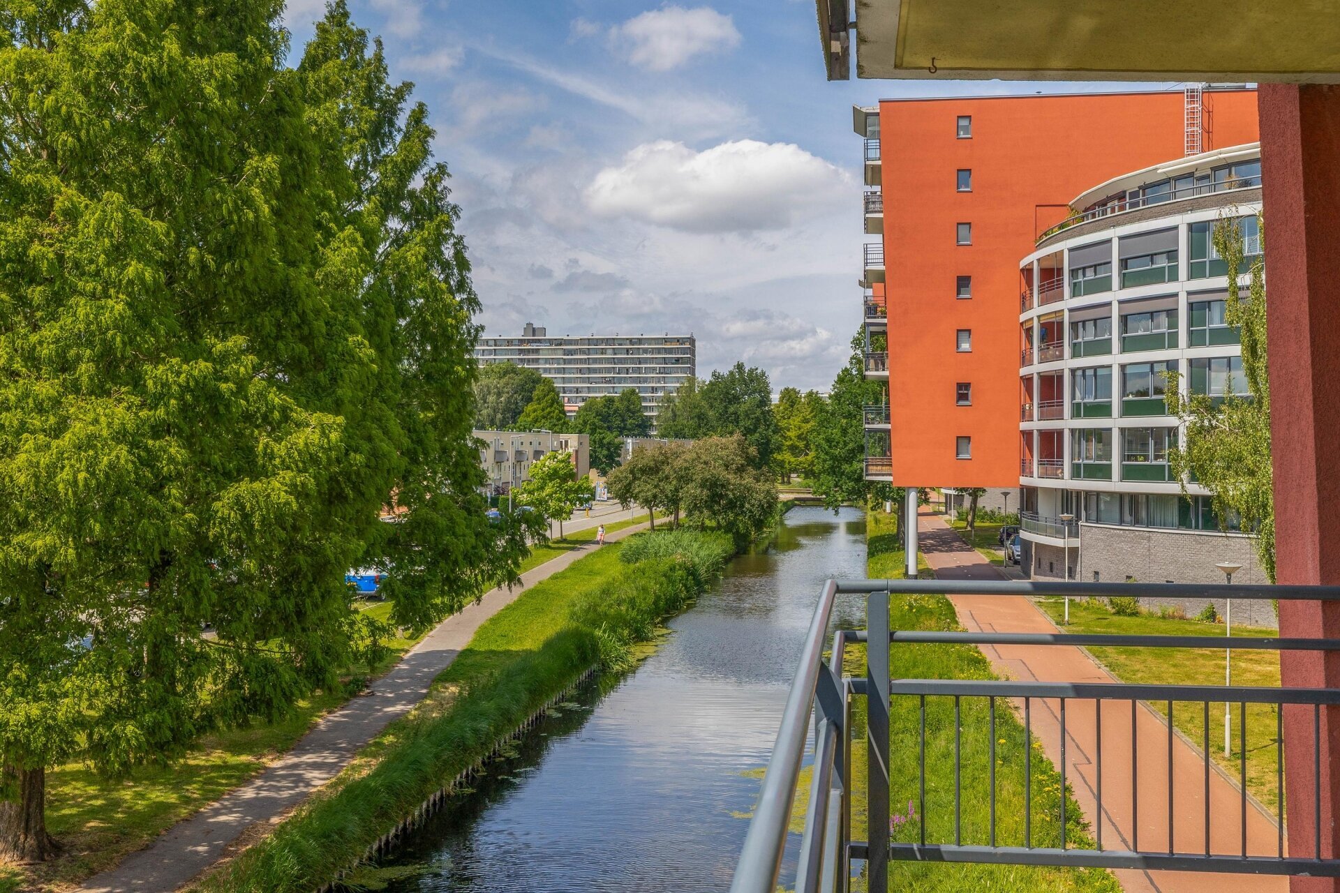 Via de schuifpui in de woonkamer stap je zo het ruime balkon van ca. 10 m² op. Gelegen op het westen, geniet je hier ’s middags en aan het begin van de avond van de zon. Het uitzicht op het rustige watertje vóór het appartementencomplex geeft een vrij en groen gevoel, zonder directe inkijk. Ideaal voor een kop koffie in de zon, een borrel met vrienden of gewoon even ontspannen met een boek.