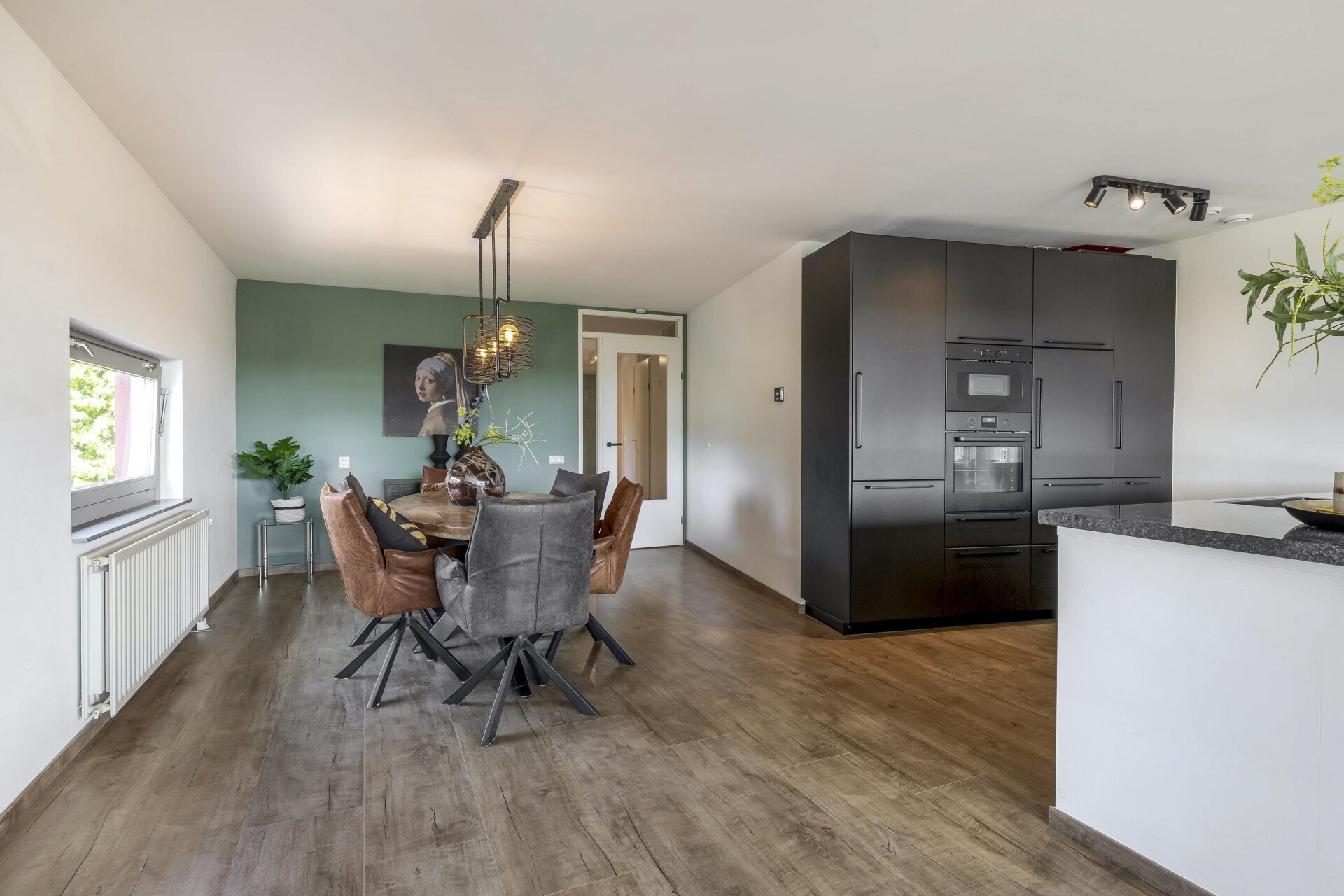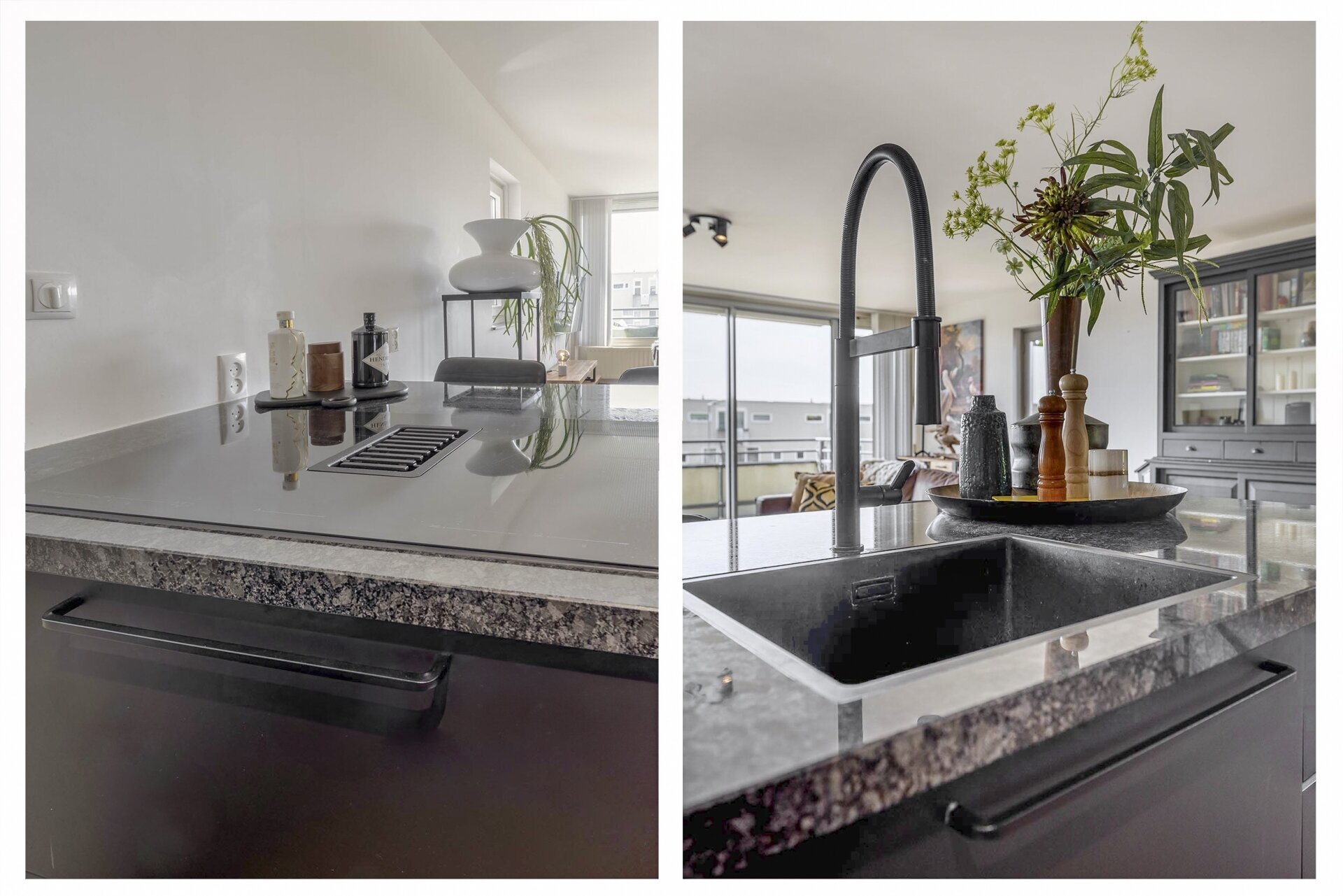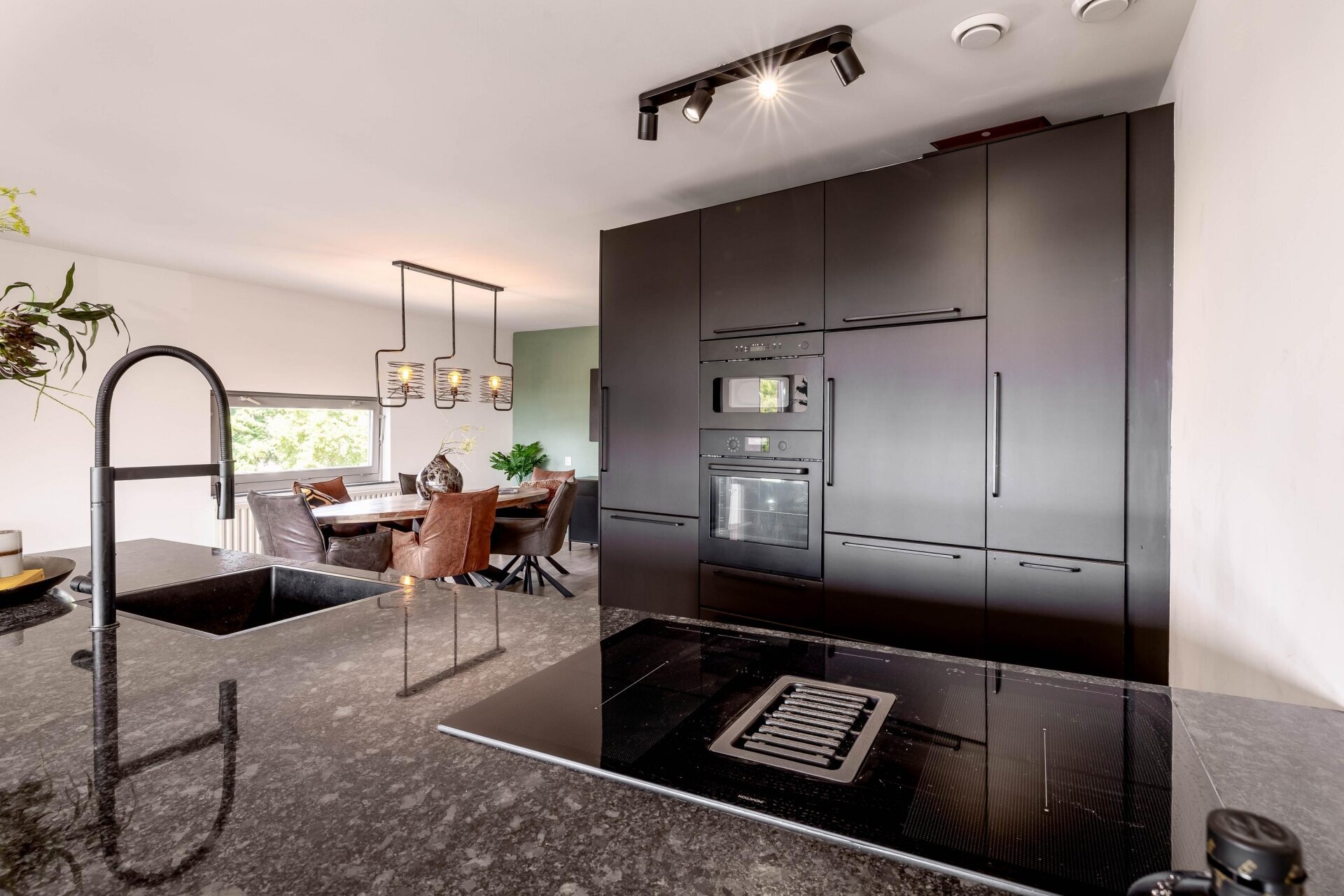 De lichte en ruime woonkamer is het hart van het huis. Hier komen koken, eten en ontspannen samen in één grote open leefruimte. De moderne zwarte keuken vormt een strak contrast met de warme houtlook vloer en is van alle gemakken voorzien: een inductiekookplaat met geïntegreerde afzuiging, combi-oven, vaatwasser en koel-vriescombinatie. Het granieten werkblad en de sfeervolle verlichting zorgen voor een luxe uitstraling. Dankzij de open indeling sta je altijd in contact met je gasten aan de eettafel of in de zithoek. Een fijne plek om thuis te komen en mensen te ontvangen.