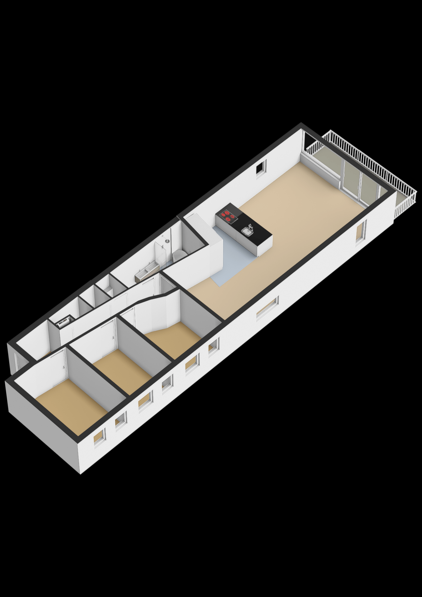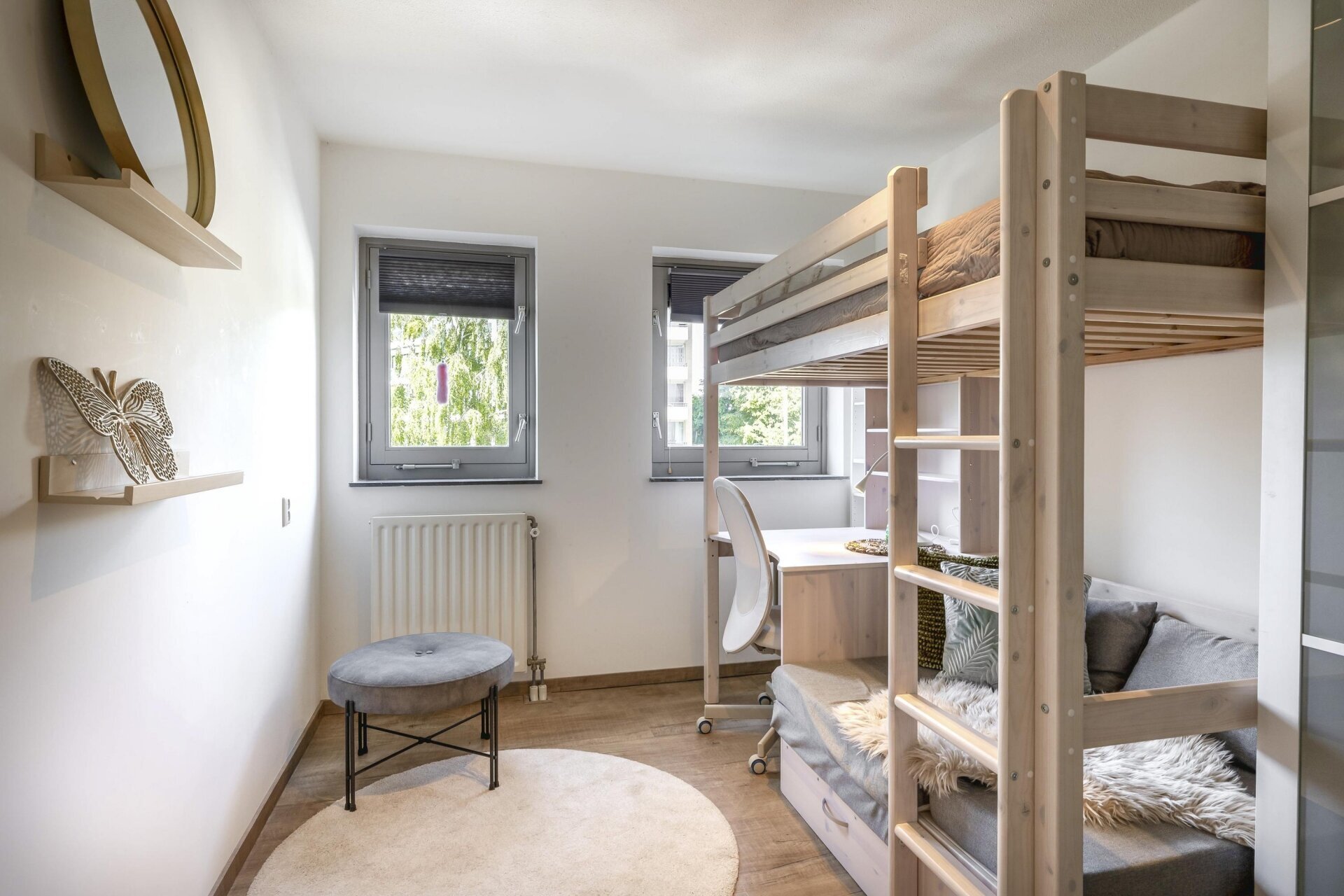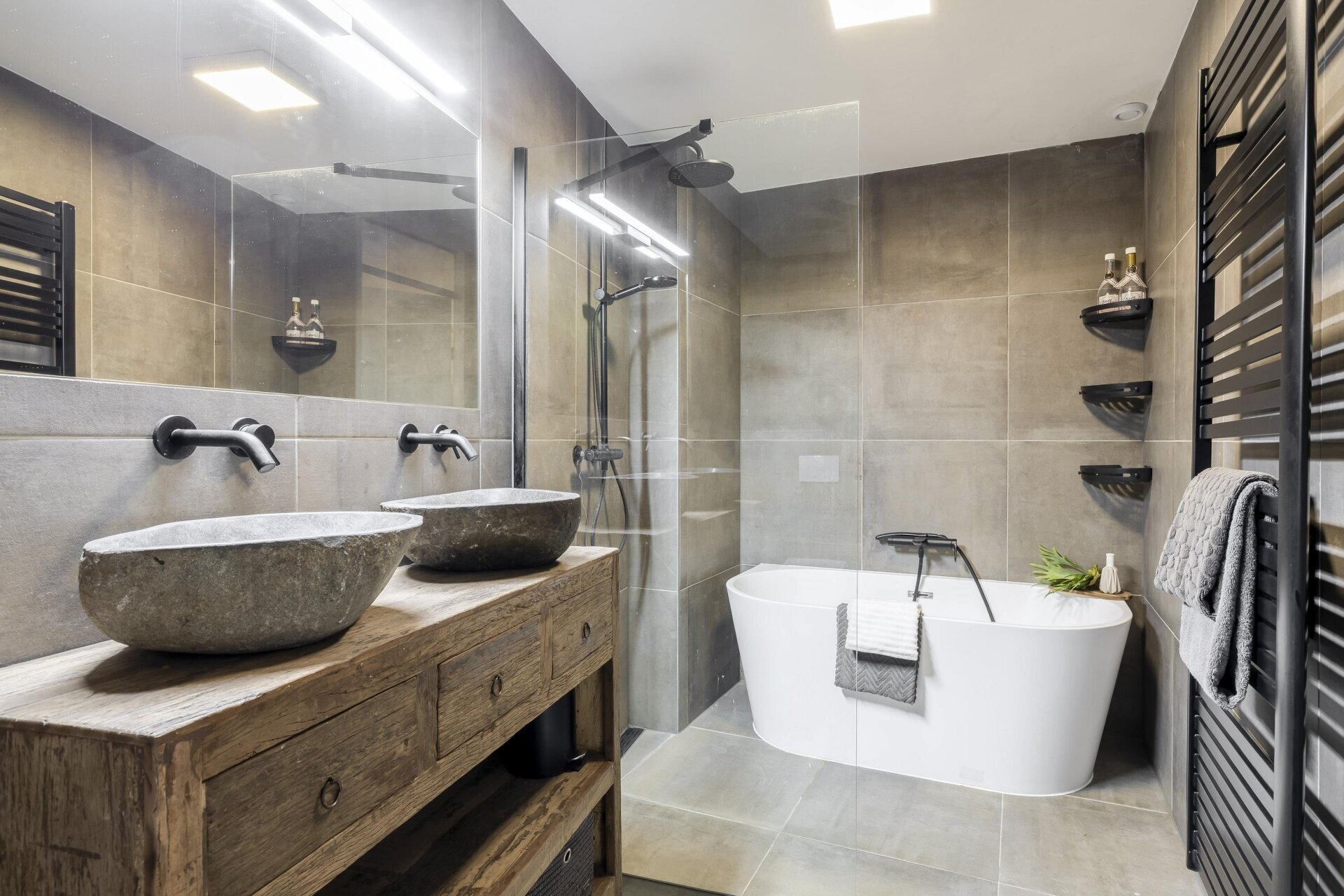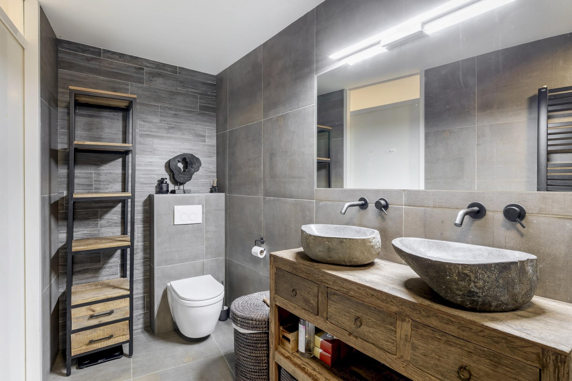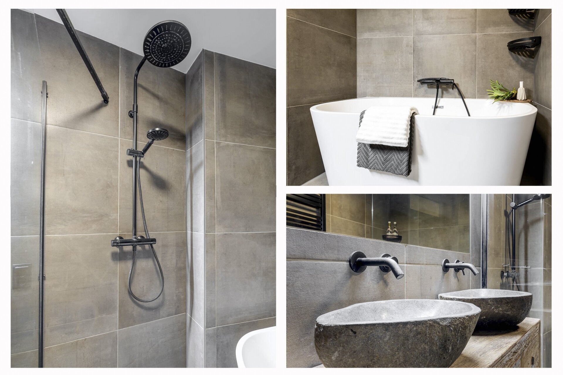 De badkamer is een eyecatcher: voorzien van een vrijstaand ligbad, royale inloop-regendouche, dubbele waskommen op een robuust houten meubel en toilet. De afwerking is stoer en sfeervol, met grote grijze wandtegels en matzwarte accenten. Naast de moderne badkamer is er ook een 2e, separaat toilet. De drie slaapkamers variëren in formaat, met genoeg ruimte voor een kingsize bed, inbouwkasten of een werkplek. Of je nu een thuiskantoor, kinderkamer of logeerkamer nodig hebt – het kan hier allemaal.