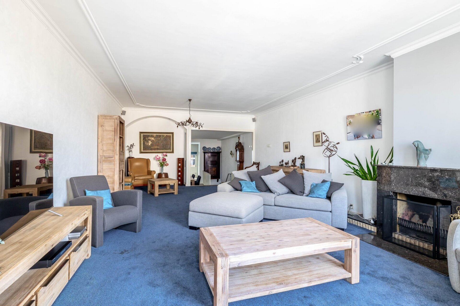 De grote woonkamer is voorzien van een gestuukt plafond, open haard en