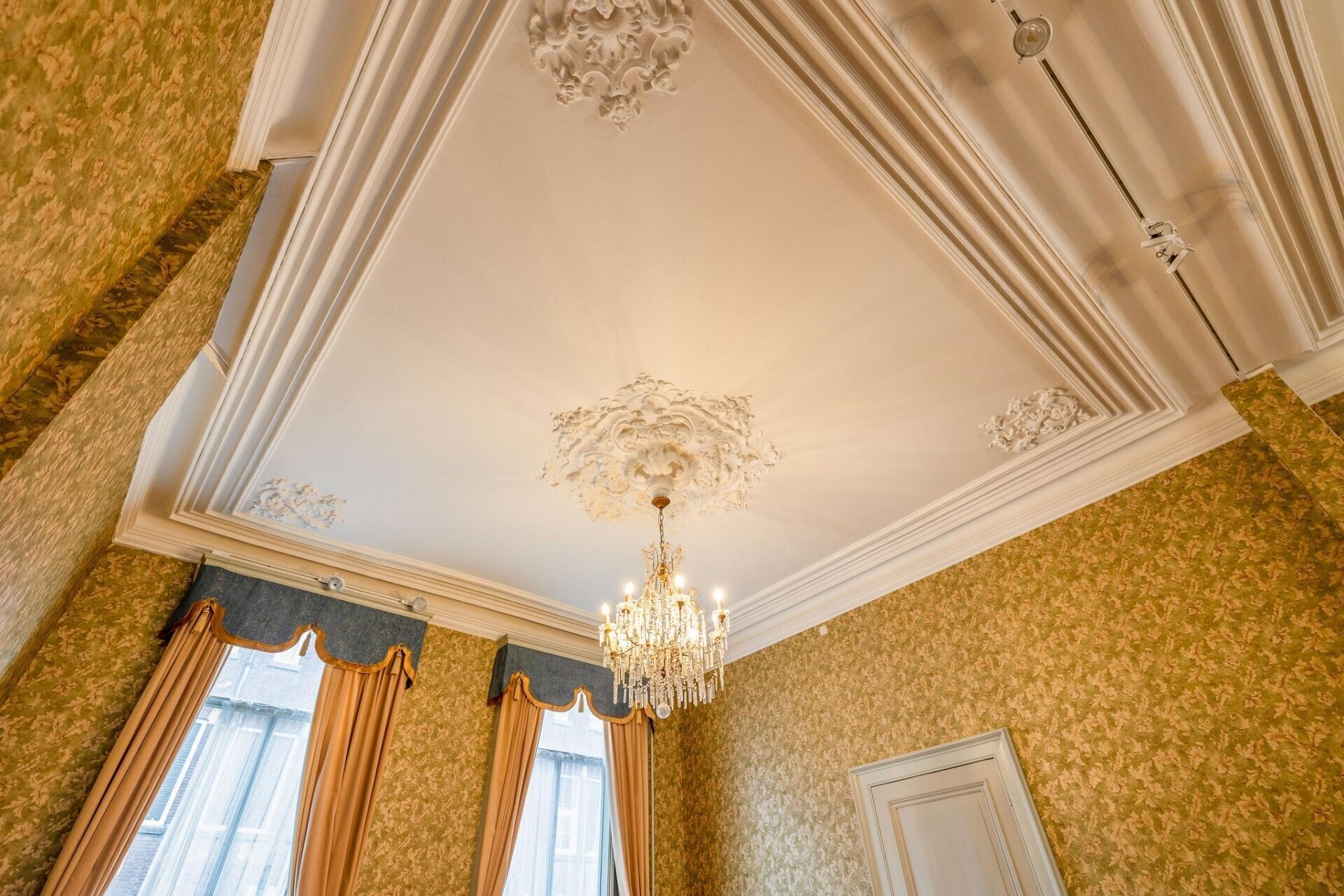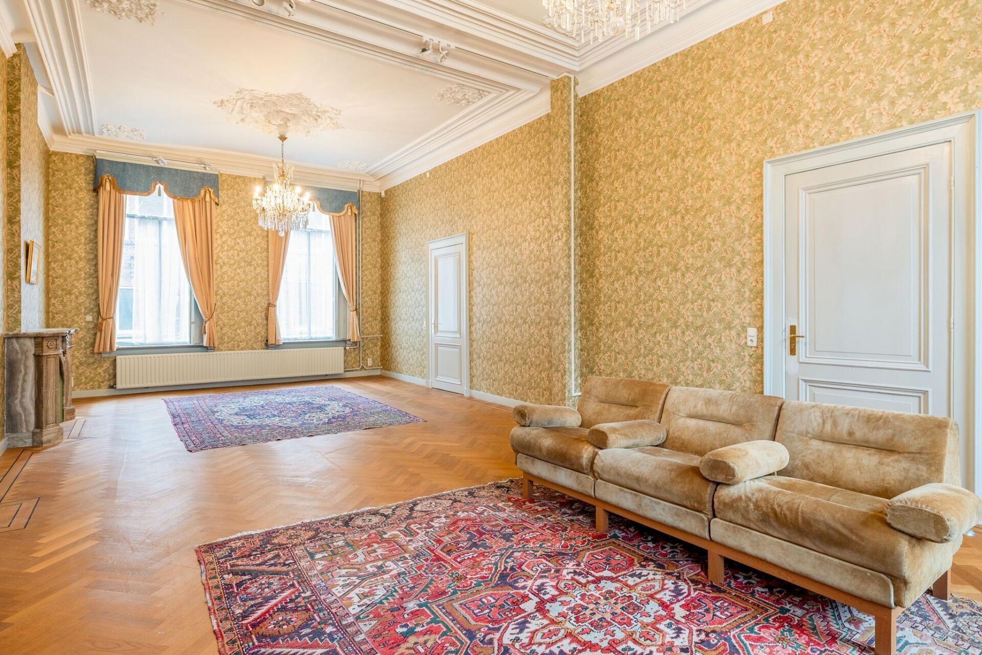 - Woonkamer van 57 m² met sierlijke plafondlijsten, ornamenten en twee marmeren schouwen;