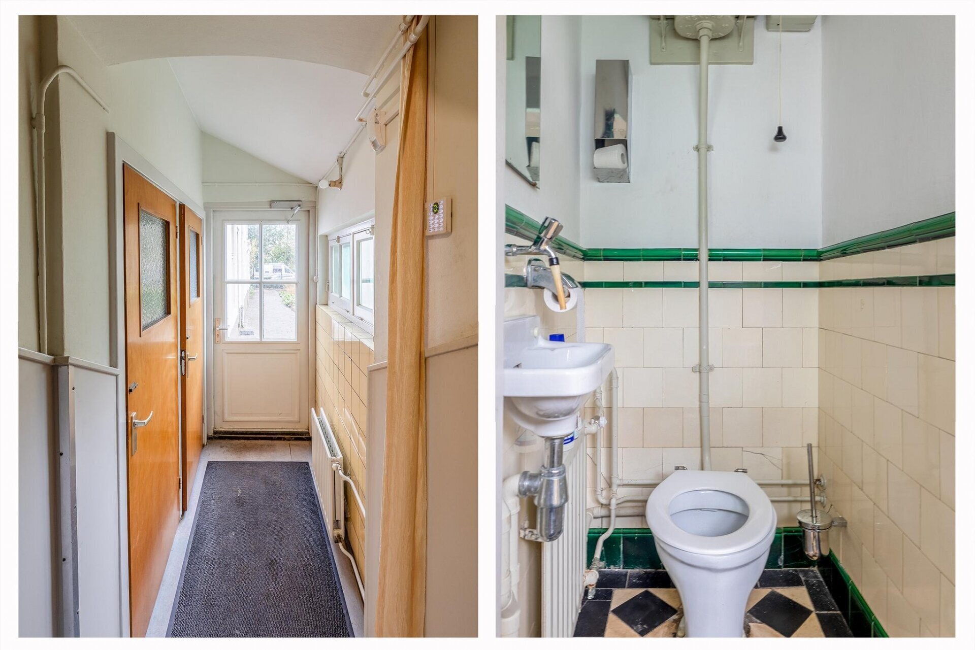 Verderop in de hal bevindt zich de trap naar de eerste verdieping. Aan het einde van de hal kunt u de achtertuin betreden of links de eetkamer betreden. Deze kamer geeft toegang tot de kelder, toiletruimte als ook de keuken. De toiletruimte is voorzien van een voorruimte met wastafel en een zwevend toilet en urinoir.