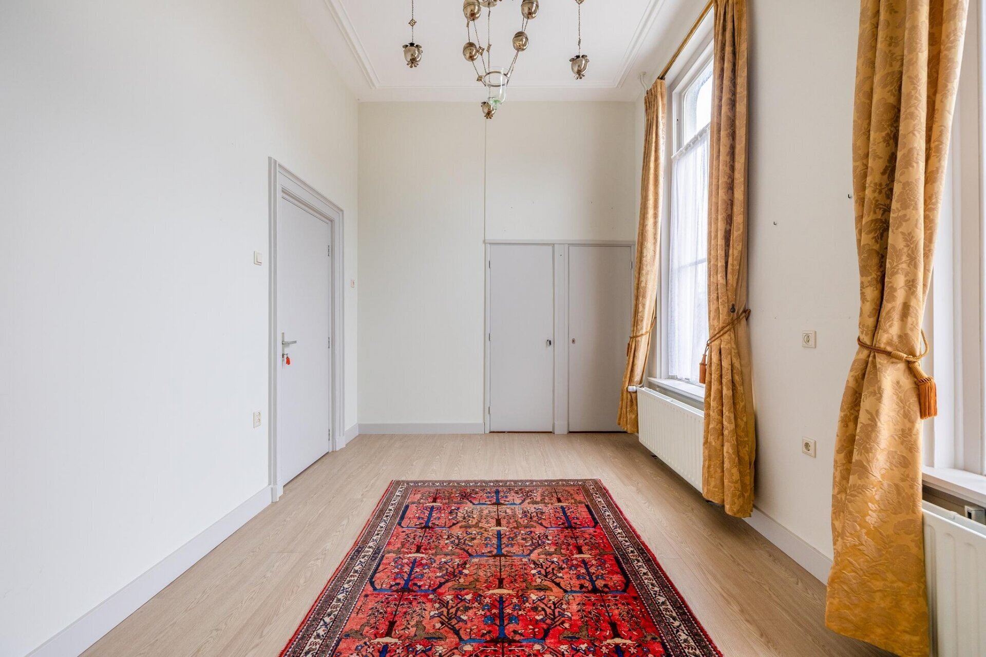 Bij binnenkomst via de karakteristieke dubbele paneeldeur betreedt u een statige en lange hal met marmeren plavuizen, die toegang biedt tot de verschillende vertrekken. Aan de rechterzijde bevindt zich de zeer ruime woonkamer. Deze kamer is voorzien van hoge plafonds, houten visgraat vloer, originele sierlijsten en marmeren schoorstenen, wat bijdraagt aan de grandeur van het pand. Aan de linker-voorzijde van de hal treft u een sfeervolle kamer, ideaal als bibliotheek of studeerkamer. Deze kamer is eveneens uitgerust met een marmeren schouw.