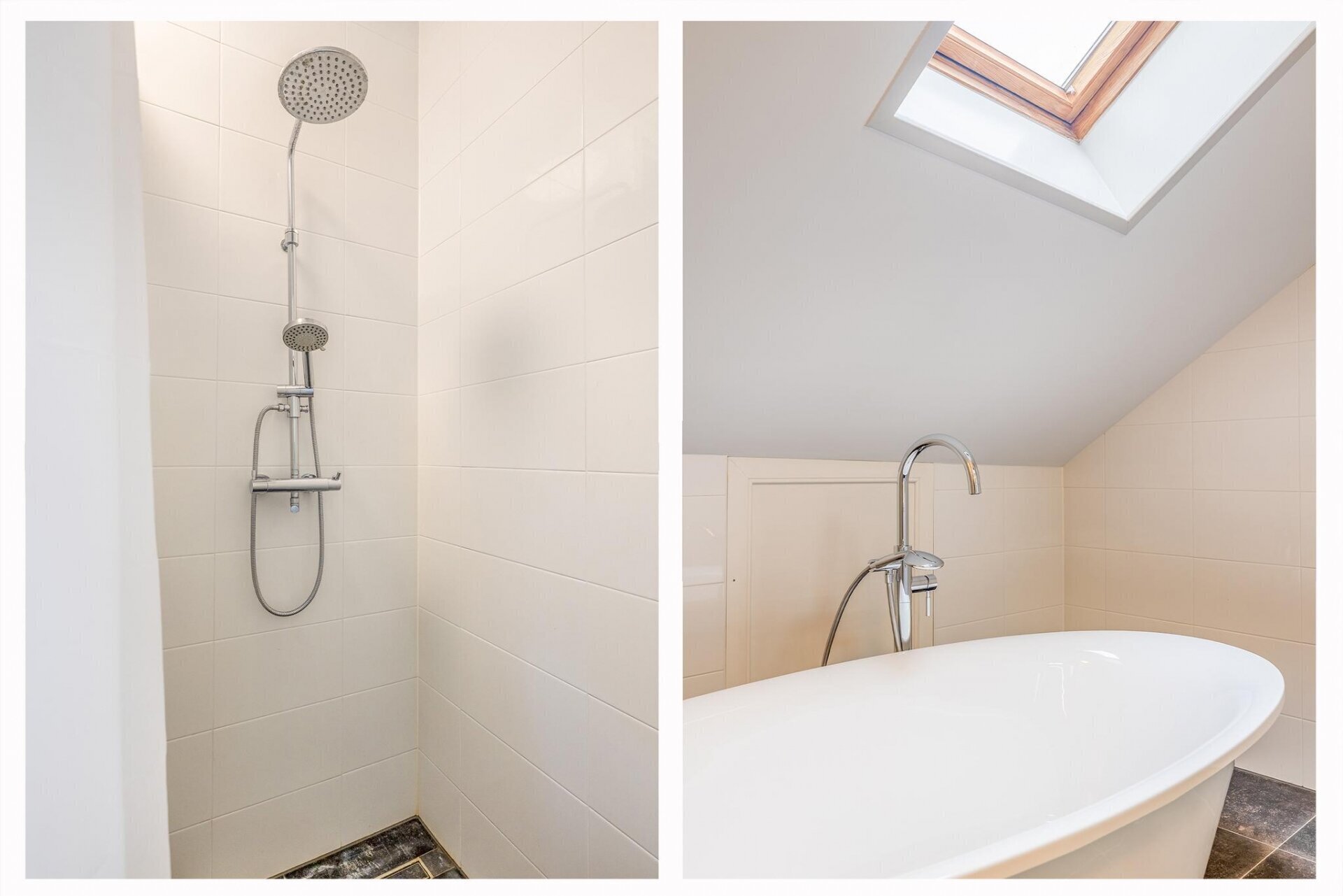 De tweede badkamer van de woning is aan de voorzijde van het koetshuis gesitueerd en beschikt over een ligbad, inloopdouche, zwevend toilet, handdoekenradiator en dubbele wastafelmeubel.