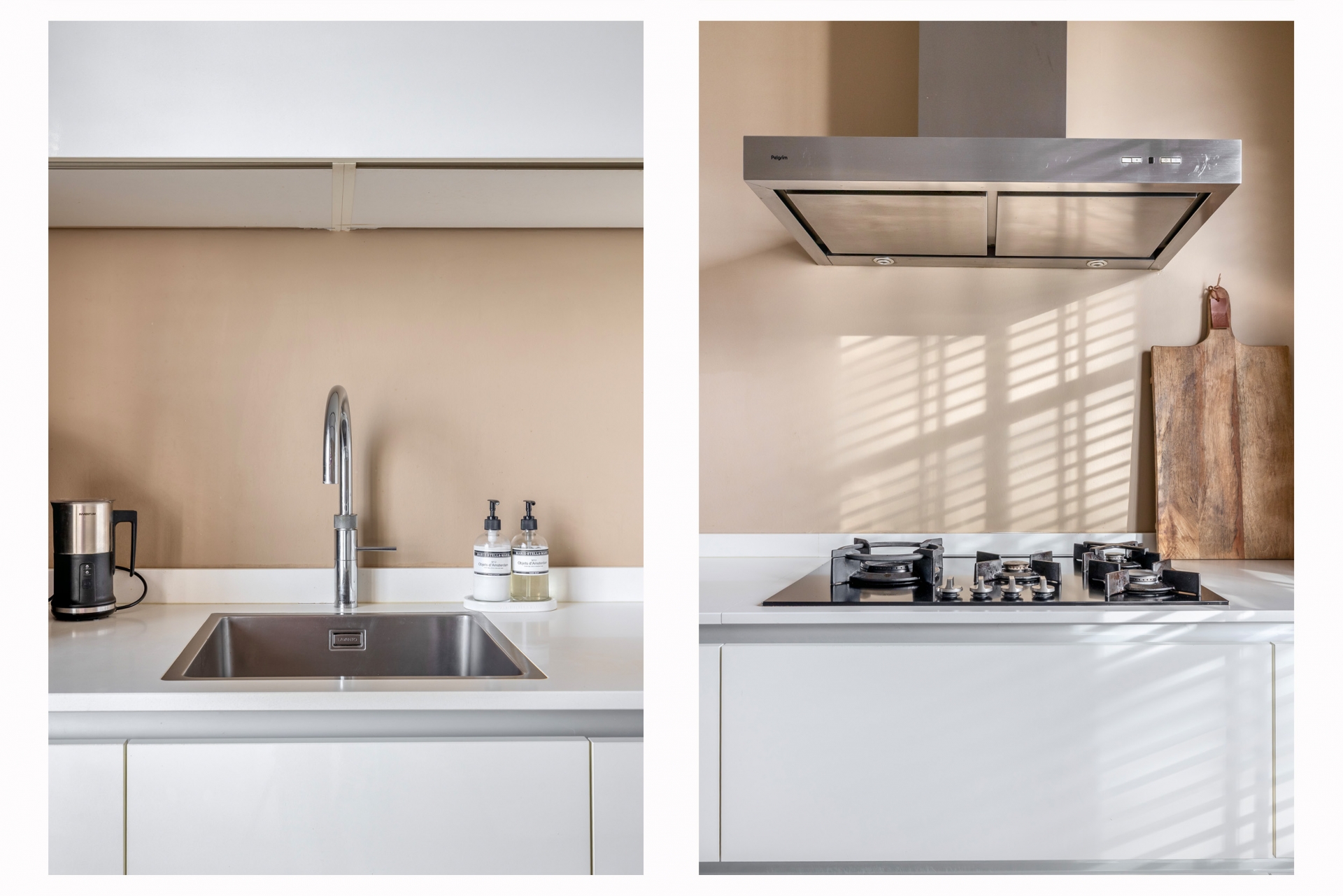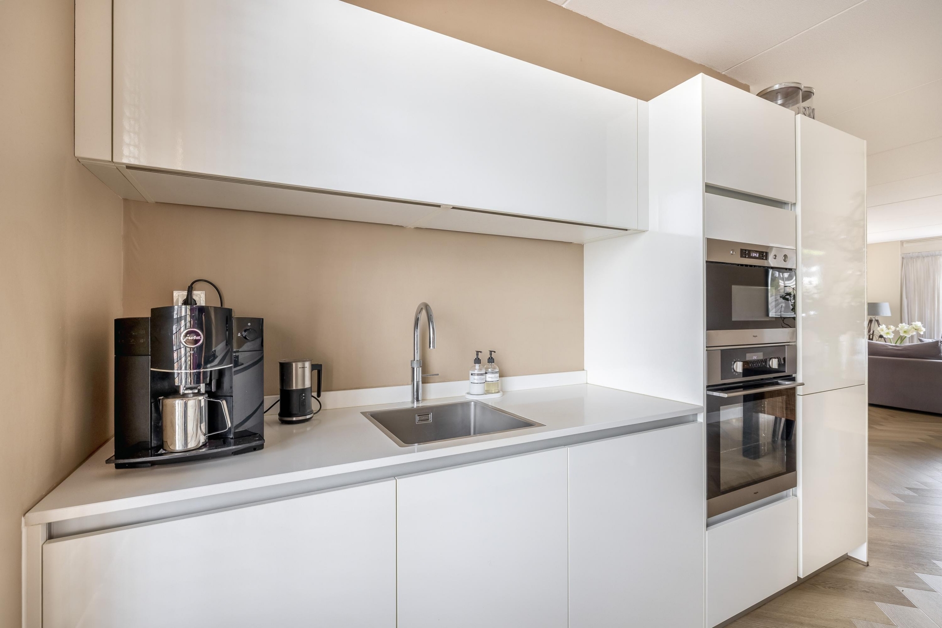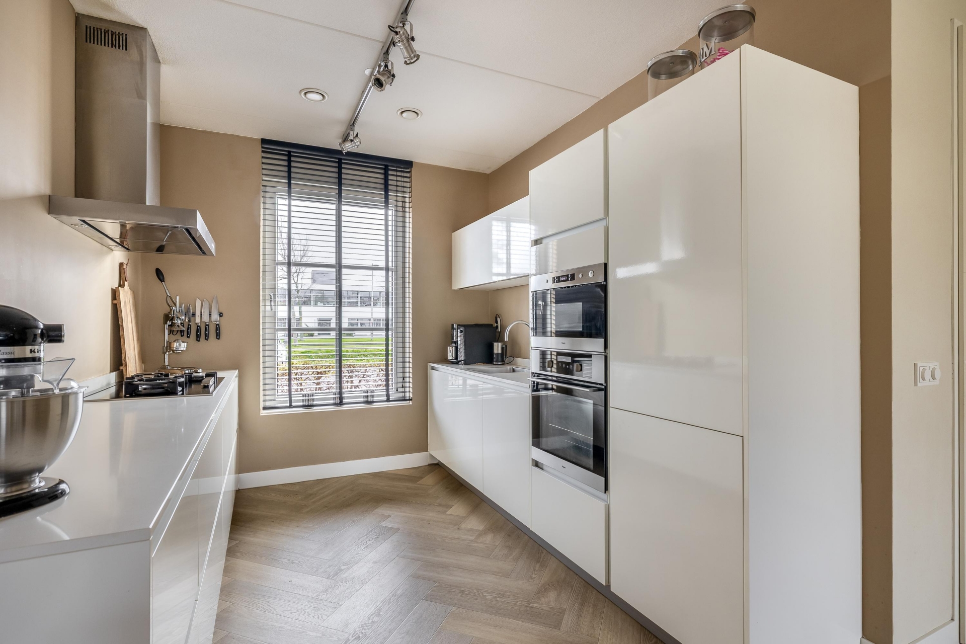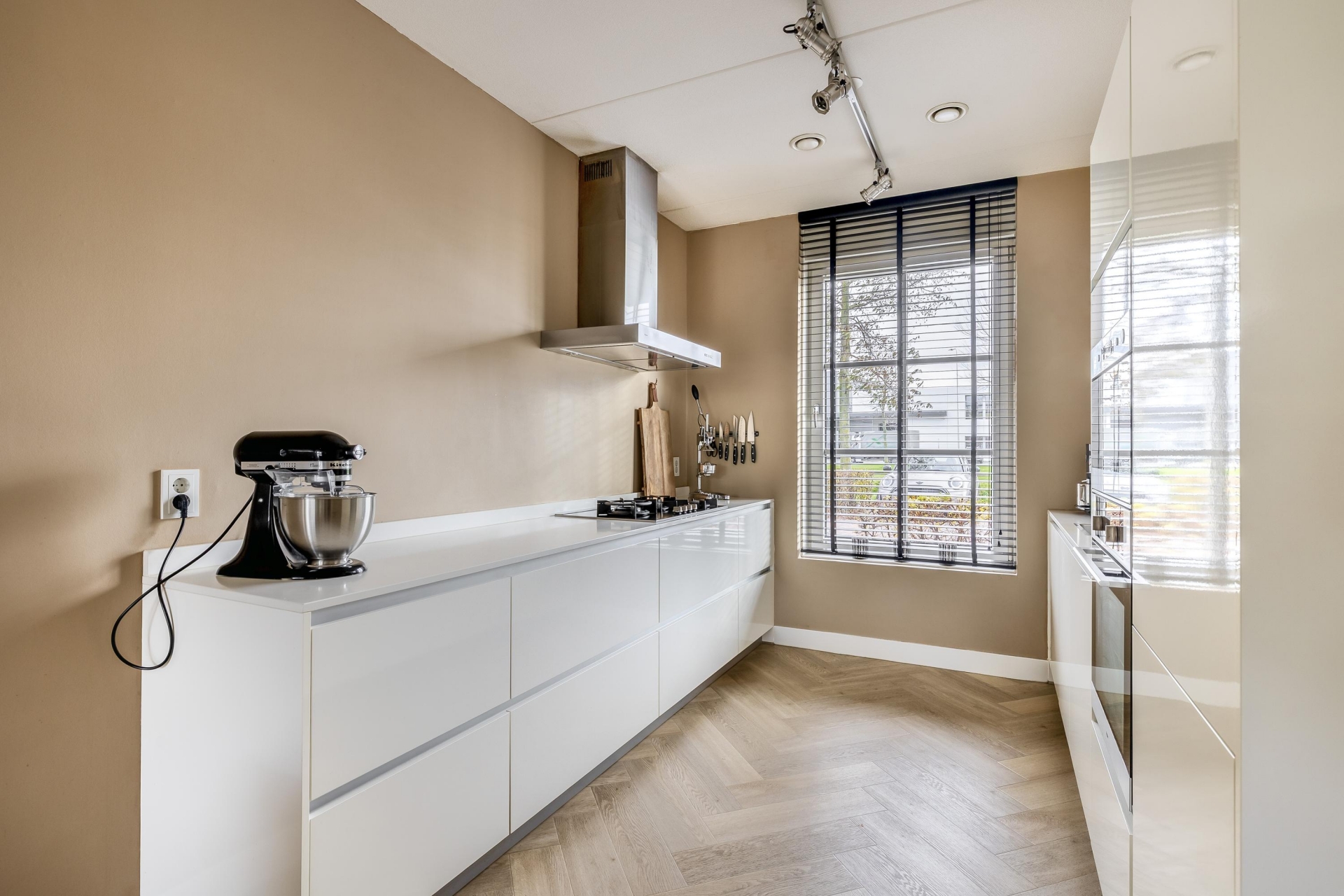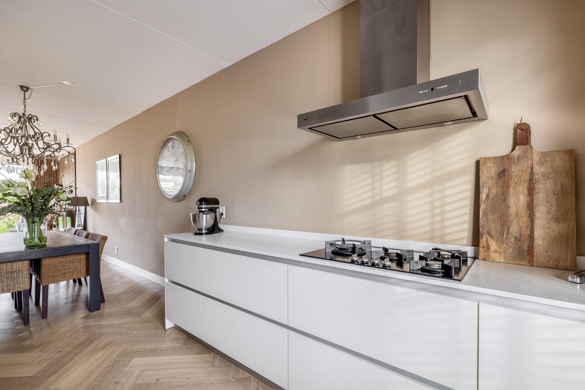 De open keuken aan de voorzijde is een echte blikvanger: strak, wit, greeploos en voorzien van alle benodigde inbouwapparatuur. Je hebt hier alles bij de hand: een combi-oven, koelkast, vaatwasser, gaskookplaat met afzuigkap en meer dan voldoende kastruimte. Door het open karakter van de keuken blijf je altijd in contact met de rest van het gezin of je gasten.